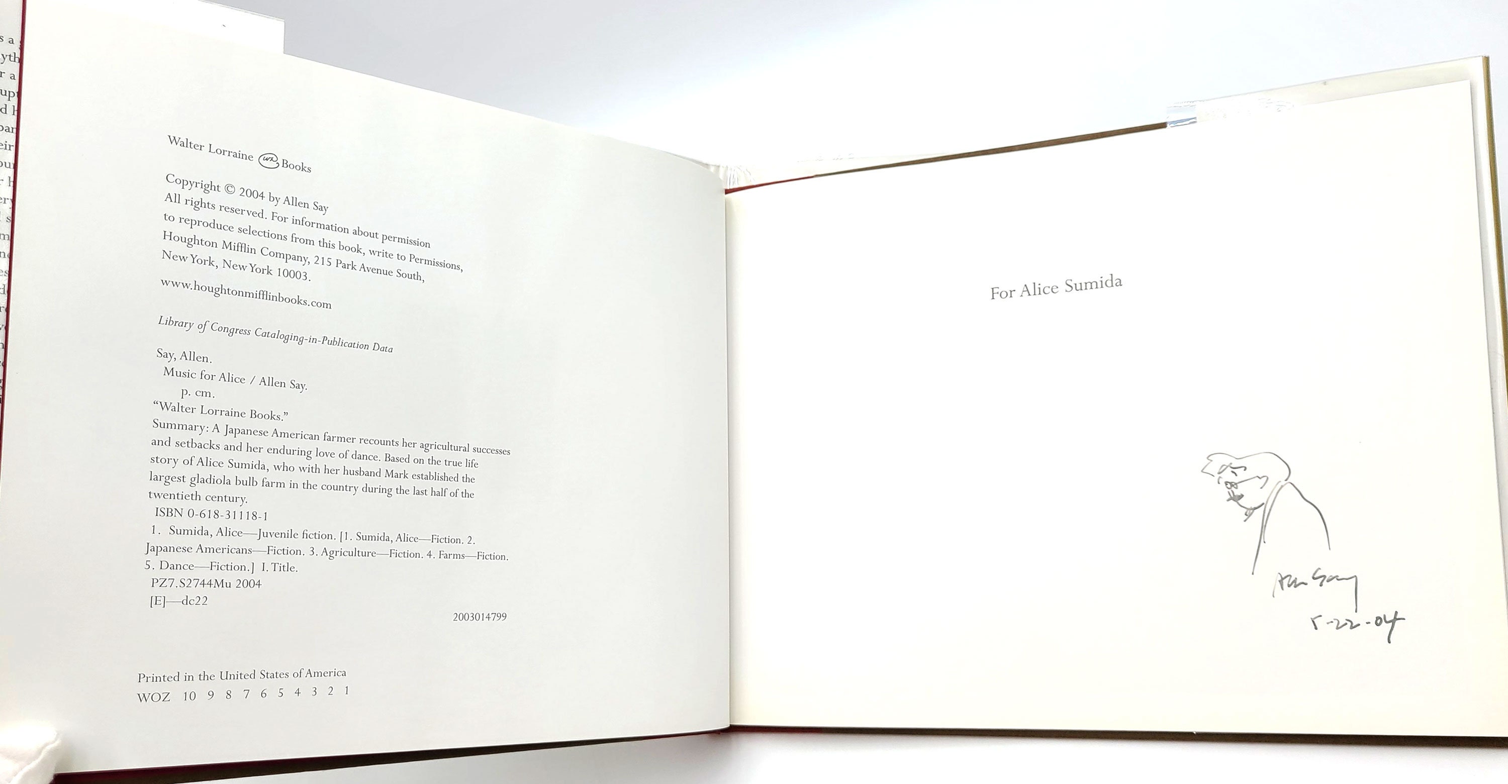 Description: Signed by Alice Sumida (the subject and dedicatee of the book) on the title page and inscribed by the author on the dedication page along with his hand-drawn self-portrait. First printing (with full number line). Bookplate on ffep, else clean and unmarked. Dust jacket not price clipped; in an archival mylar sleeve. 32 pages. 8.5 x 11 inches.