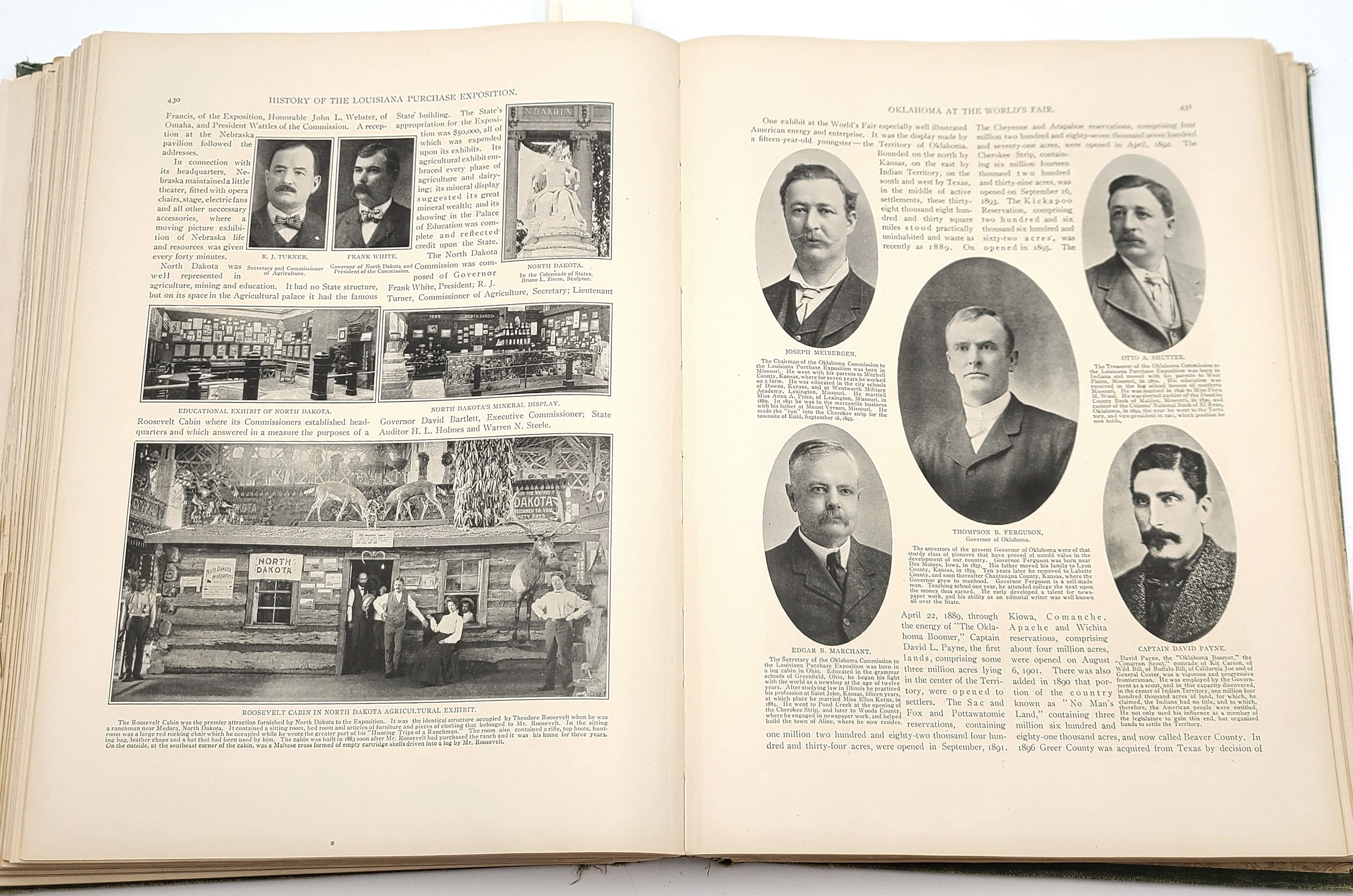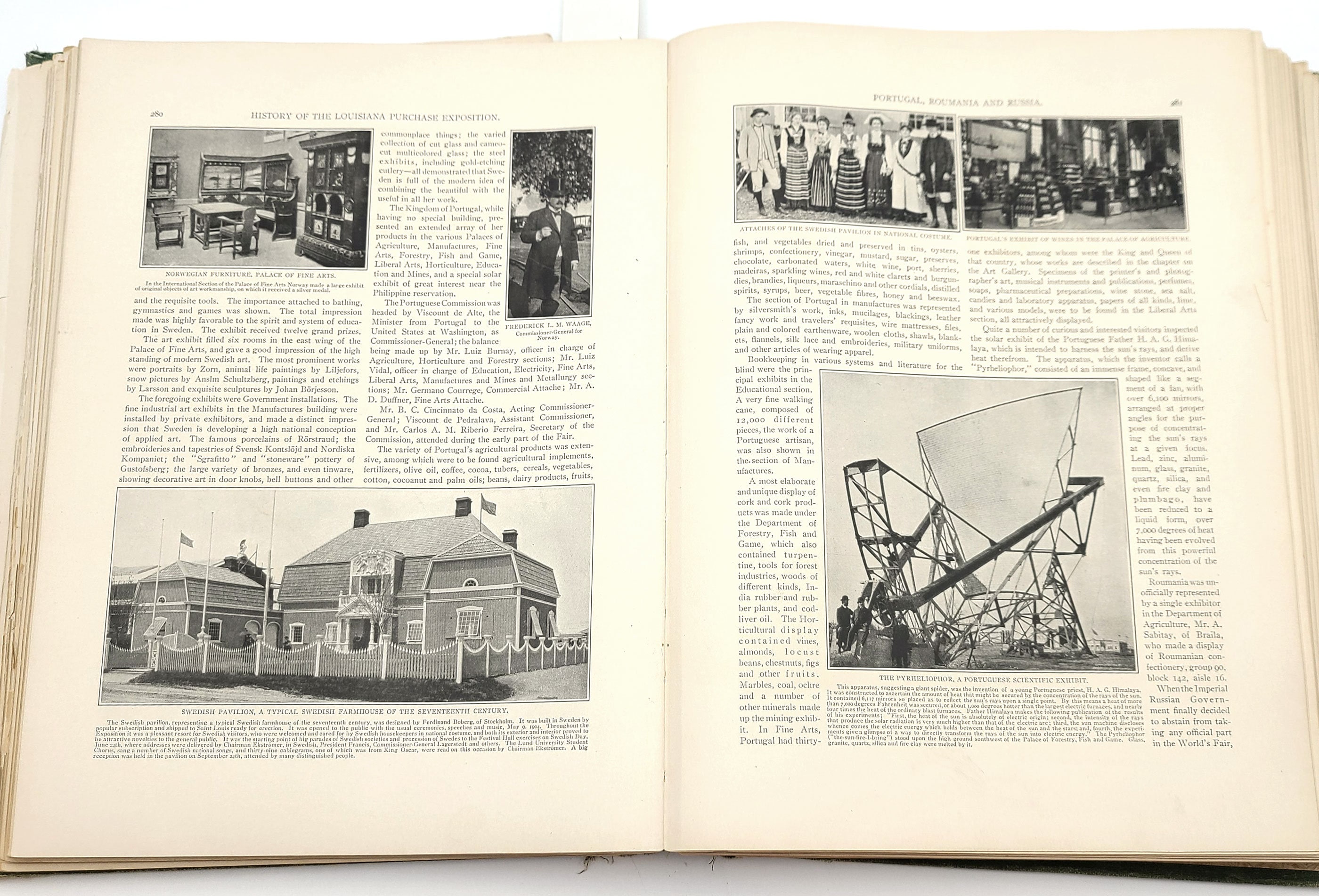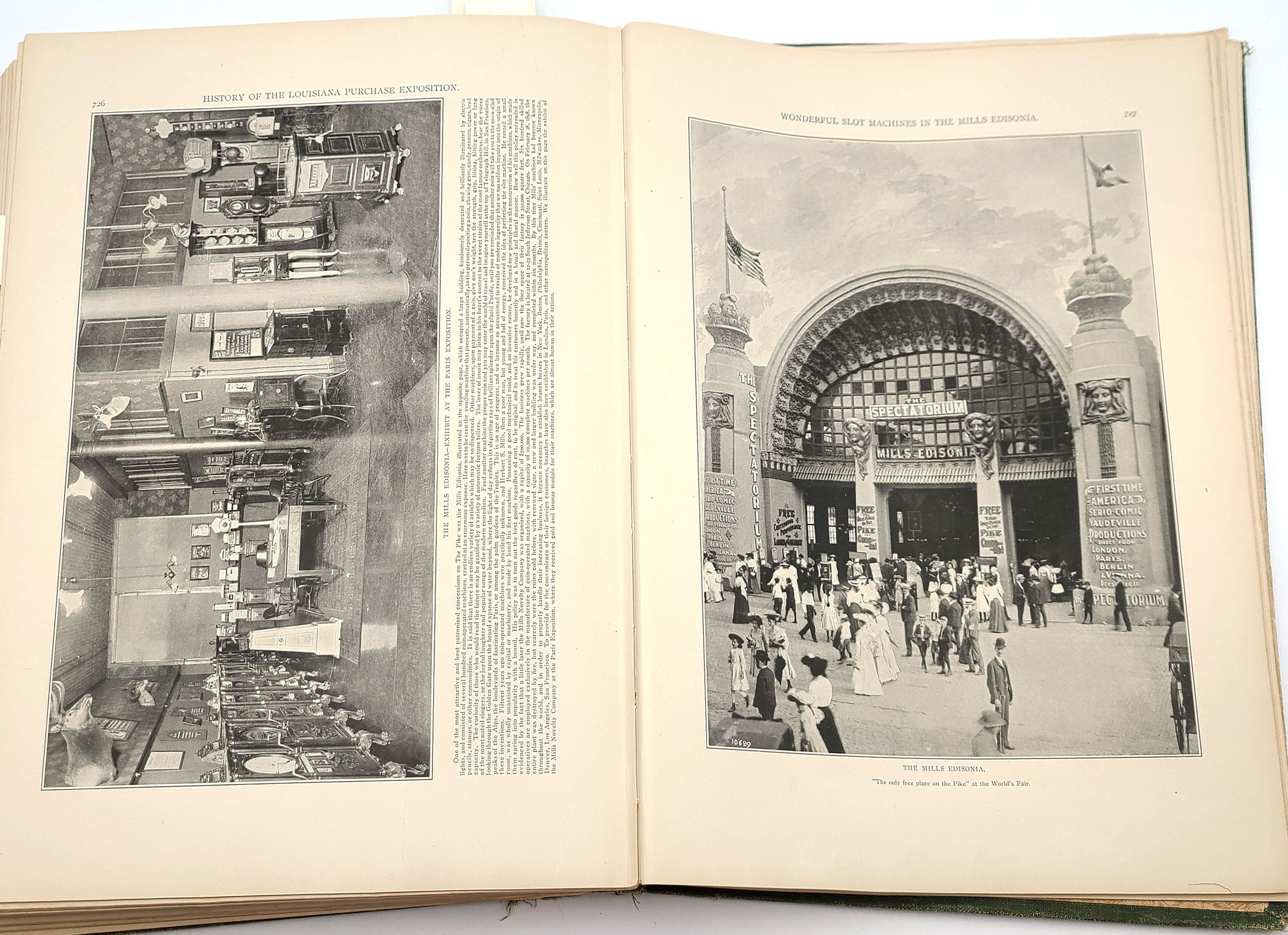 A massive tome, illustrated with over 4000 photographs from the Saint Louis World's Fair of 1904. Extensive descriptions of the planning and preparation for the exposition, comprehensive descriptions of the country and state exhibits and those presenting the world's cultural and scientific attainments, and an 80-page history of the Louisiana Purchase itself. The photos show the interiors and exteriors of many of the fair's pavilions, their various displays, and dignitaries from around the world.