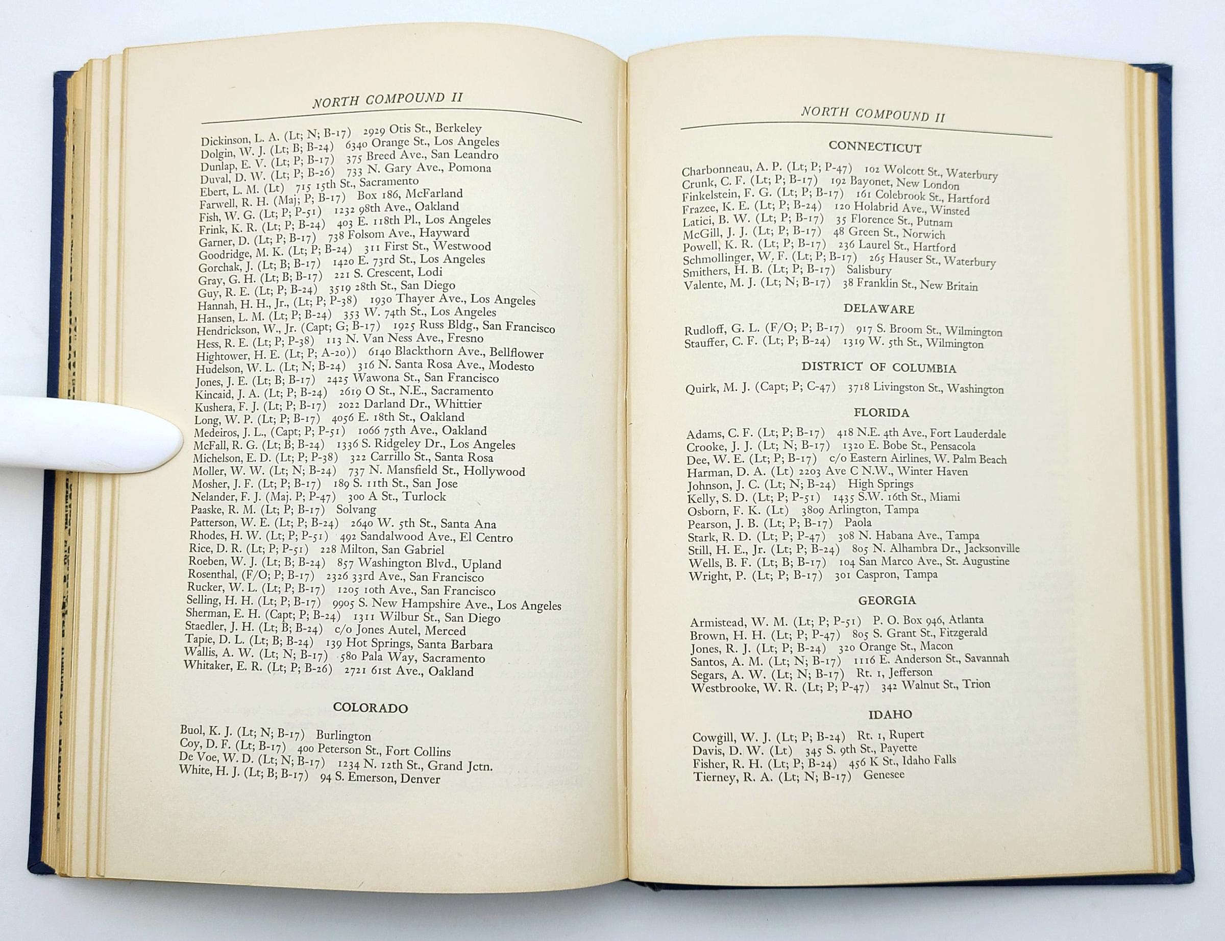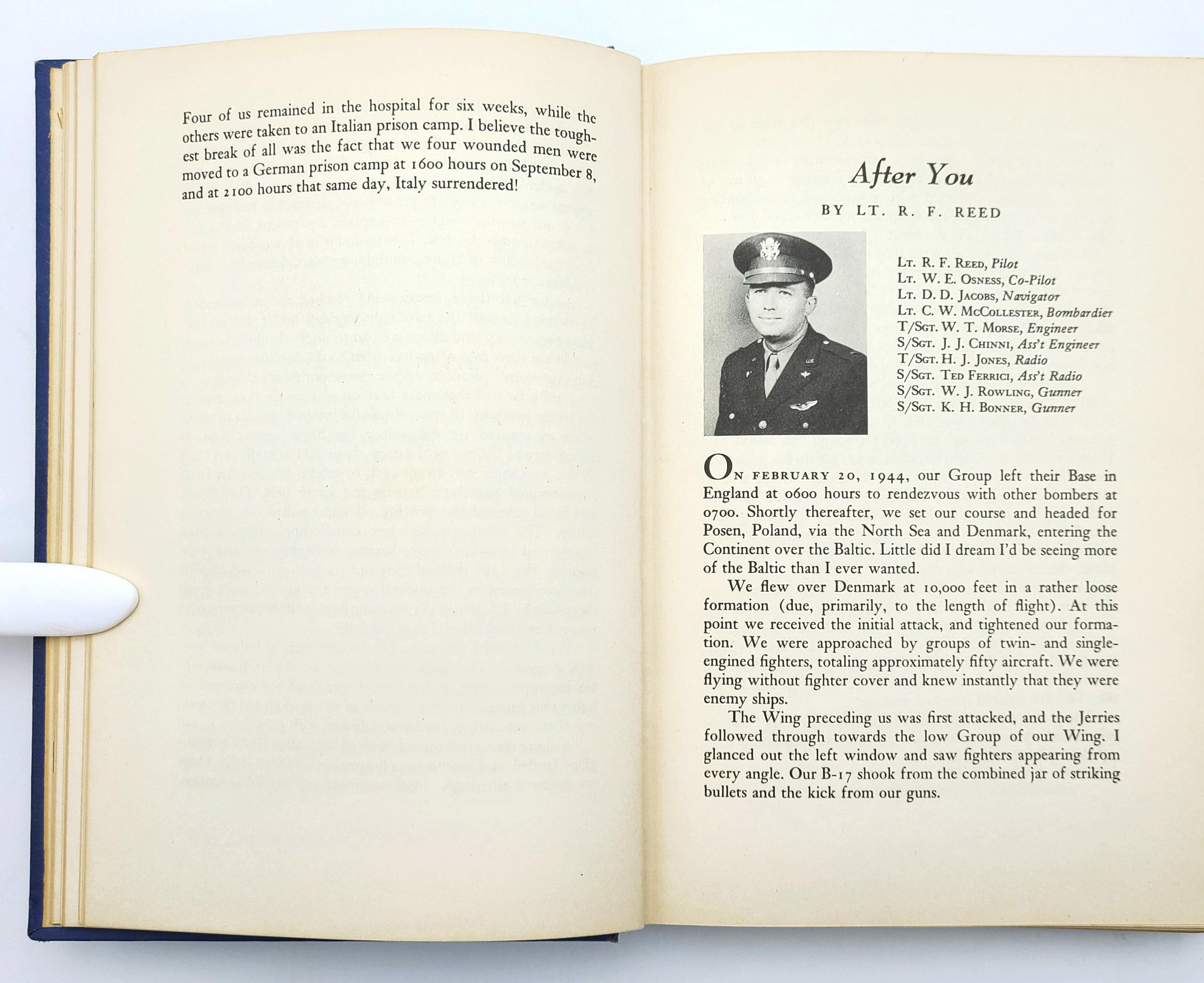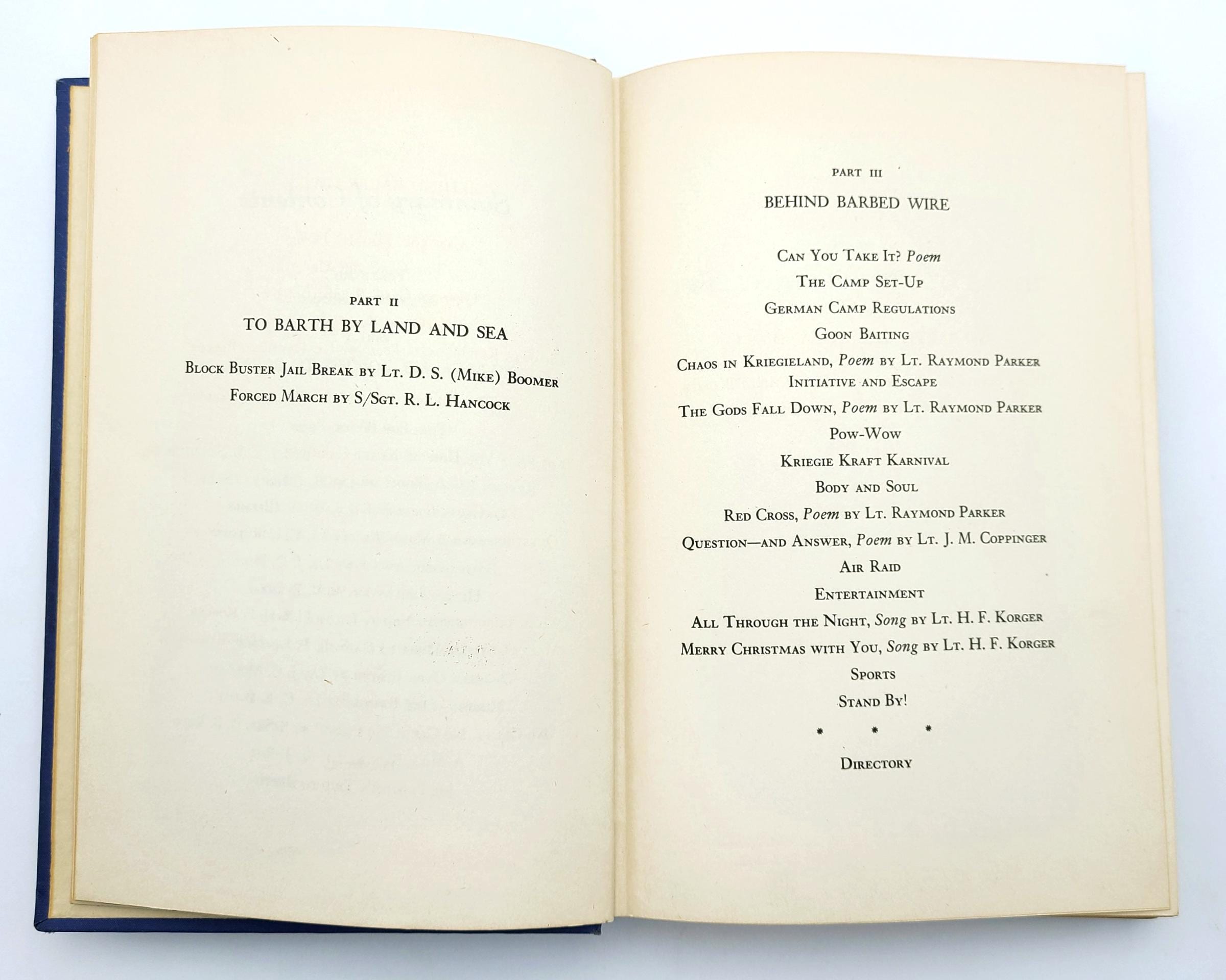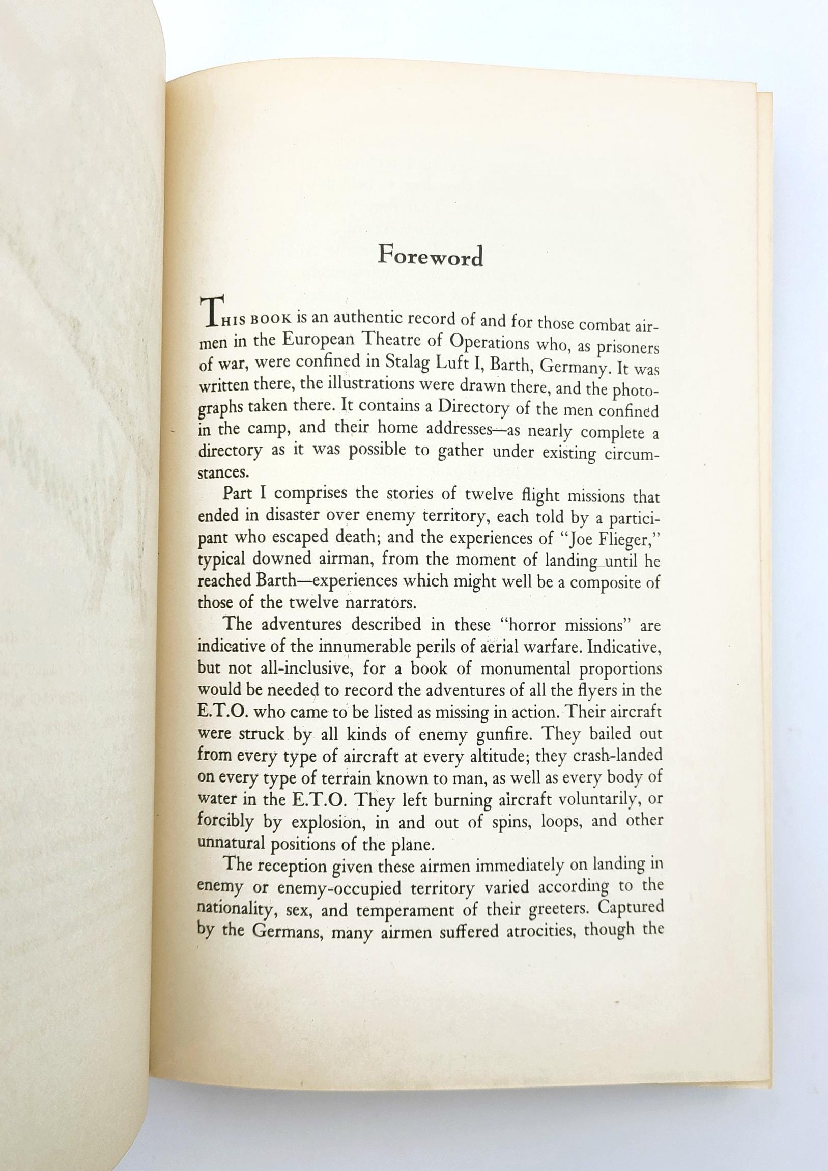 From the Foreword: "This book is an authentic record of and for those combat airmen in the European Theatre of Operations who, as prisoners of war, were confined in Stalag Luft I, Barth, Germany. It was written there, the illustrations were drawn there, and the photographs taken there. It contains a Directory of the men confined in the camp, and their home addresses -- as nearly complete a directory as it was possible to gather under existing circumstances.