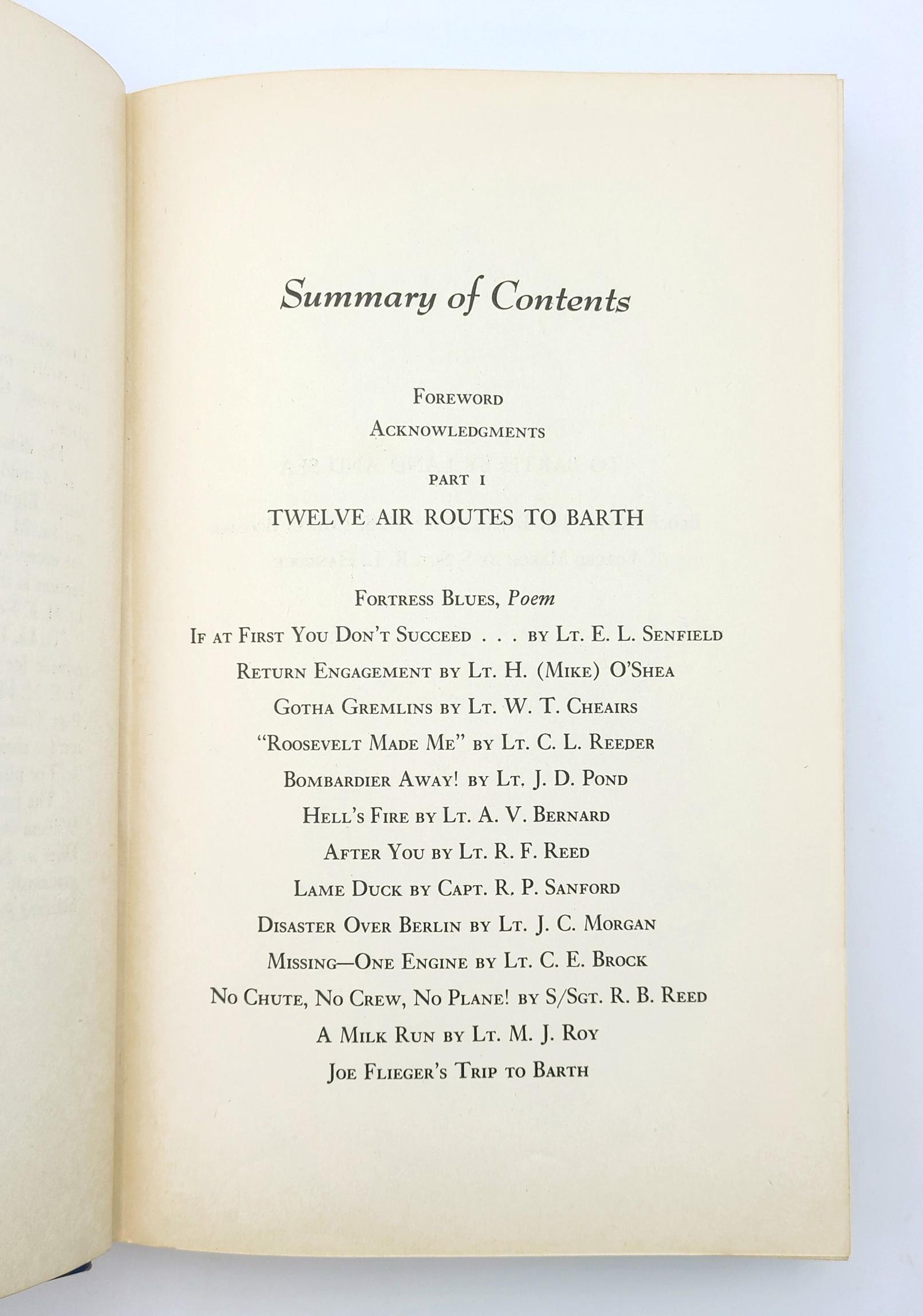 Part I comprises the stories of twelve flight missions that ended in disaster over enemy territory, each told by a participant who escaped death; and the experiences of ''Joe Flieger,'' typical downed airman, from the moment of landing until he reached Barth -- experiences which might well be a composite of those of the twelve narrators...