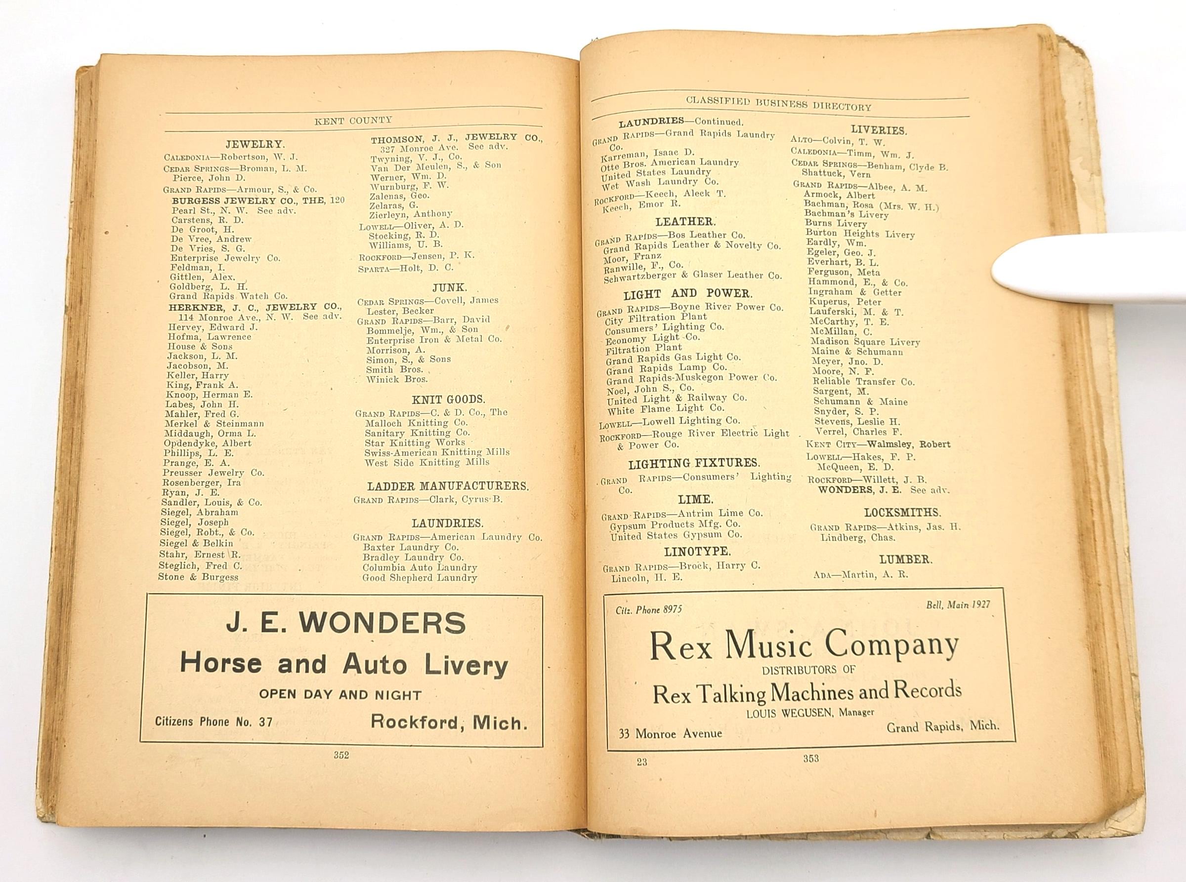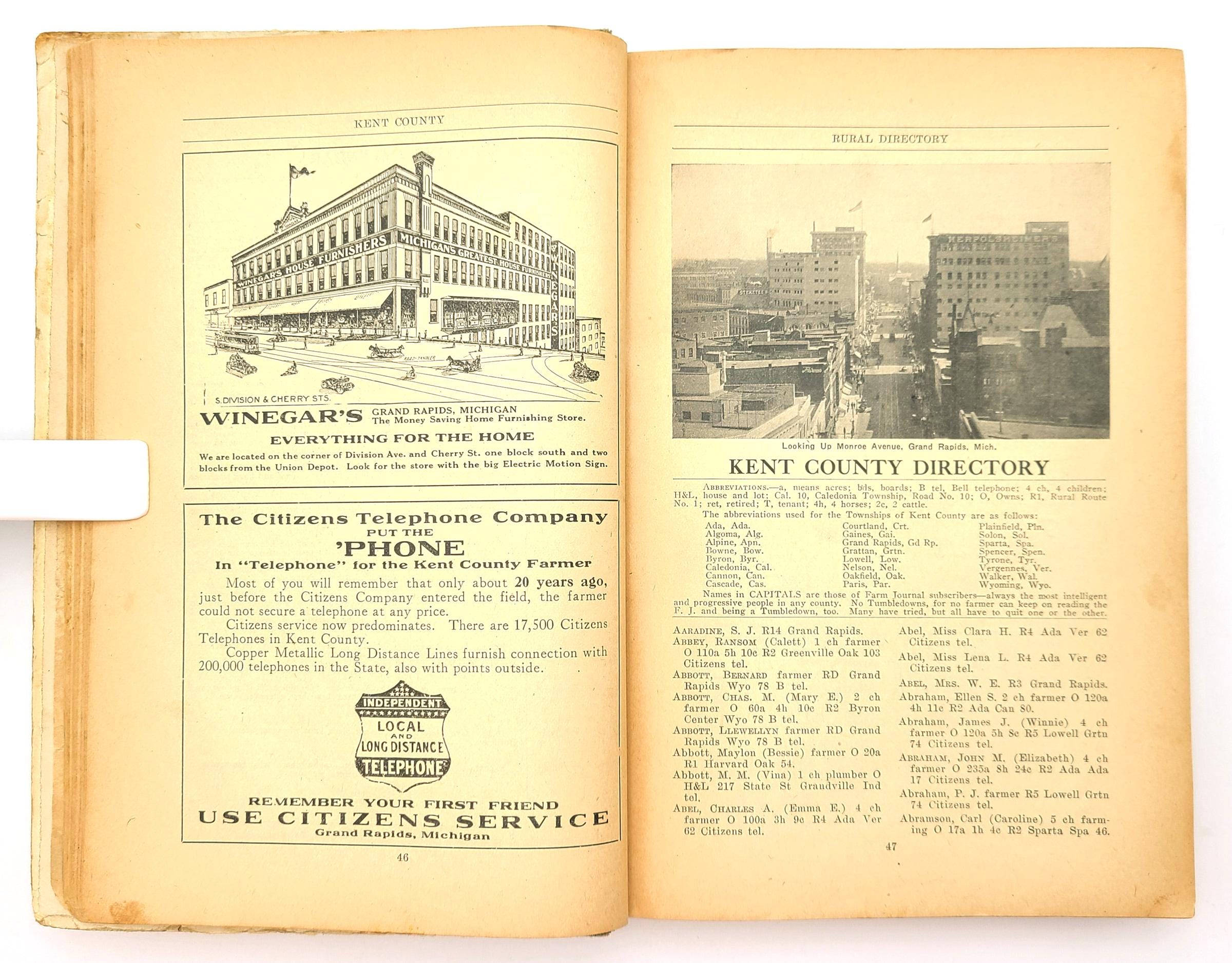 1917 rural directory for Kent County, Michigan. Residents are identified by name, typically identifying the name of spouse if married, the number of children, occupation, if they are owners, tenants or boarders, number of acres, number of horses and cattle, township, and rural mail route. A classified business directory is also included.