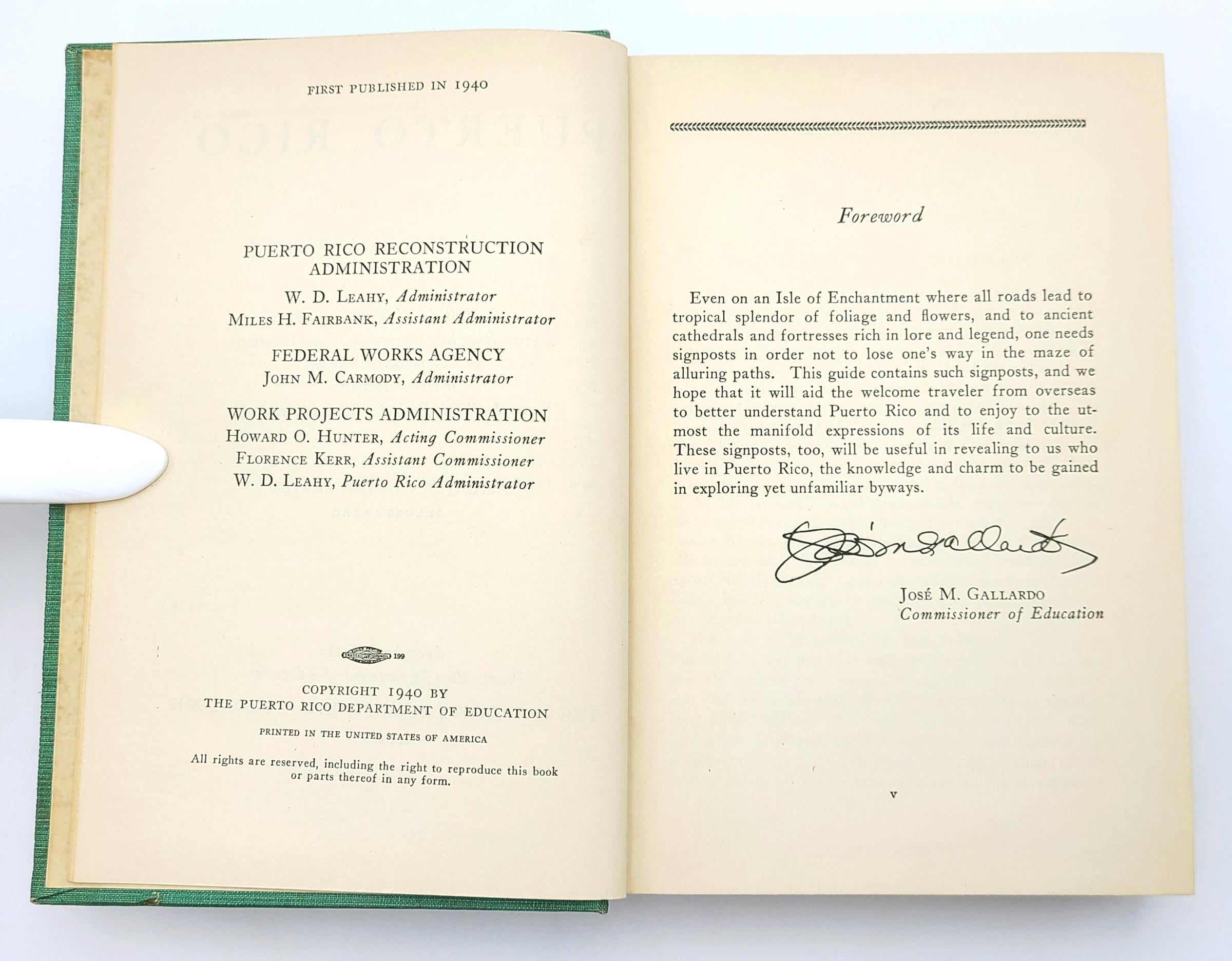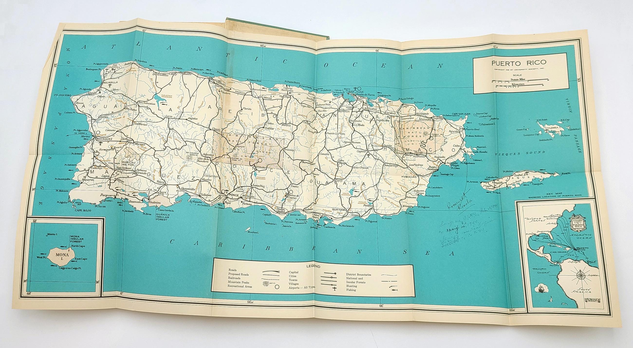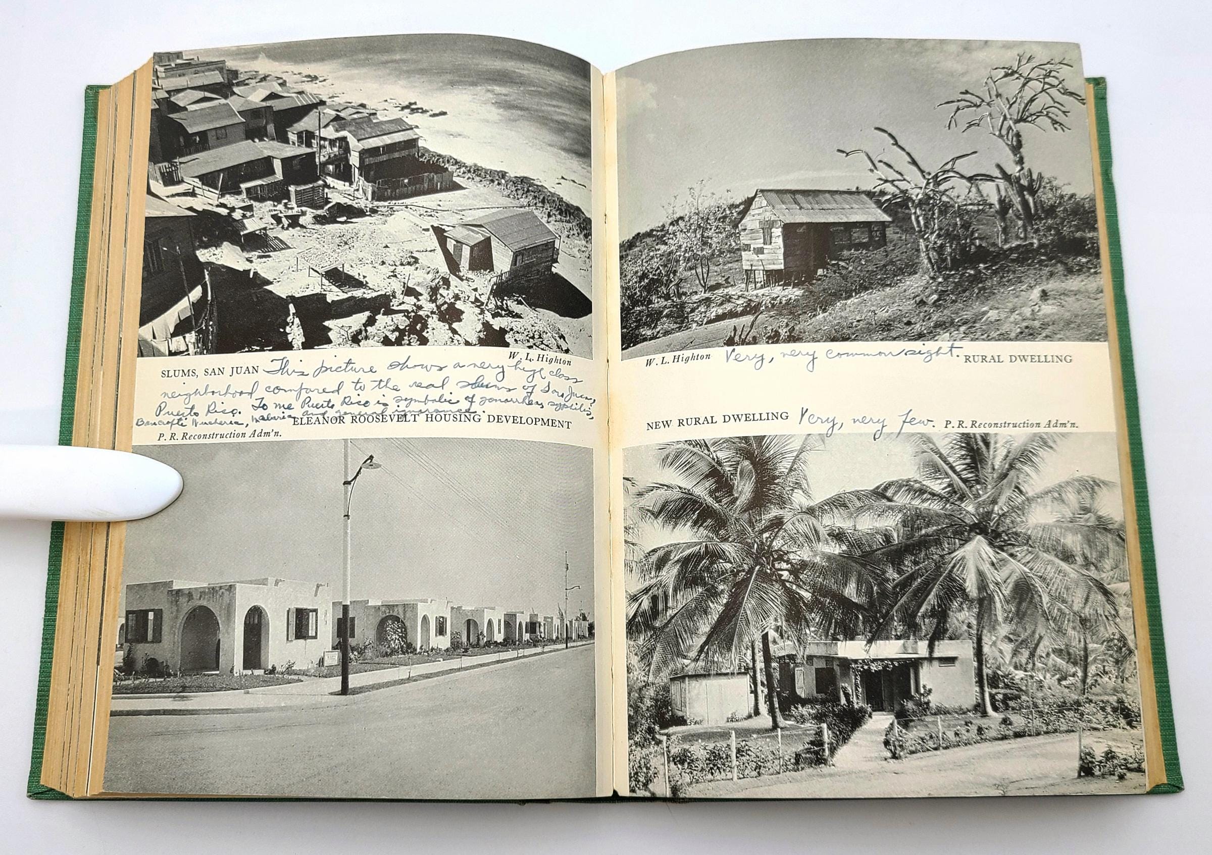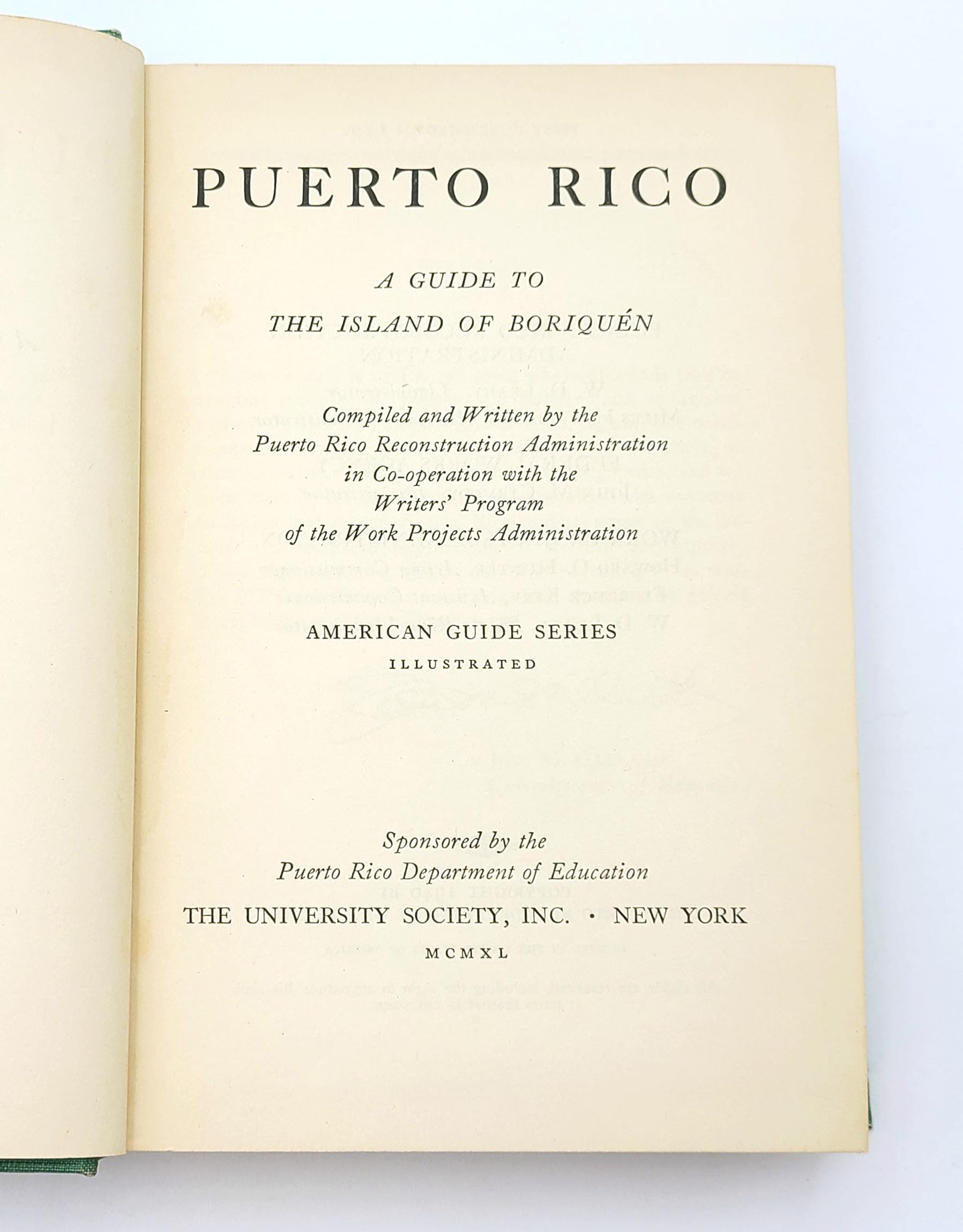 A first edition of the WPA guide for Puerto Rico, published as part of the with an interesting provenance. The book was purchased in September 1944 in San Juan by the U.S. Naval Reserve surgeon and Senior Medical Officer, Lennel Irwood Wright (1902-1961), who had been stationed at the Roosevelt Roads Naval Station at Ceiba between February and August of 1944. His marginalia, which appears on several of the photographic pages, and on about a dozen other pages, provide his personal insights, observations, and opinions about the island and its condition at that time (as well as his low opinion of the native population).