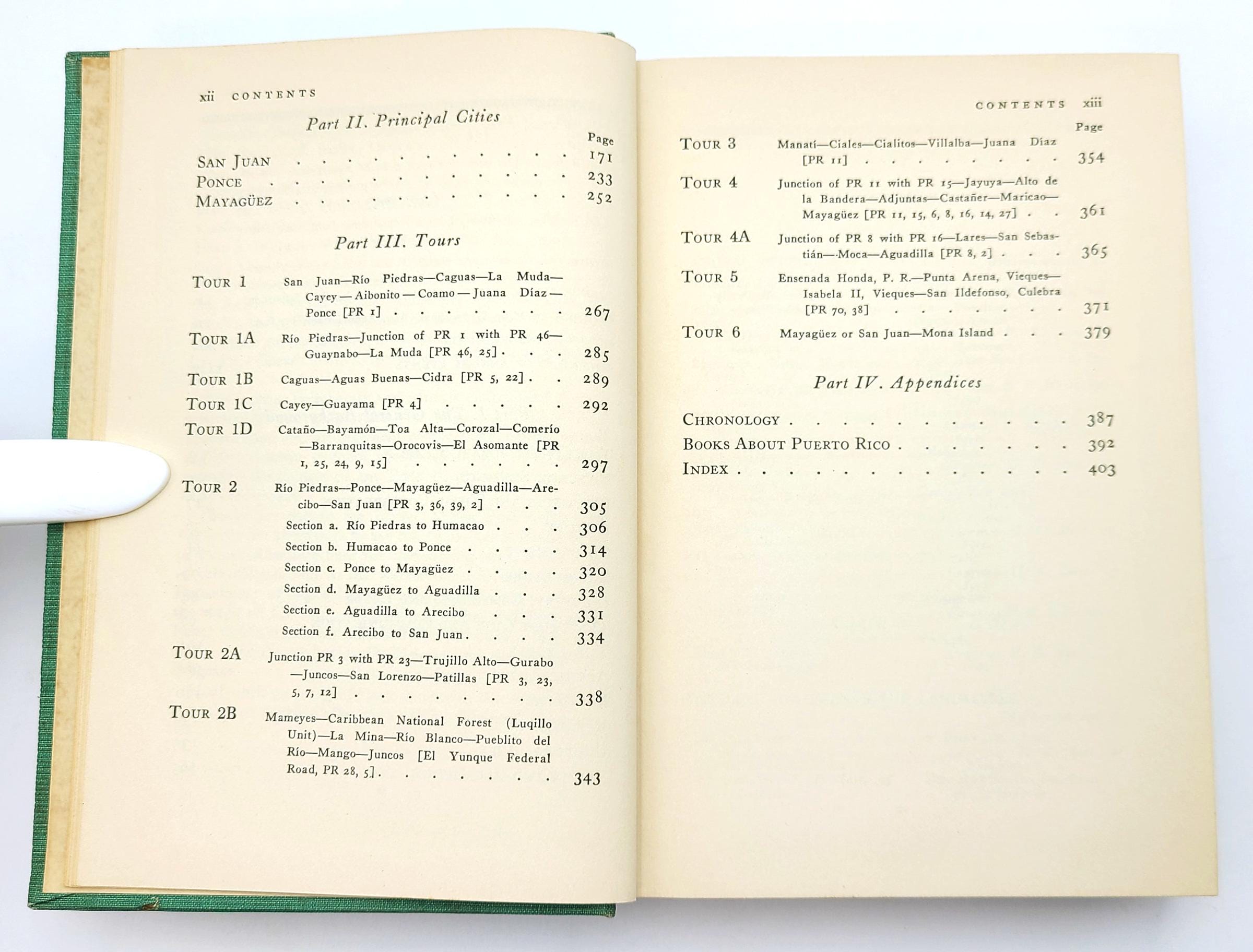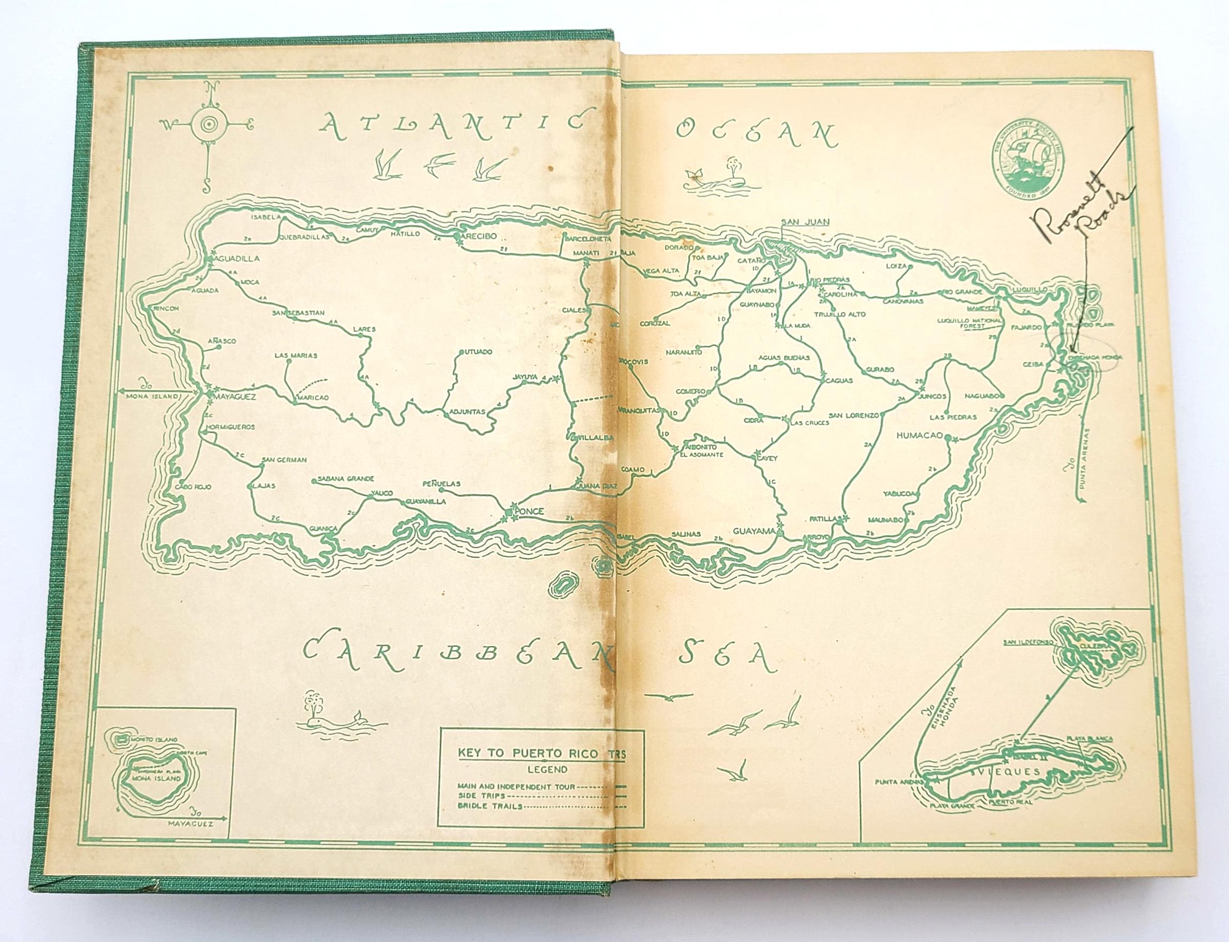 Description: First Edition, 1940. Green cloth boards pictorially stamped in dark green. Edges modestly rubbed; a couple shallow indentations on spine. Map endpapers. Some underlining and several pages with observational notes made by a U.S. Navy officer who had been stationed in P.R. for several months in 1944. Light staining on a dozen or so pages where plant matter had been laid in. 48 pages of photographs. Fold-out map at rear (some writing on it). xli + 409 pages.