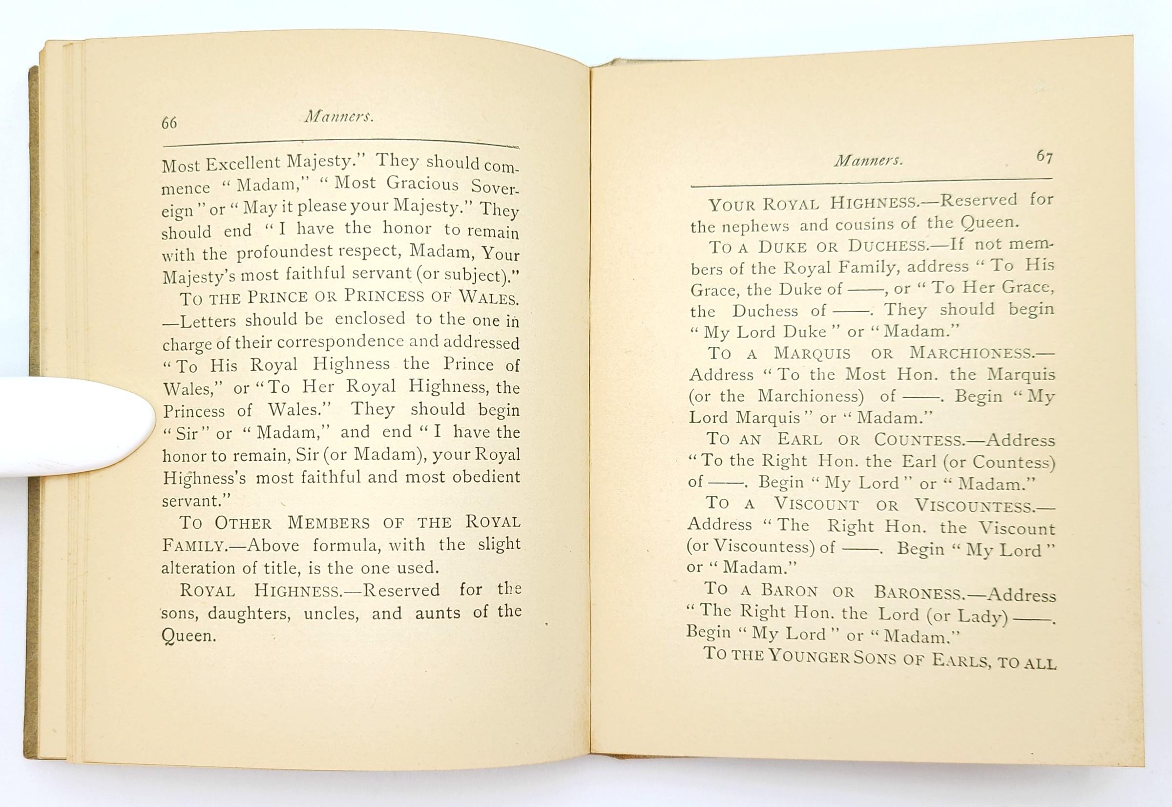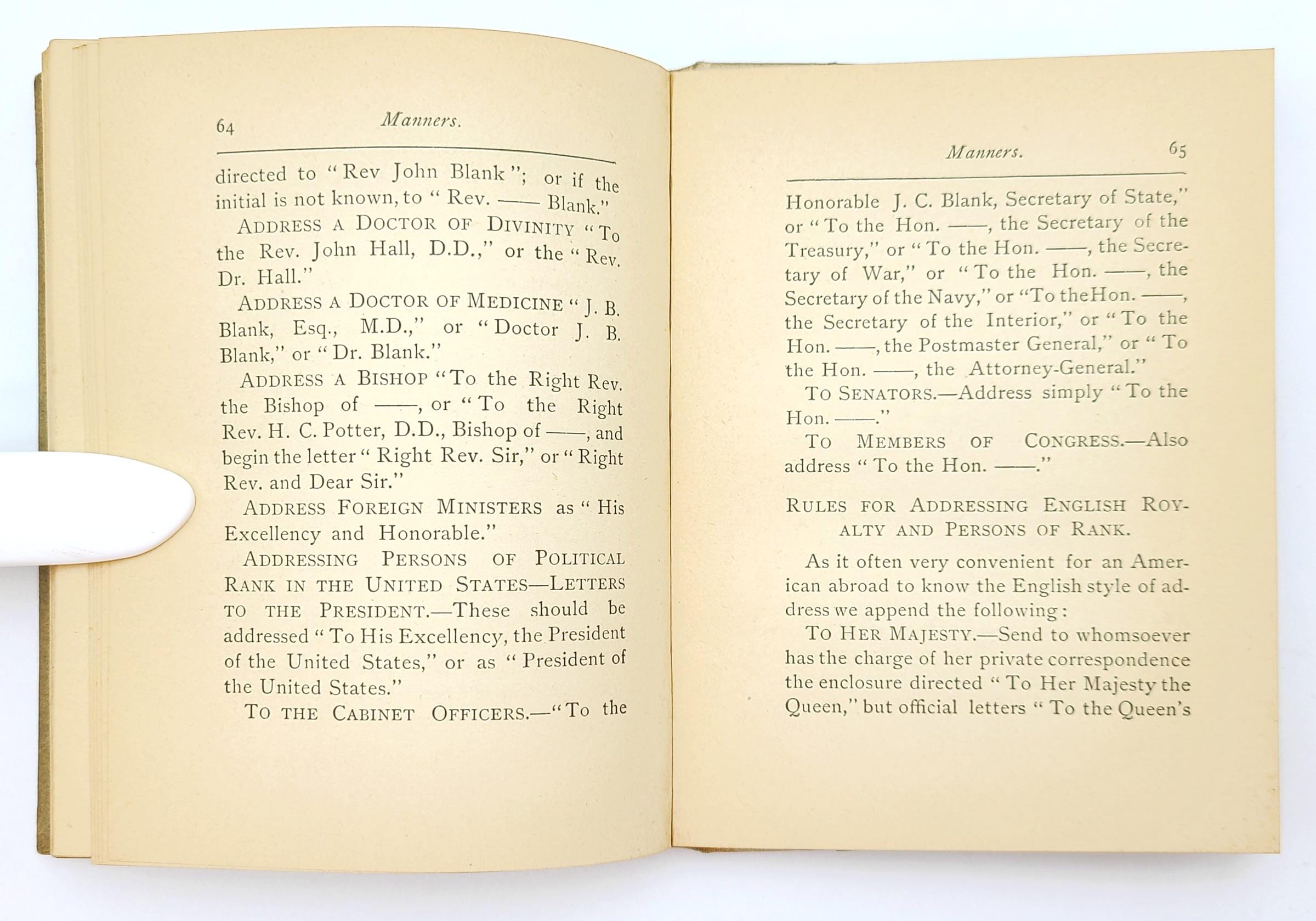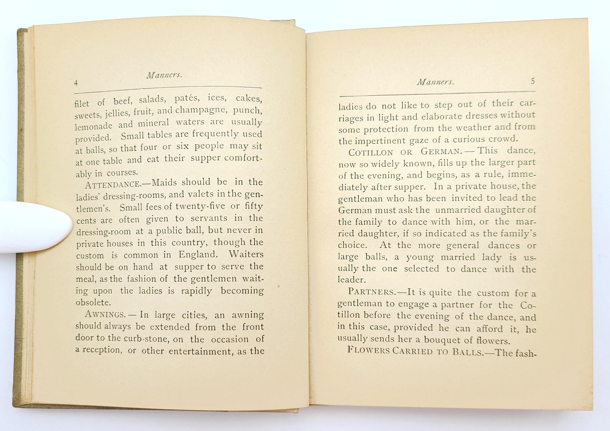 Although published anonymously, Manners was the work of Elisabeth Marbury (1856-1933), a prominent member of elite New York society and an influential theatrical and literary agent. She was one of the founding members of the Colony Club, the first women's social club in New York. Includes rules for etiquette in Washington, D.C. and in England when meeting with British royalty and nobility.
