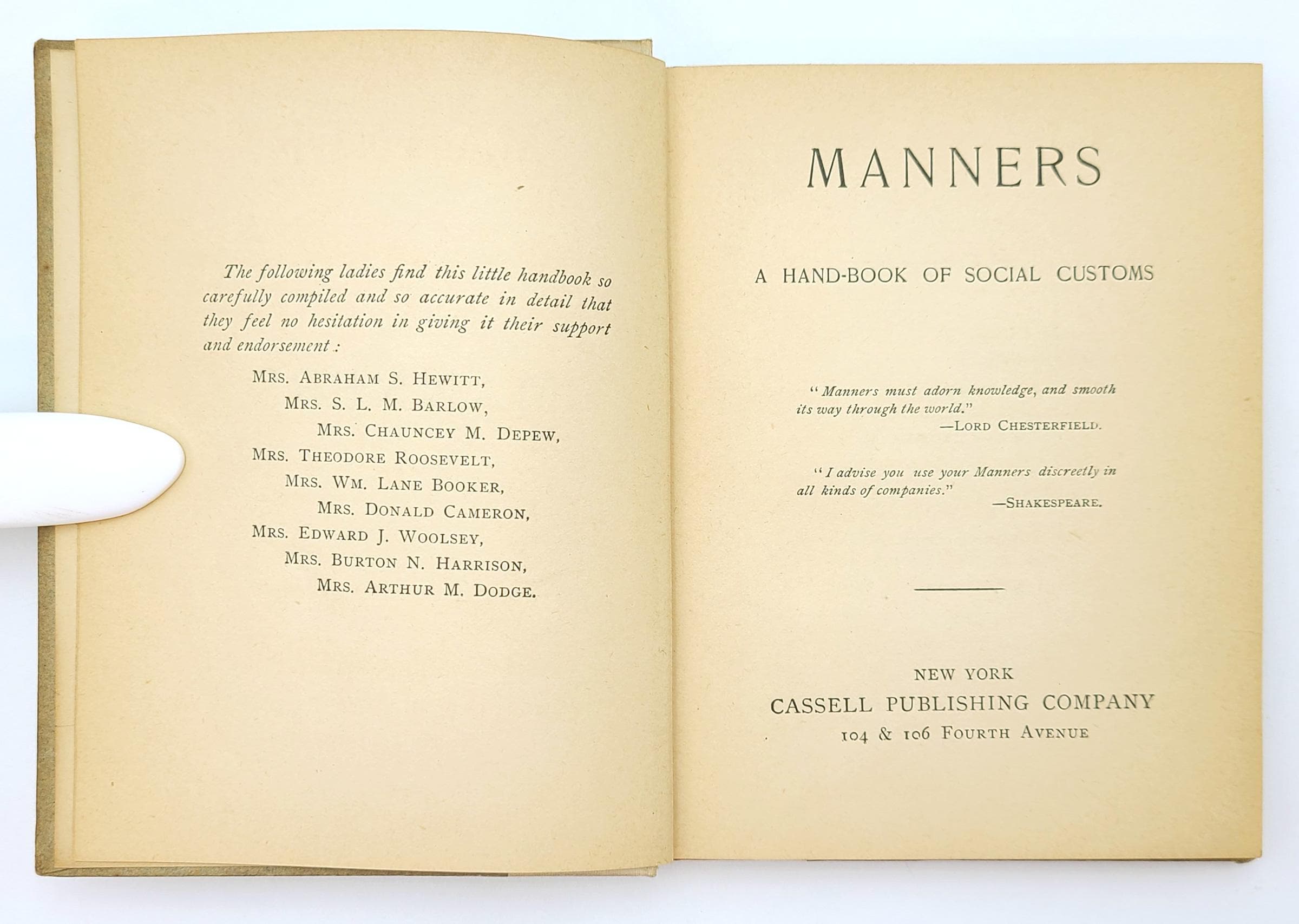 Facing the title page is a list of nine women who endorsed the book, including the wives of Abram Hewitt (then Mayor of New York), Theodore Roosevelt (former New York mayoral candidate and future U.S. president), Chauncey Depew (the Vanderbilt's railroad lawyer), William Lane Booker (British Consul General for New York), Burton N. Harrison (formerly private secretary to Jefferson Davis), and others.
