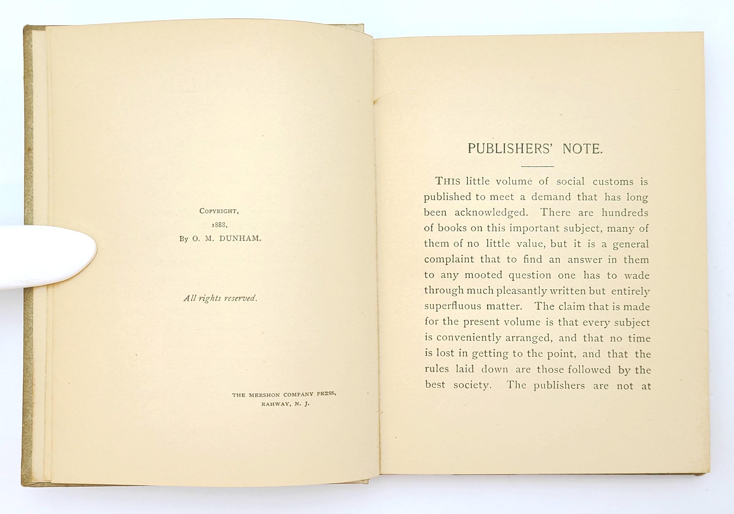 From the publisher's note: ''The claim that is made for the present volume is that every subject is conveniently arranged, and that no time is lost in getting to the point, and that the rules laid down are those followed by the best society. The publishers are not at liberty to mention the name of the writer, but they may say that she is a member of New York's most exclusive social circles, and that her name is a guarantee for the authoritative character of this handbook, which is not a mere compilation, but is written from the author's own experience as a woman of society and fashion.''