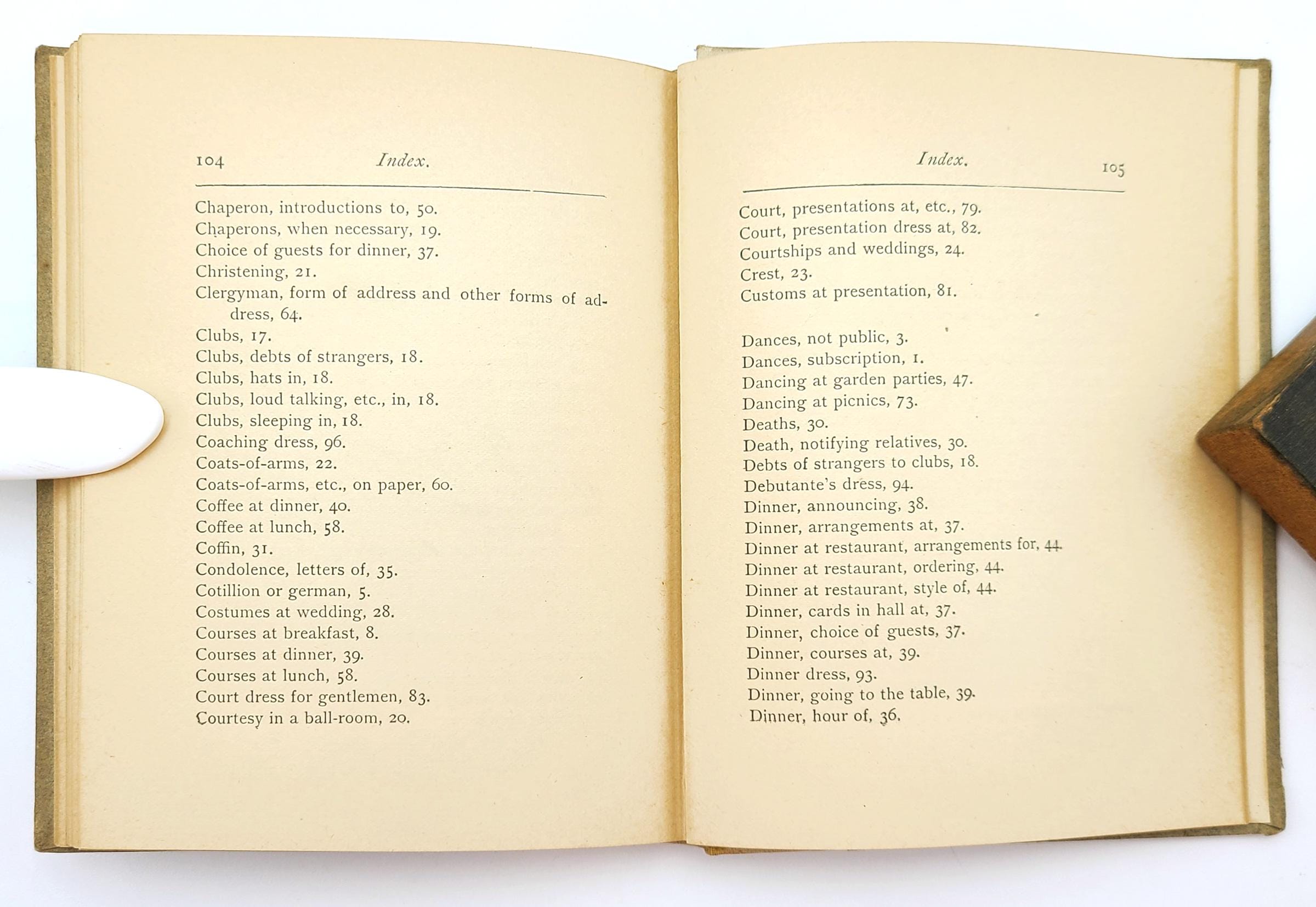 Topics covered include balls and evening parties, breakfast, cards, calls or visits, carriages, clubs, chaperons, christenings, coats-of-arms, courtships and weddings, death and funerals, dinners, dinners at restaurants, flowers, garden or lawn parties, introduction, invitations, lunch, letter writing, letters of introduction, new year's day, out-of-doors sports, picnics, etiquette and precedence in Washington, precedence in England, presentation at court in England, private theatricals, receptions, suppers, teas, theatre parties, toilet for ladies, toilet for men, and visiting country houses.