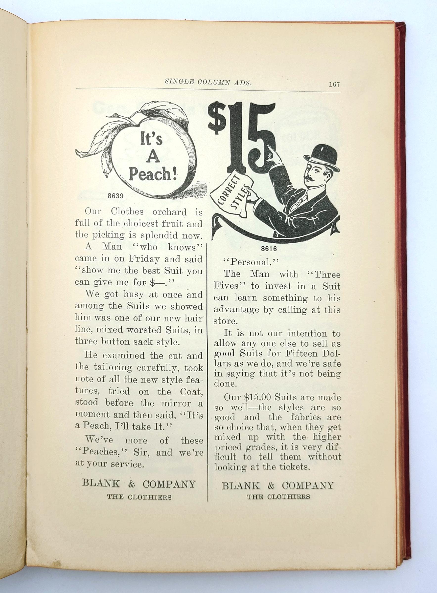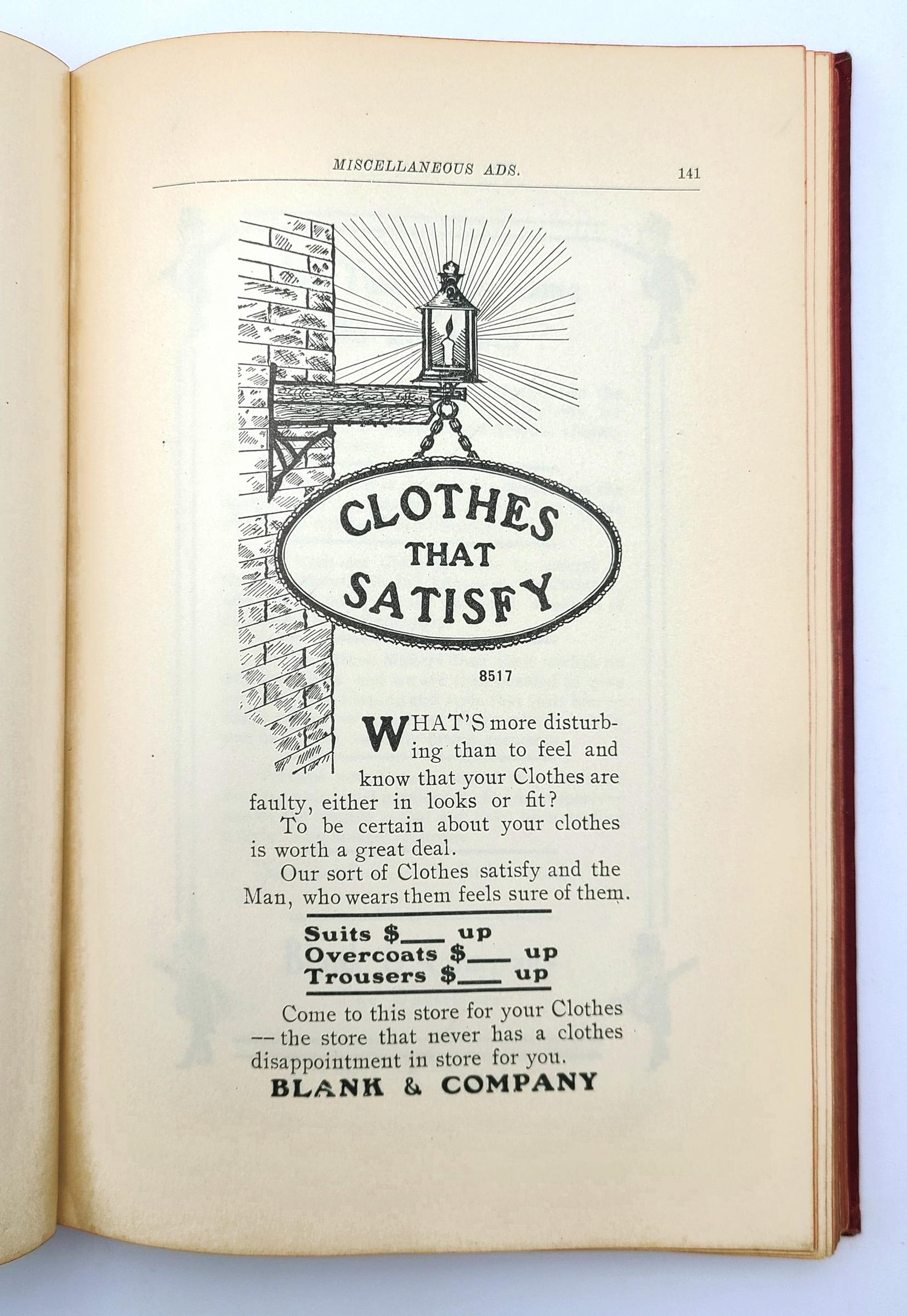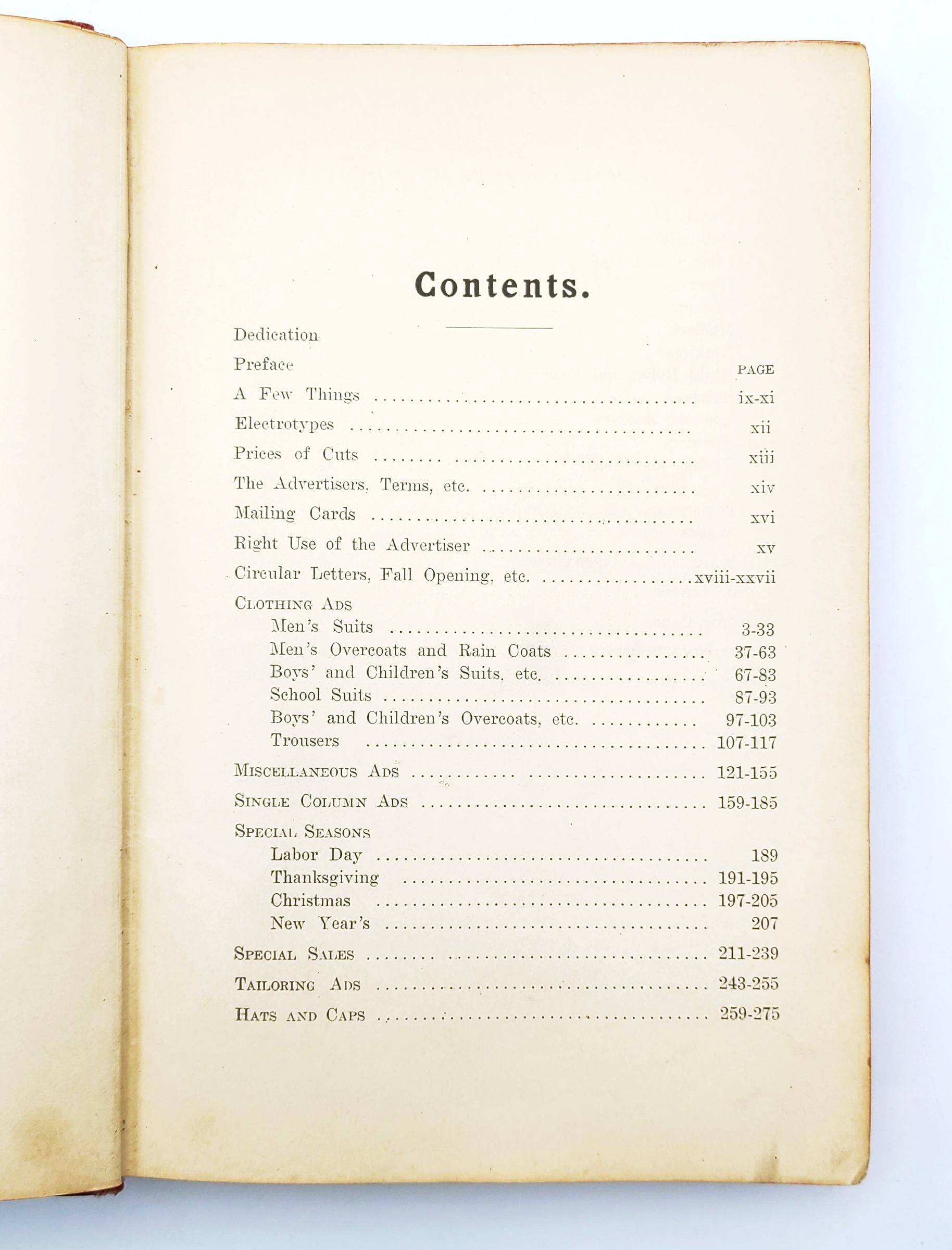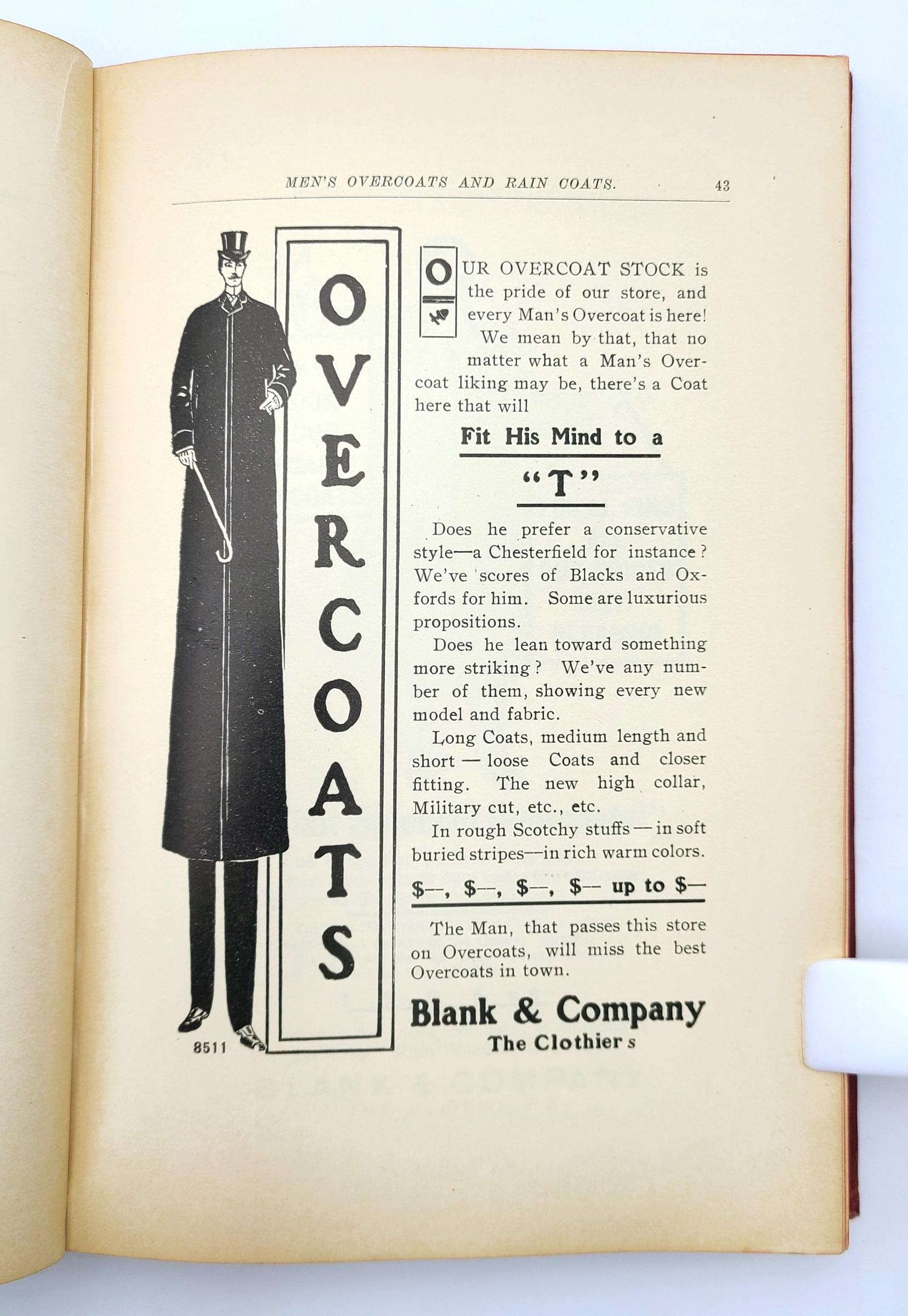 The illustrated advertisements are for men's suits, men's overcoats and rain coats, boys' and children's suits, school suits, boys' and children's overcoats, hats and caps, and haberdashery (bath robes, gloves, collars & cuffs, hosiery, mufflers, neckwear, night robes & pajamas, shirts, smoking jackets, sweaters, trunks & bags, umbrellas, underwear, waists). The volume also provides examples of circular letters, window cards, catch phrases, and suggestions for advertising schemes.