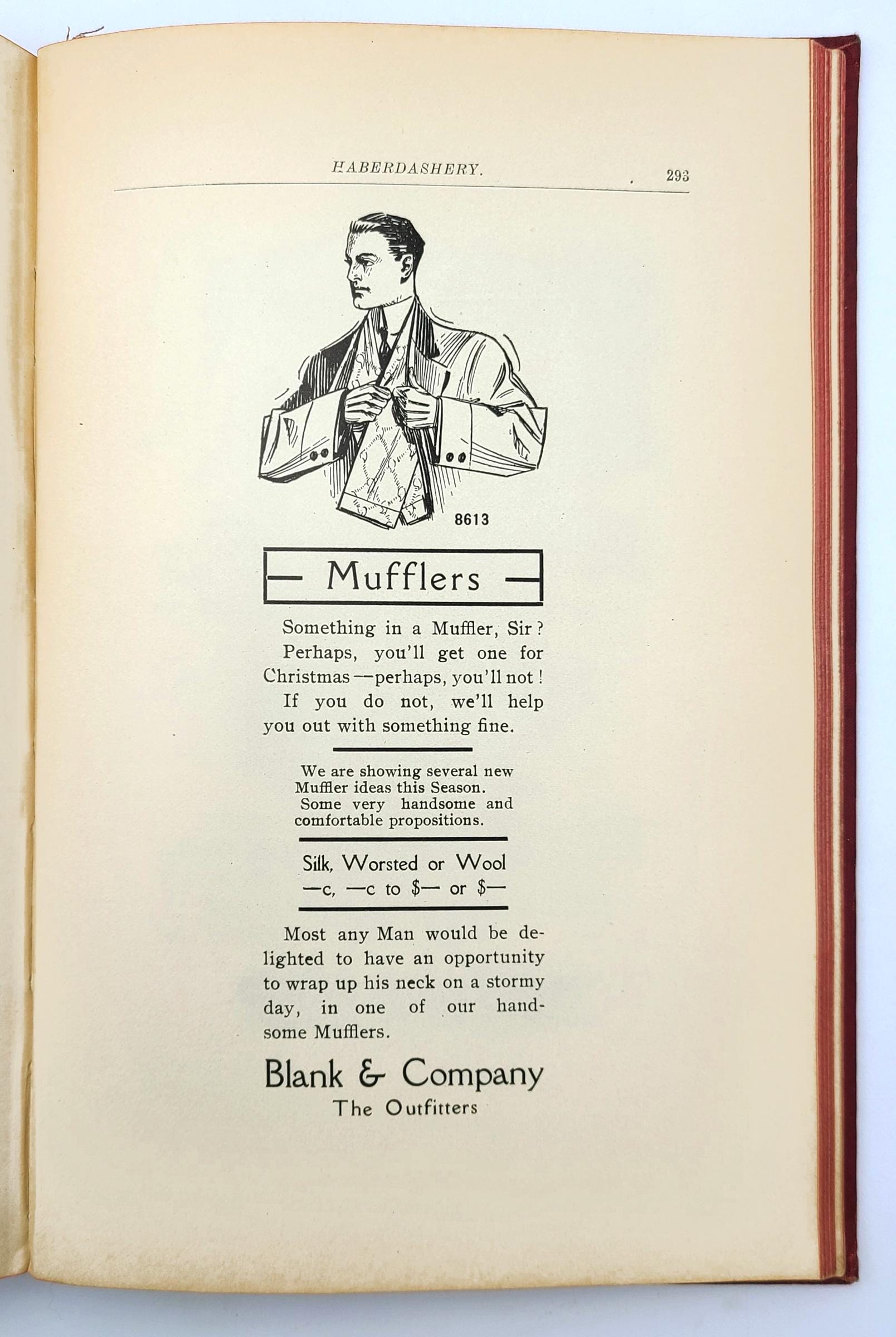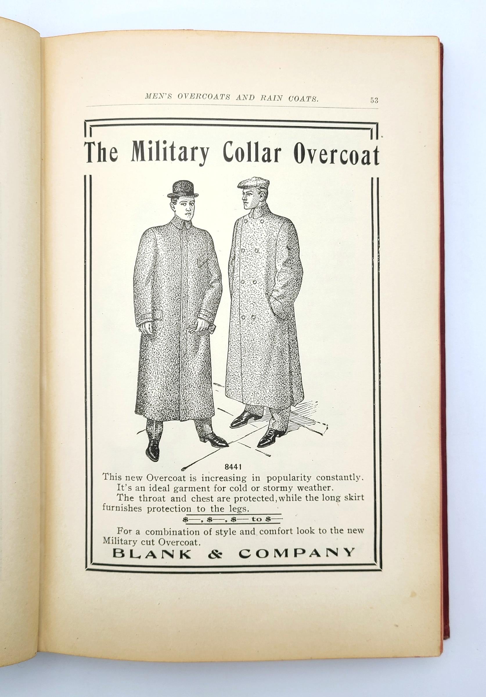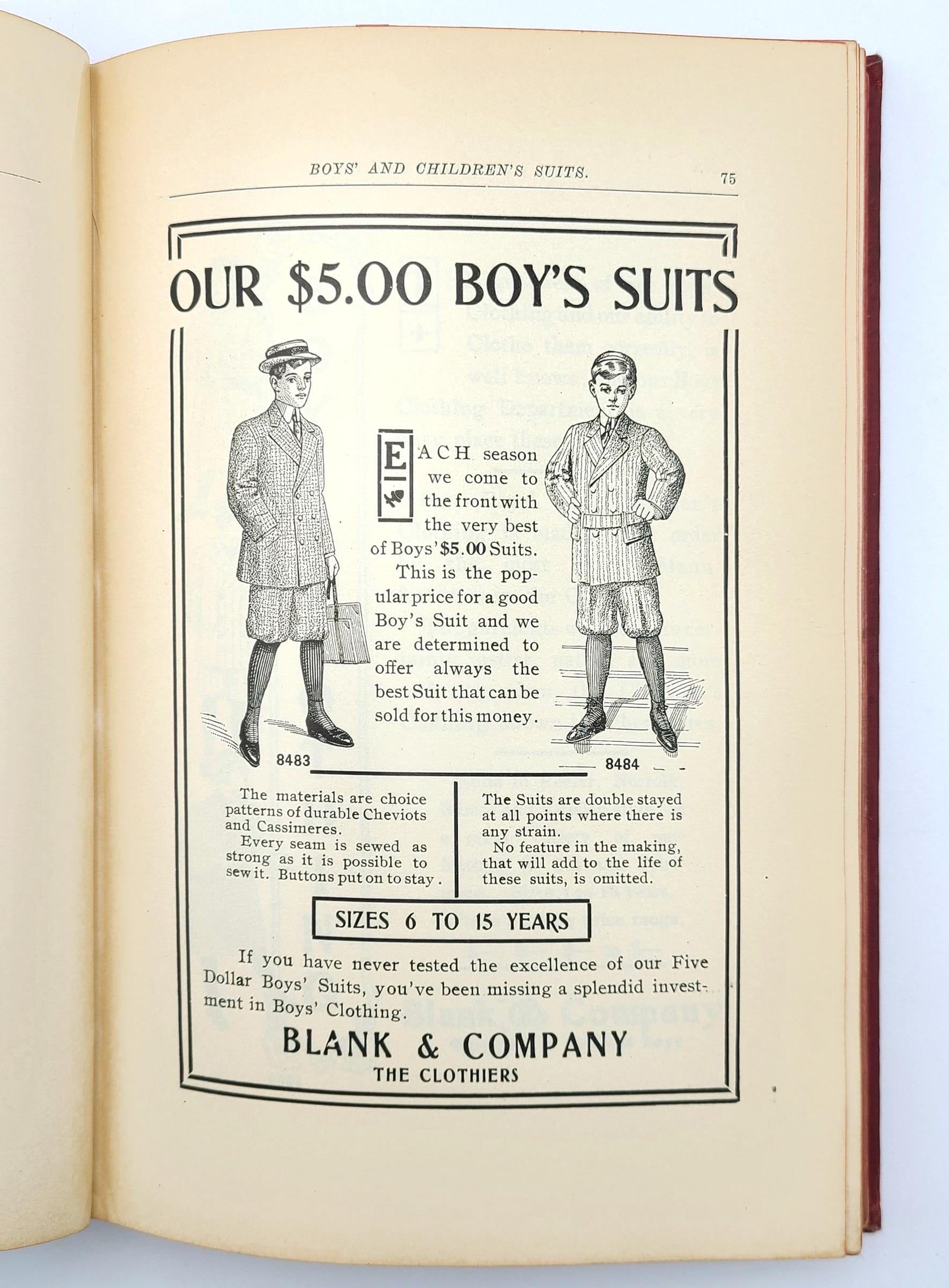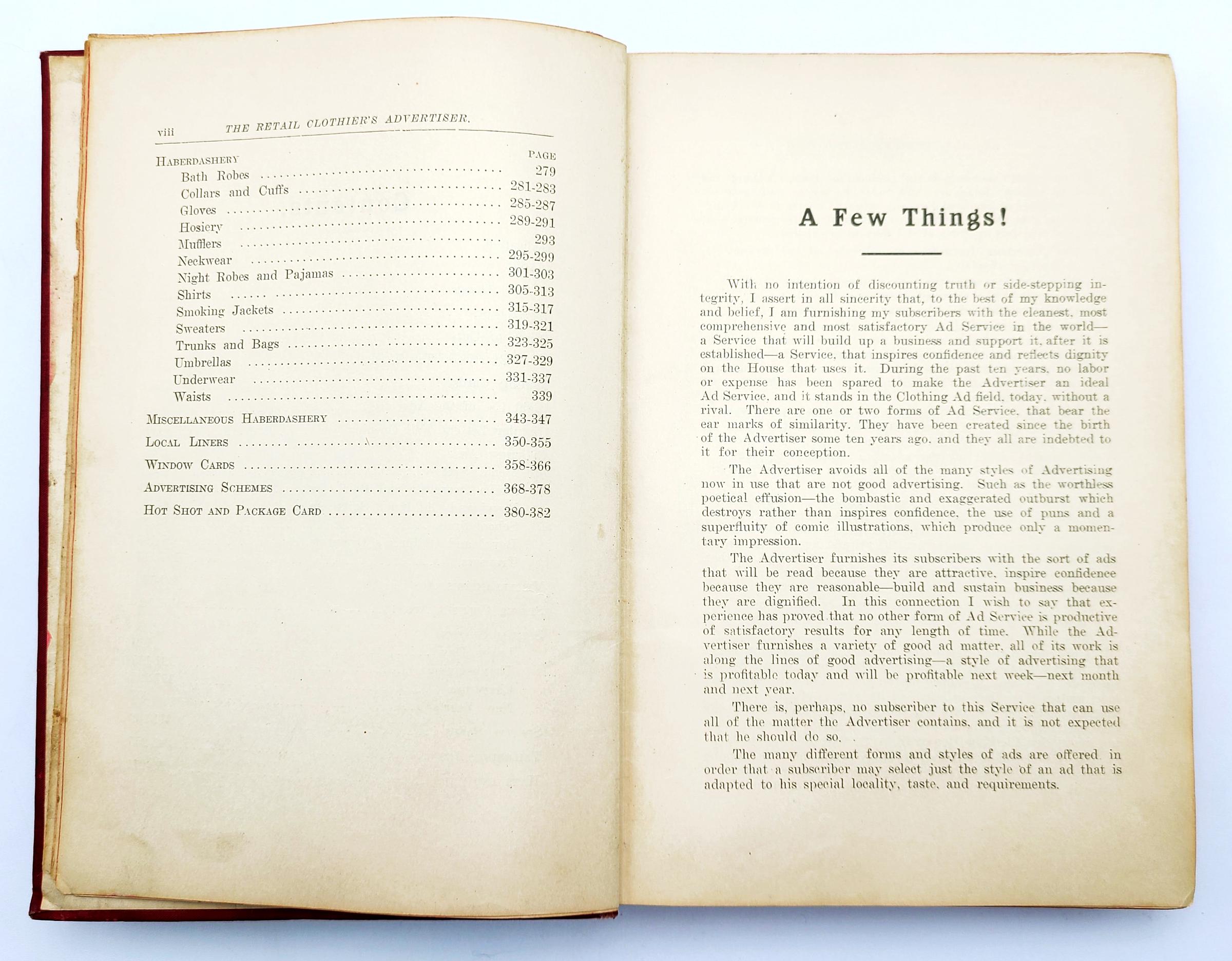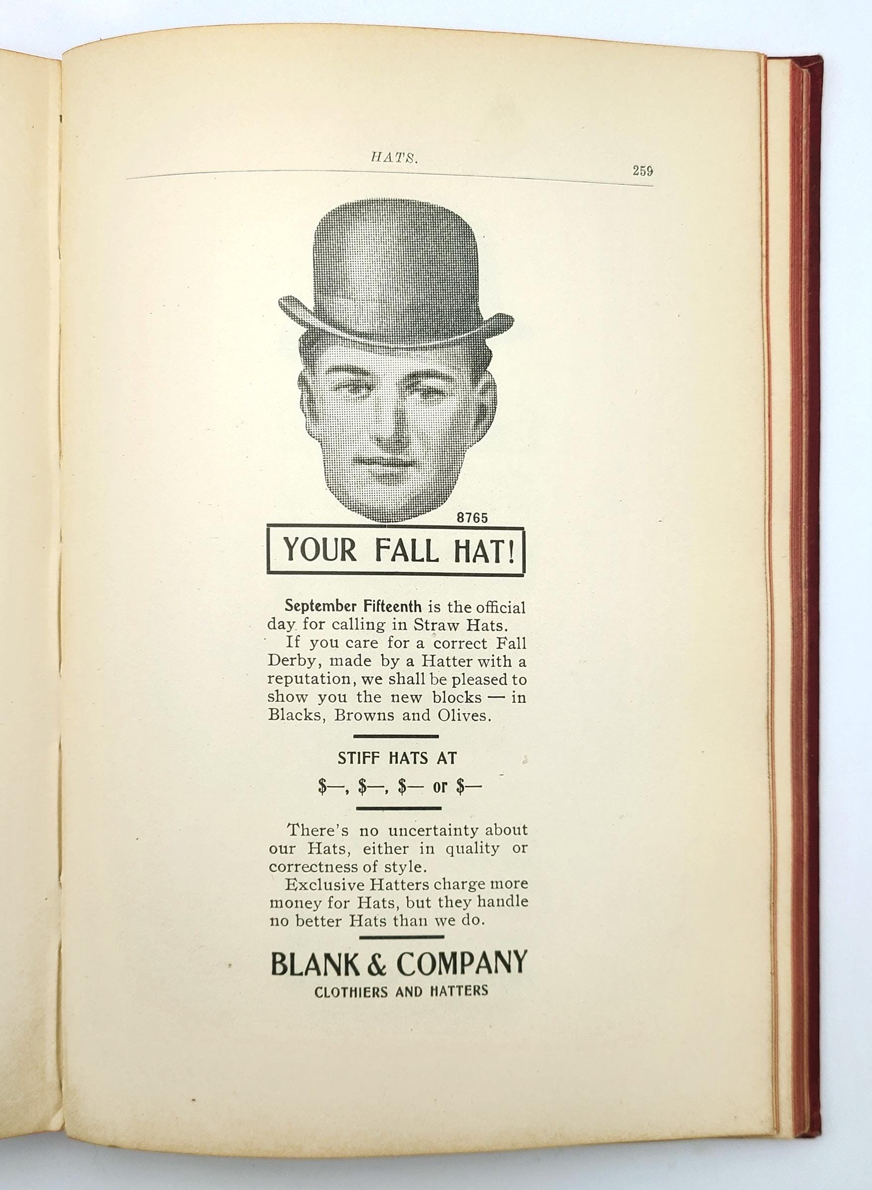 The illustrated advertisements are for men's suits, men's overcoats and rain coats, boys' and children's suits, school suits, boys' and children's overcoats, hats and caps, and haberdashery (bath robes, gloves, collars & cuffs, hosiery, mufflers, neckwear, night robes & pajamas, shirts, smoking jackets, sweaters, trunks & bags, umbrellas, underwear, waists). The volume also provides examples of circular letters, window cards, catch phrases, and suggestions for advertising schemes.