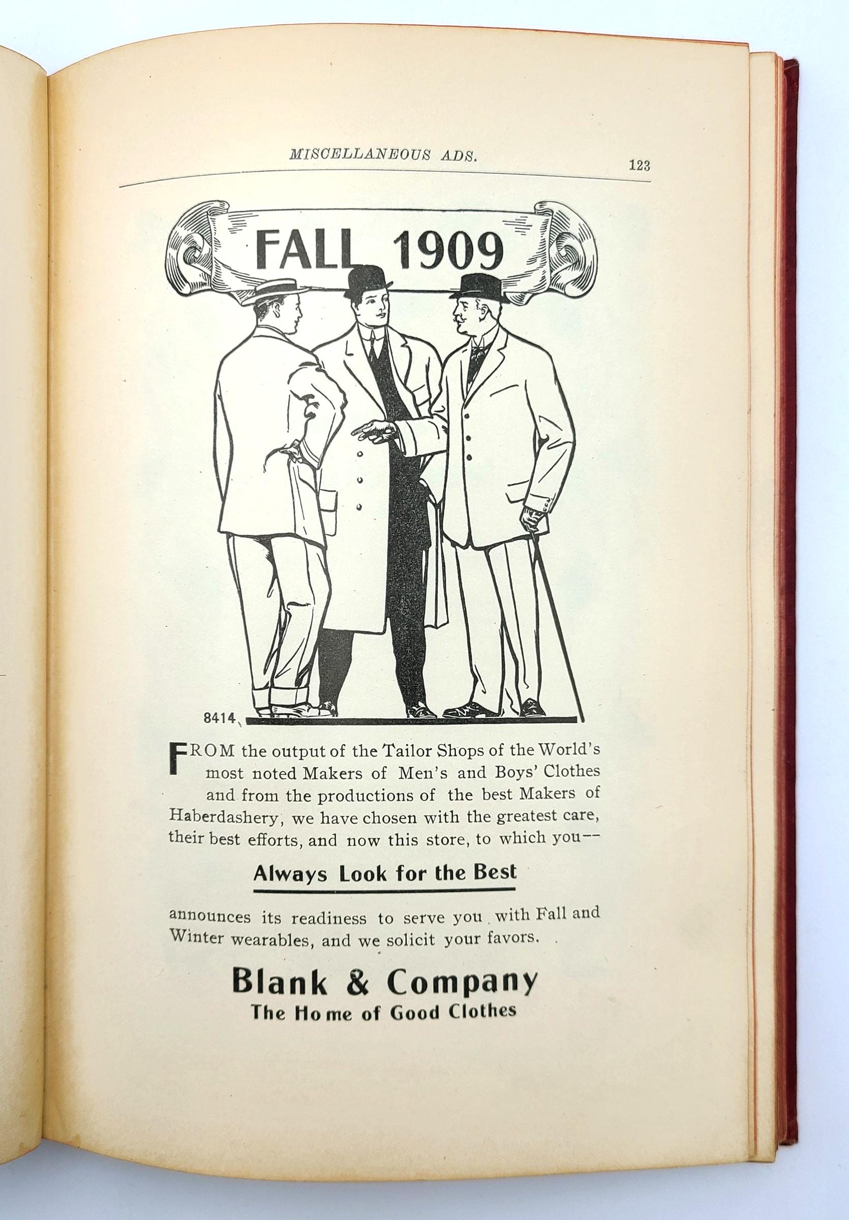 Description: Red cloth boards stamped in gilt on front cover. Volume XXII, Fall Edition. No statement of date, likely circa 1909 (the dates on the mock-ups of advertising correspondence are all given dates for the fall of 1909). Covers soiled. Some splitting to cloth at spine ends. Lacking front free endpaper. Soiling on the copyright and dedication pages, otherwise interior is clean. xxv + 382 pages.