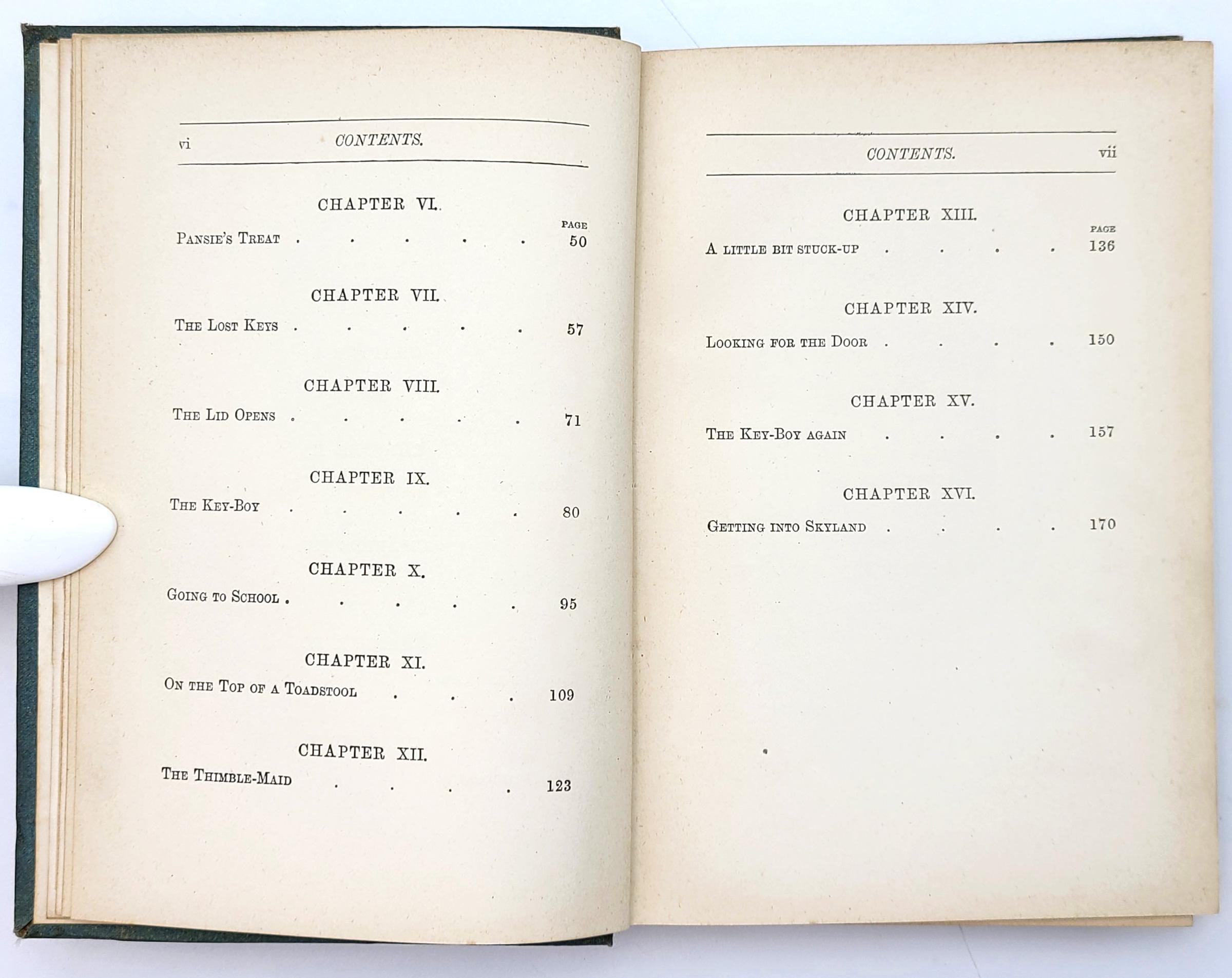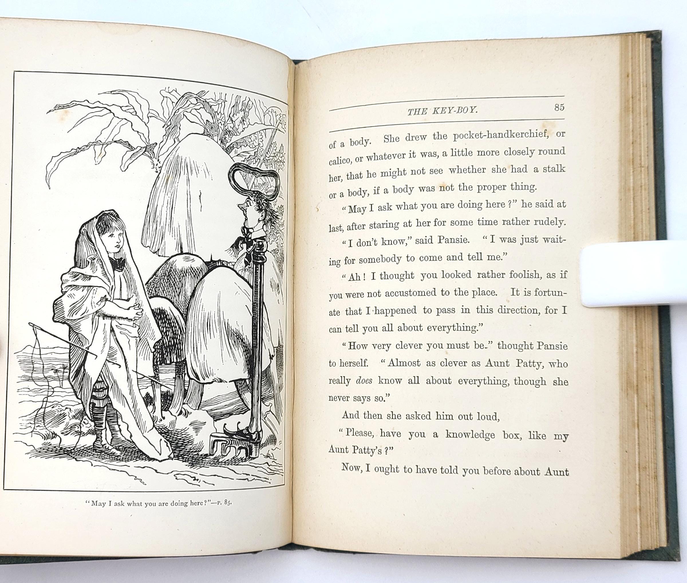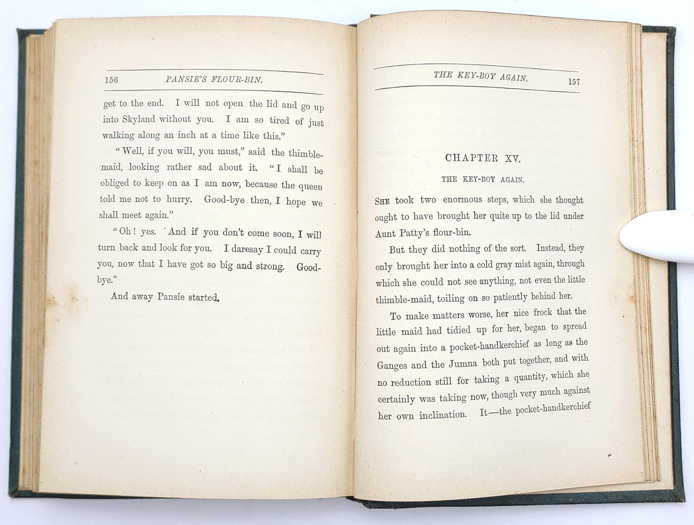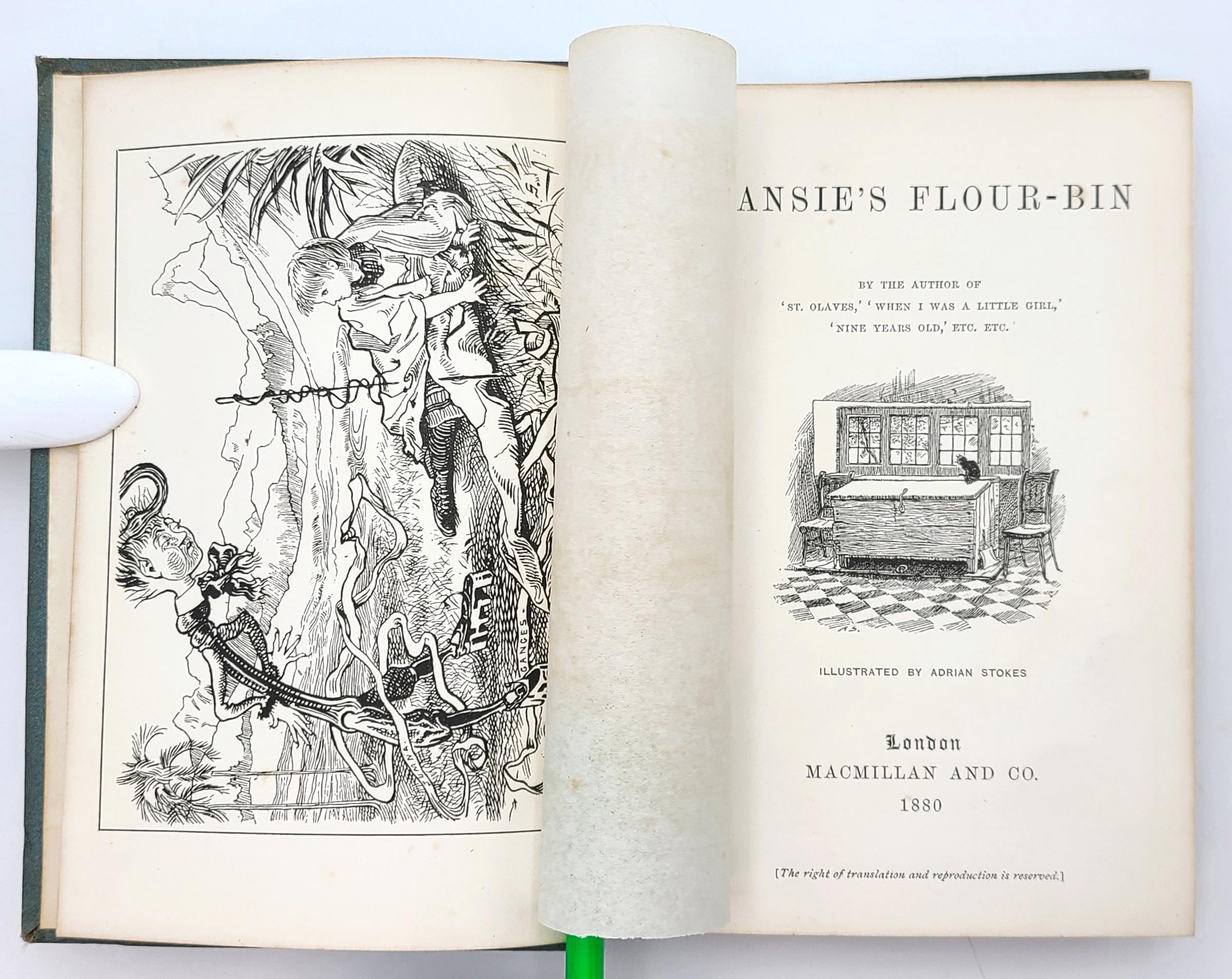 The story of a young English girl, Pansie Moss, and her imaginative life at home, featuring an extended dream adventure in Fairyland, located inside her aunt's flour bin. The character of Pansie was likely modeled on the author's own step-daughters, Lilian and Lucie, who, like Pansie, spent their early childhoods in India. The author and her step-children returned to England in 1880, the year that Pansie's Flour-Bin was published.