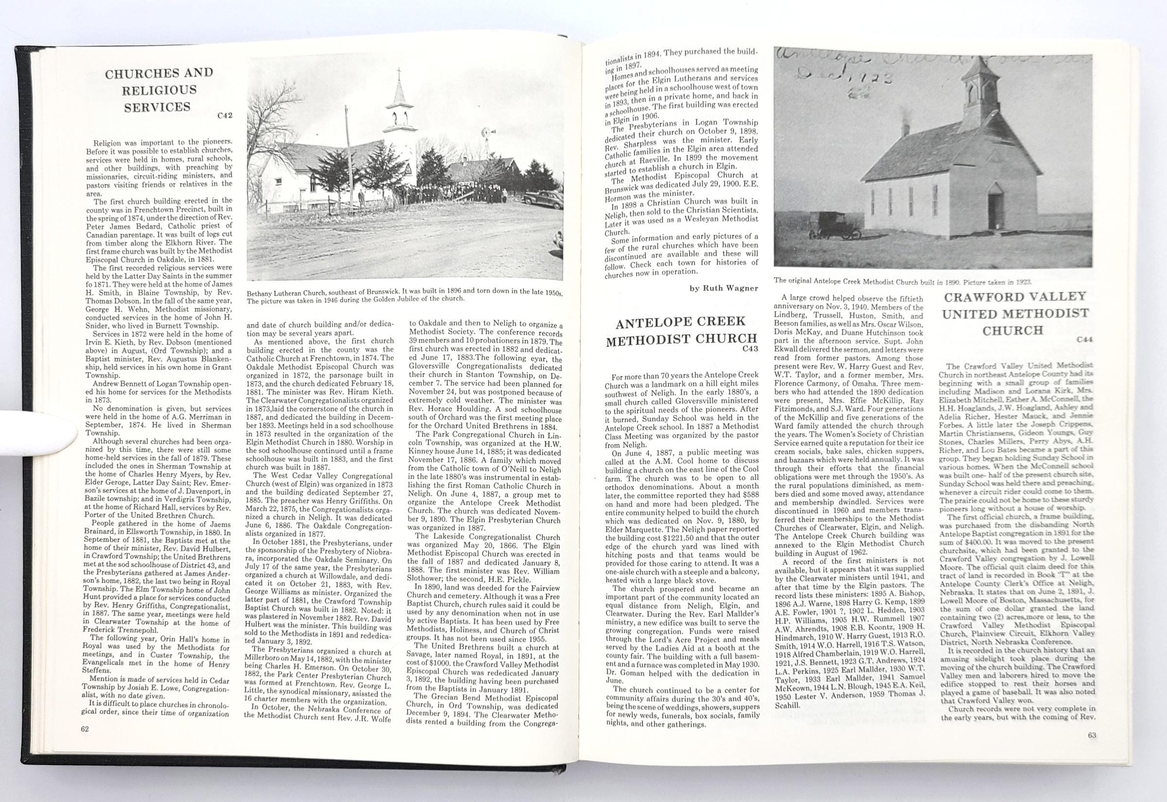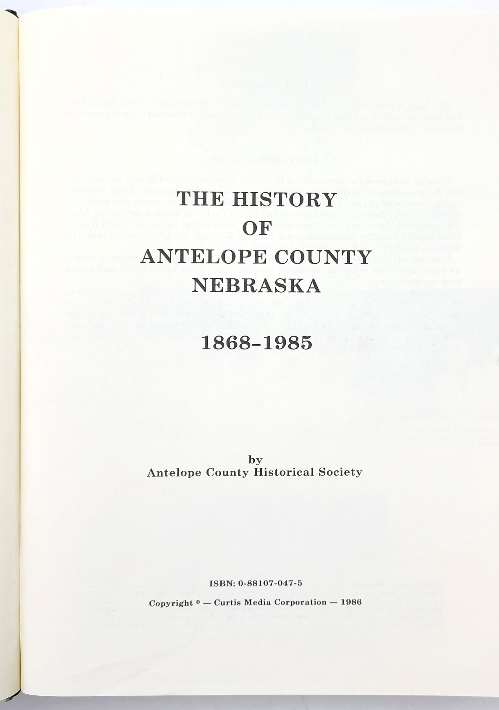 A history of Antelope County and its towns and small communities, with more than 450 pages of biographical information on the residents and families (pioneer, early, contemporary), many of which feature a portrait or family picture. Extensively illustrated with historical photos, plus plat maps of towns. Provides detailed historical information on schools, churches, businesses, cemeteries, notable persons and events, and the county's development.
