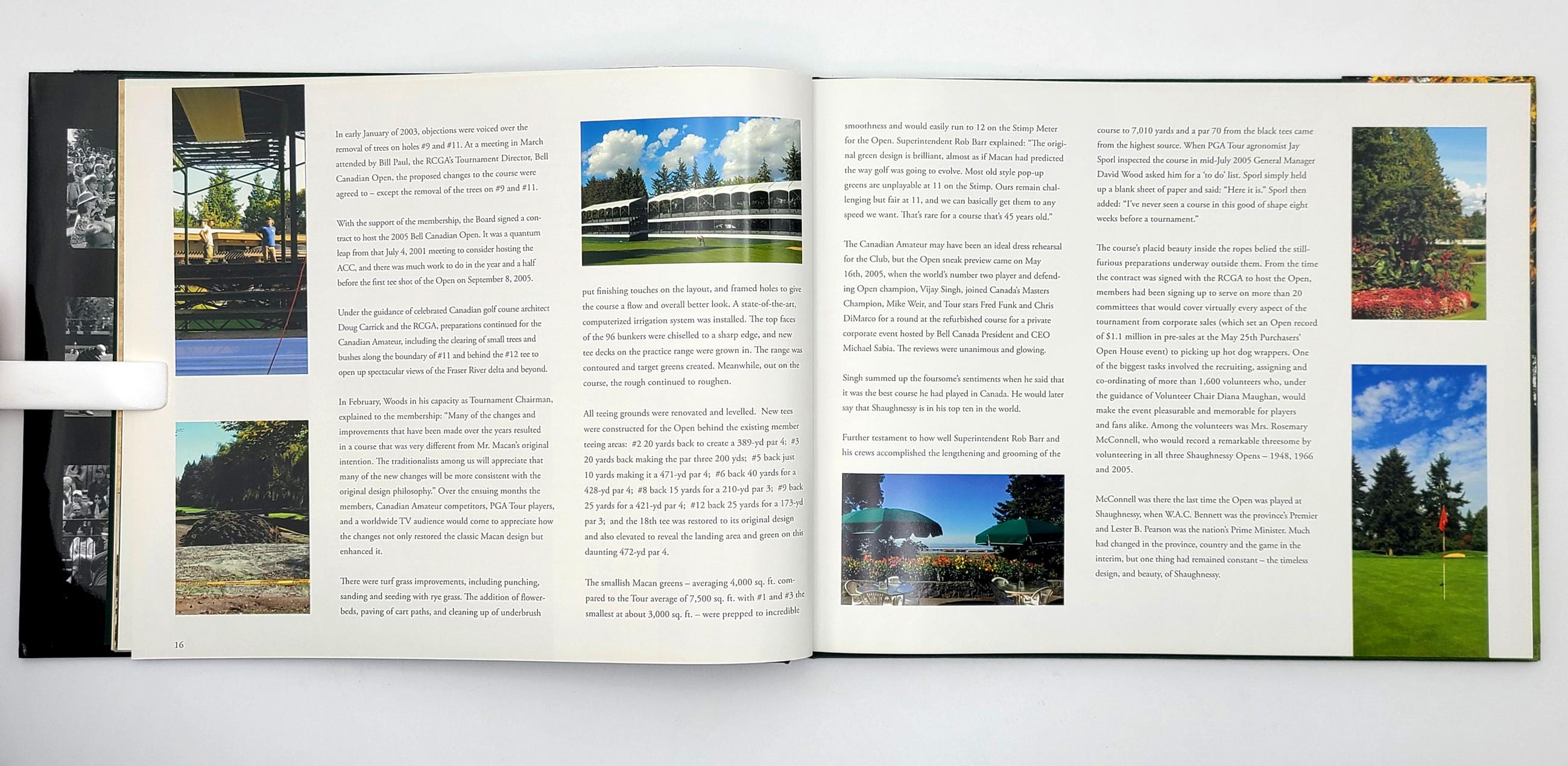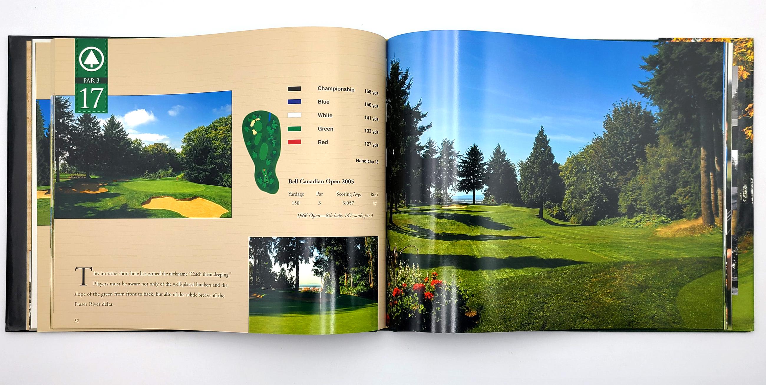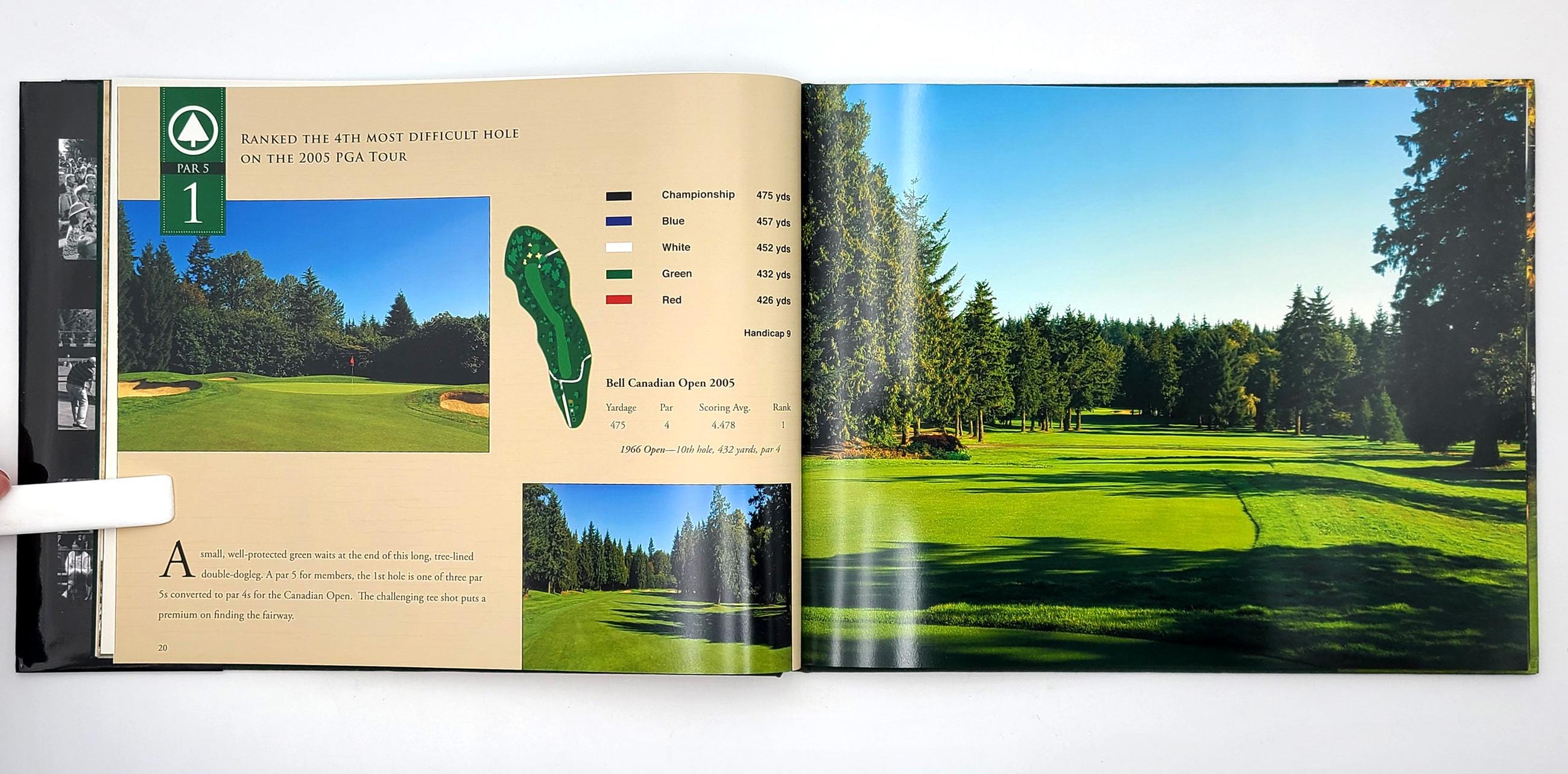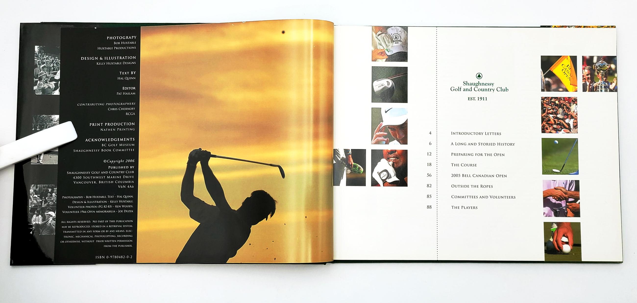 An attractive and finely photographed pictorial commemorative of Vancouver's Shaughnessy Golf & Country Club's golf course and the play at the 2005 Bell Canadian Open, won by Mark Calcavecchia. The 18 holes are systematically presented, each featuring multiple views and a map diagram, accompanied by a short description and specs (plus comparative specs for the 1966 Canadian Open). The following 26 pages document the play at the 2005 Bell Canadian Open with pictures and a brief narrative. The volume opens with a short history of the Club.