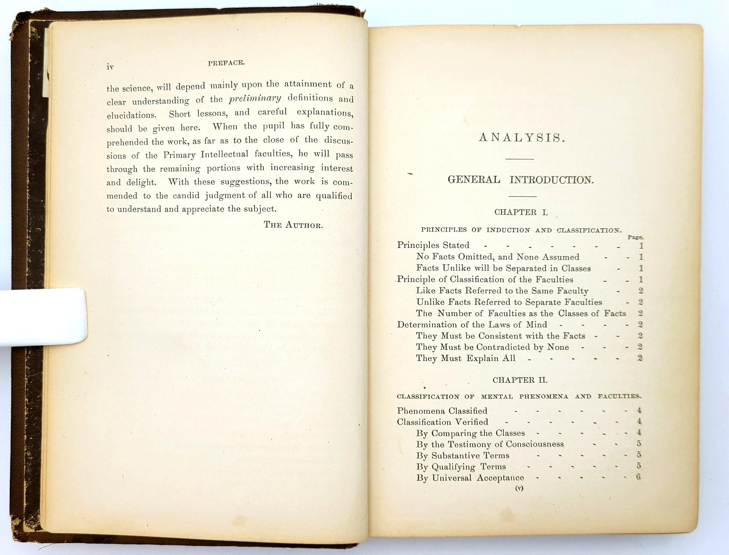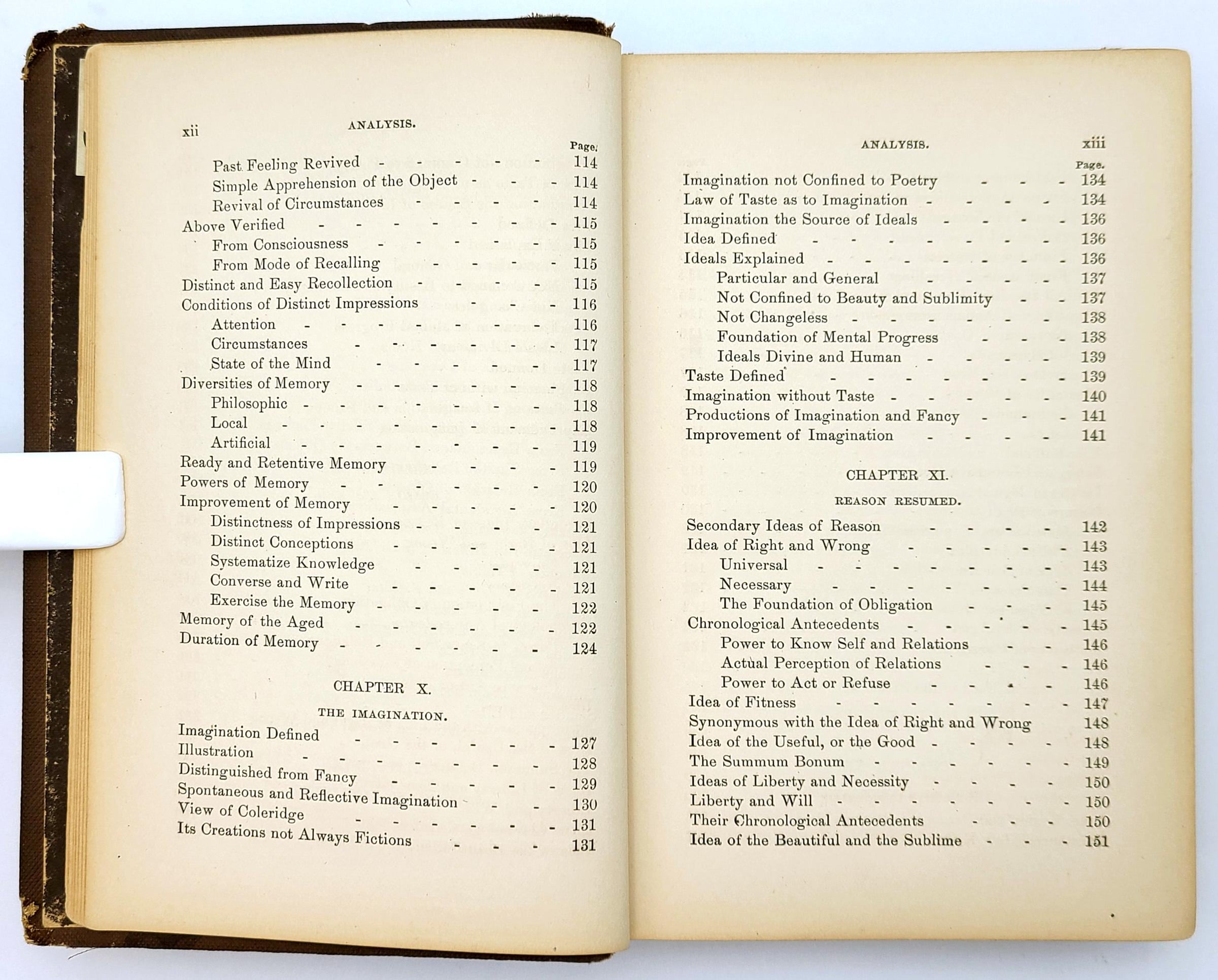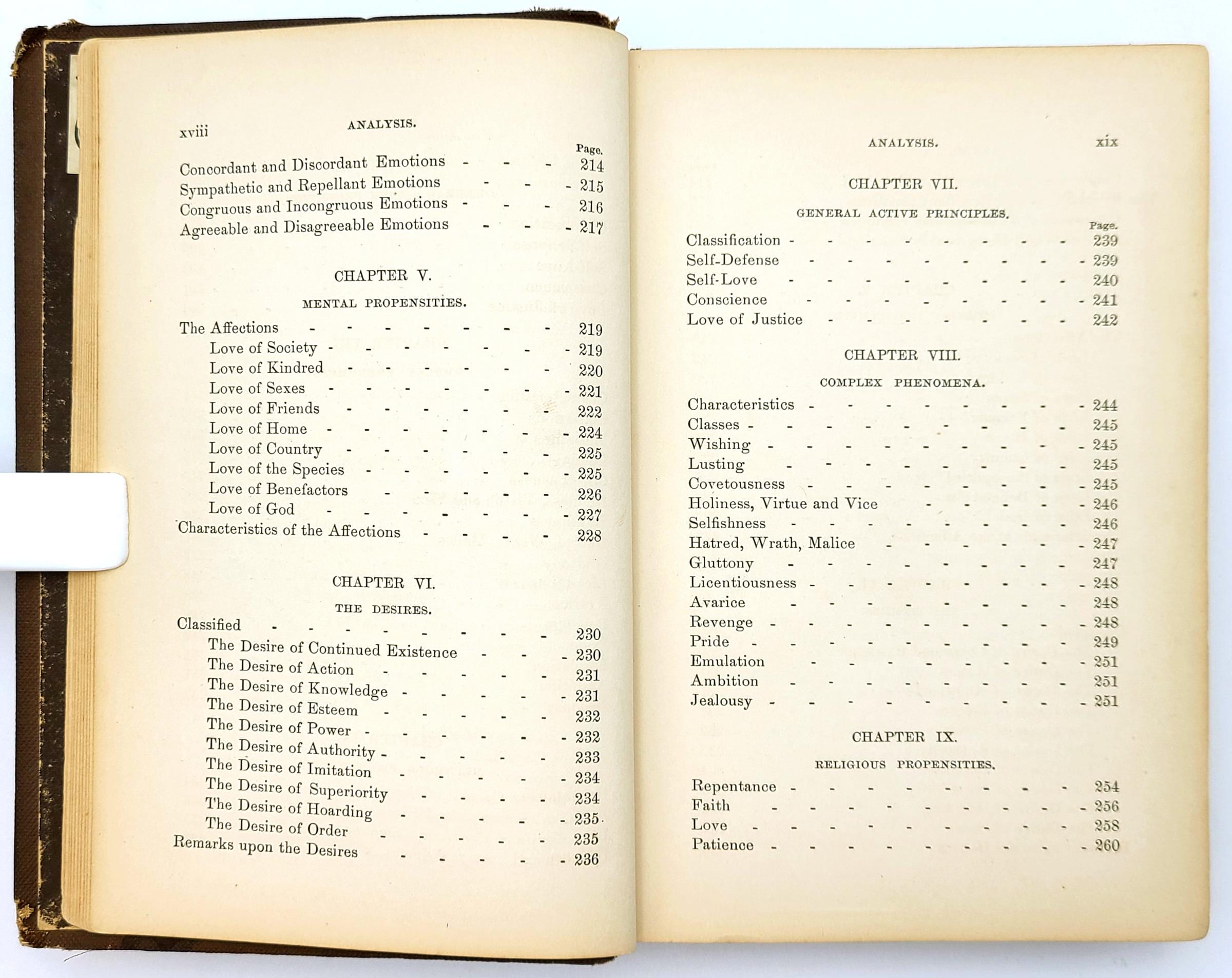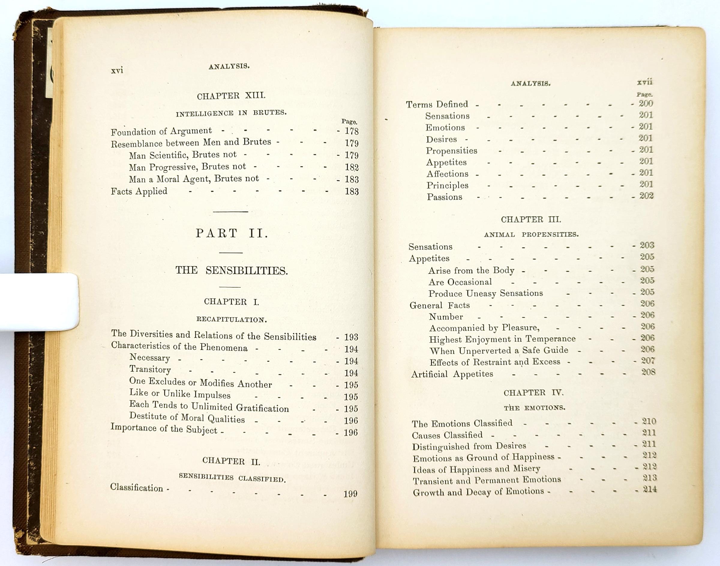Chapters: [General Introduction] I. Principles of Induction and Classification. II. Classification of Mental Phenomena and Faculties. [Part I: The Intellect] I. Intellectual Phenomena. II. Primary Faculties. III. Consciousness. IV. Sense. V. Reason. VI. Secondary Faculties. VII. Judgment. VIII. Association. IX. Memory and Recollection. X. The Imagination. XI Reason Resumed. XII. Laws of Investigation. XIII. Intelligence in Brutes. [Part II: The Sensibilities] I. Recapitulation. II. Sensibilities Classified. III. Animal Propensities. IV. The Emotions. V. Mental Propensities. VI. The Desires. VII. General Active Principles. VIII. Complex Phenomena. IX. Religious Propensities. [Part III: The Will].