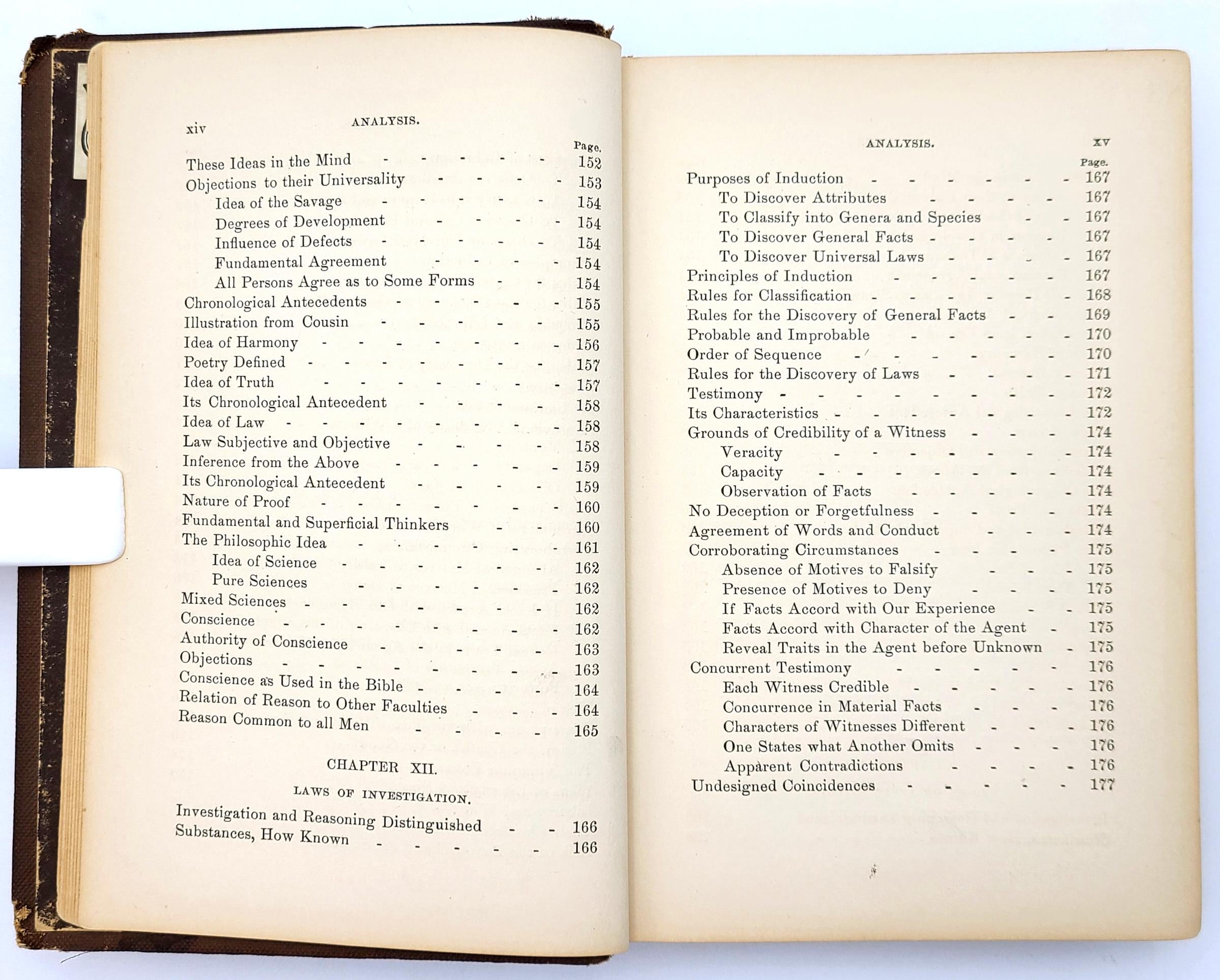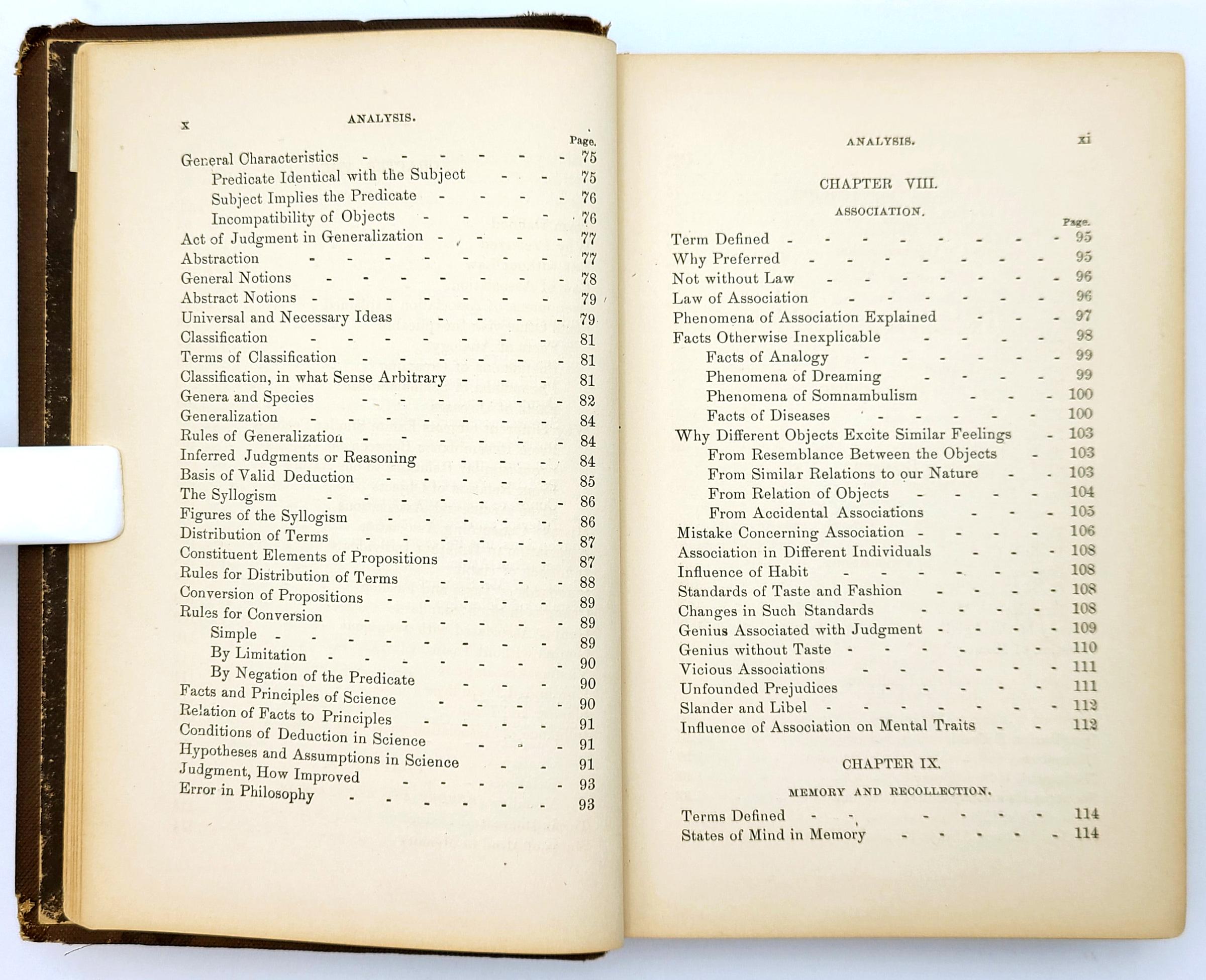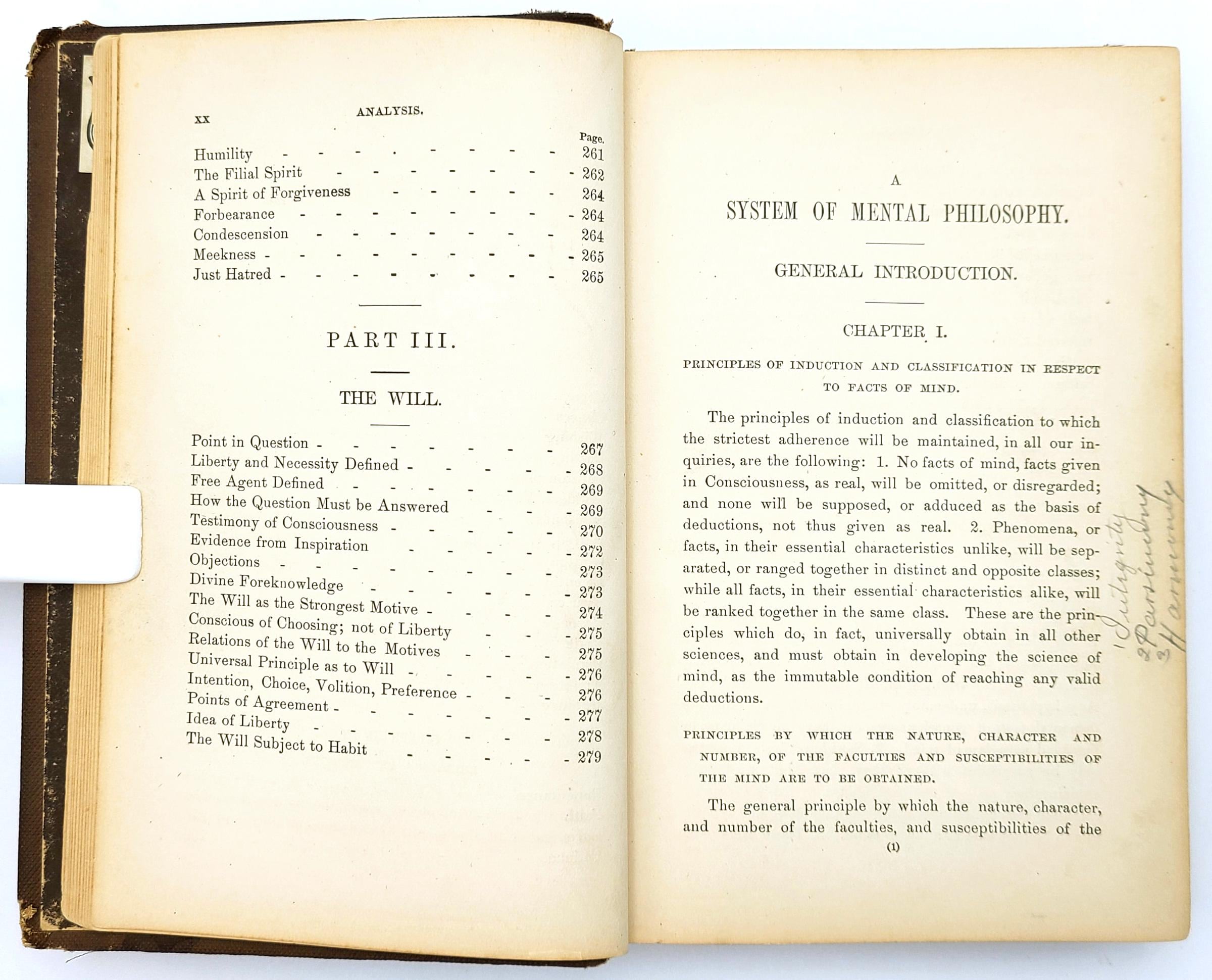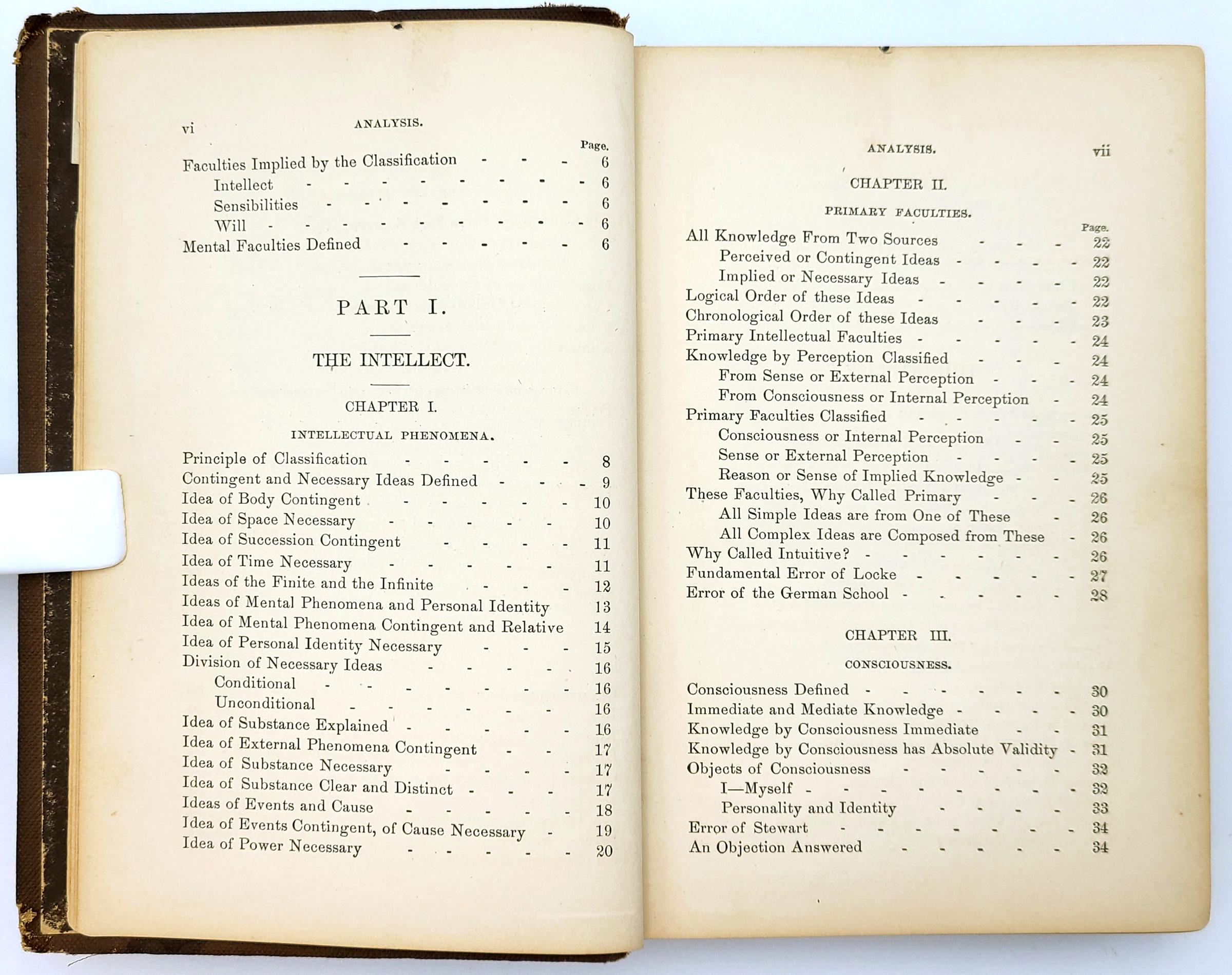 Chapters: [General Introduction] I. Principles of Induction and Classification. II. Classification of Mental Phenomena and Faculties. [Part I: The Intellect] I. Intellectual Phenomena. II. Primary Faculties. III. Consciousness. IV. Sense. V. Reason. VI. Secondary Faculties. VII. Judgment. VIII. Association. IX. Memory and Recollection. X. The Imagination. XI Reason Resumed. XII. Laws of Investigation. XIII. Intelligence in Brutes. [Part II: The Sensibilities] I. Recapitulation. II. Sensibilities Classified. III. Animal Propensities. IV. The Emotions. V. Mental Propensities. VI. The Desires. VII. General Active Principles. VIII. Complex Phenomena. IX. Religious Propensities. [Part III: The Will].