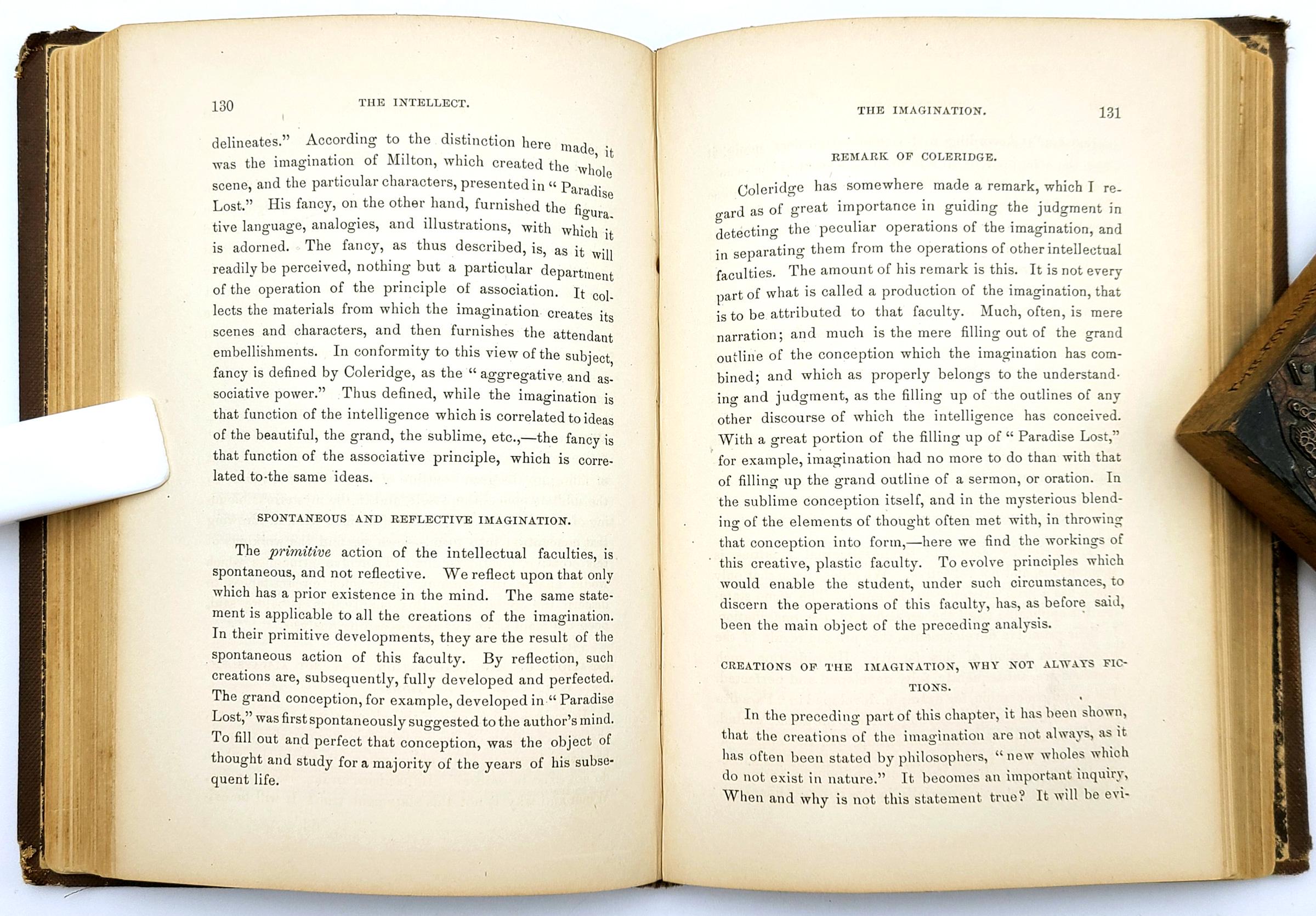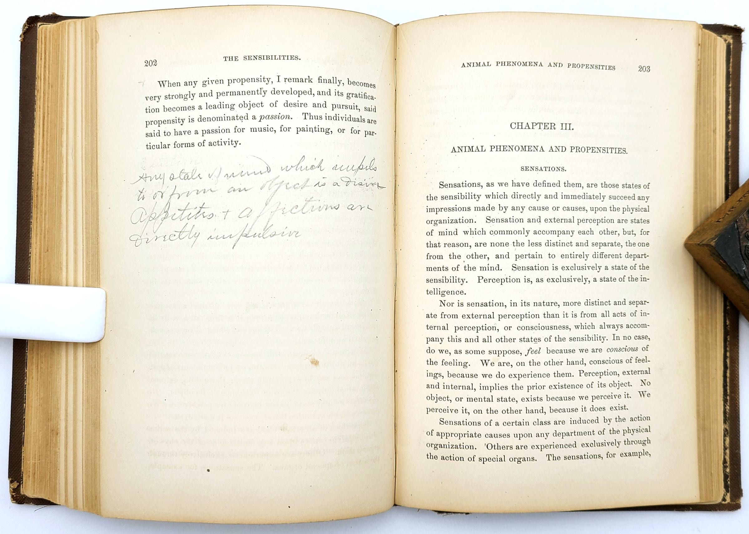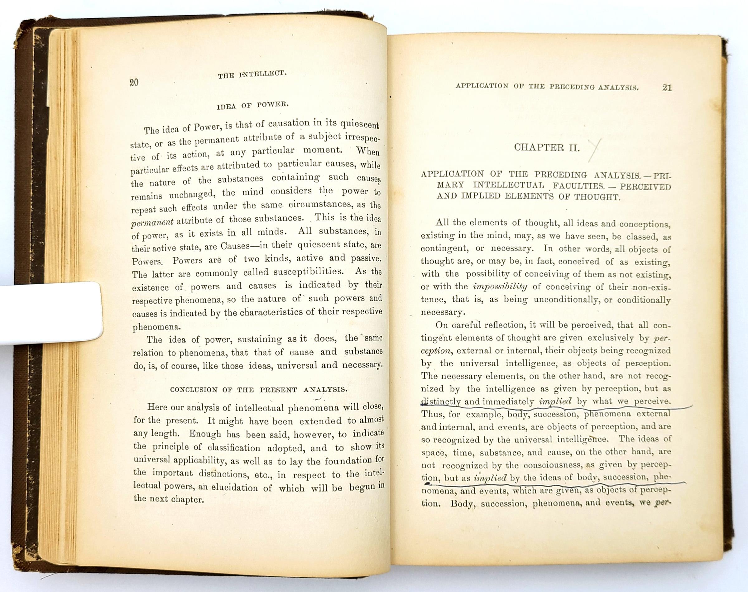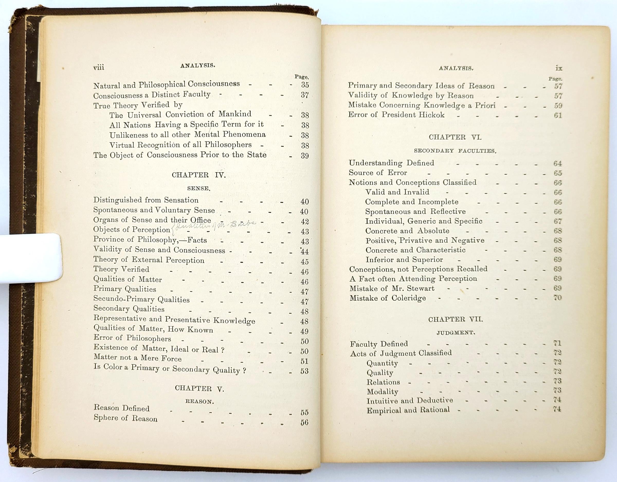 Chapters: [General Introduction] I. Principles of Induction and Classification. II. Classification of Mental Phenomena and Faculties. [Part I: The Intellect] I. Intellectual Phenomena. II. Primary Faculties. III. Consciousness. IV. Sense. V. Reason. VI. Secondary Faculties. VII. Judgment. VIII. Association. IX. Memory and Recollection. X. The Imagination. XI Reason Resumed. XII. Laws of Investigation. XIII. Intelligence in Brutes. [Part II: The Sensibilities] I. Recapitulation. II. Sensibilities Classified. III. Animal Propensities. IV. The Emotions. V. Mental Propensities. VI. The Desires. VII. General Active Principles. VIII. Complex Phenomena. IX. Religious Propensities. [Part III: The Will].