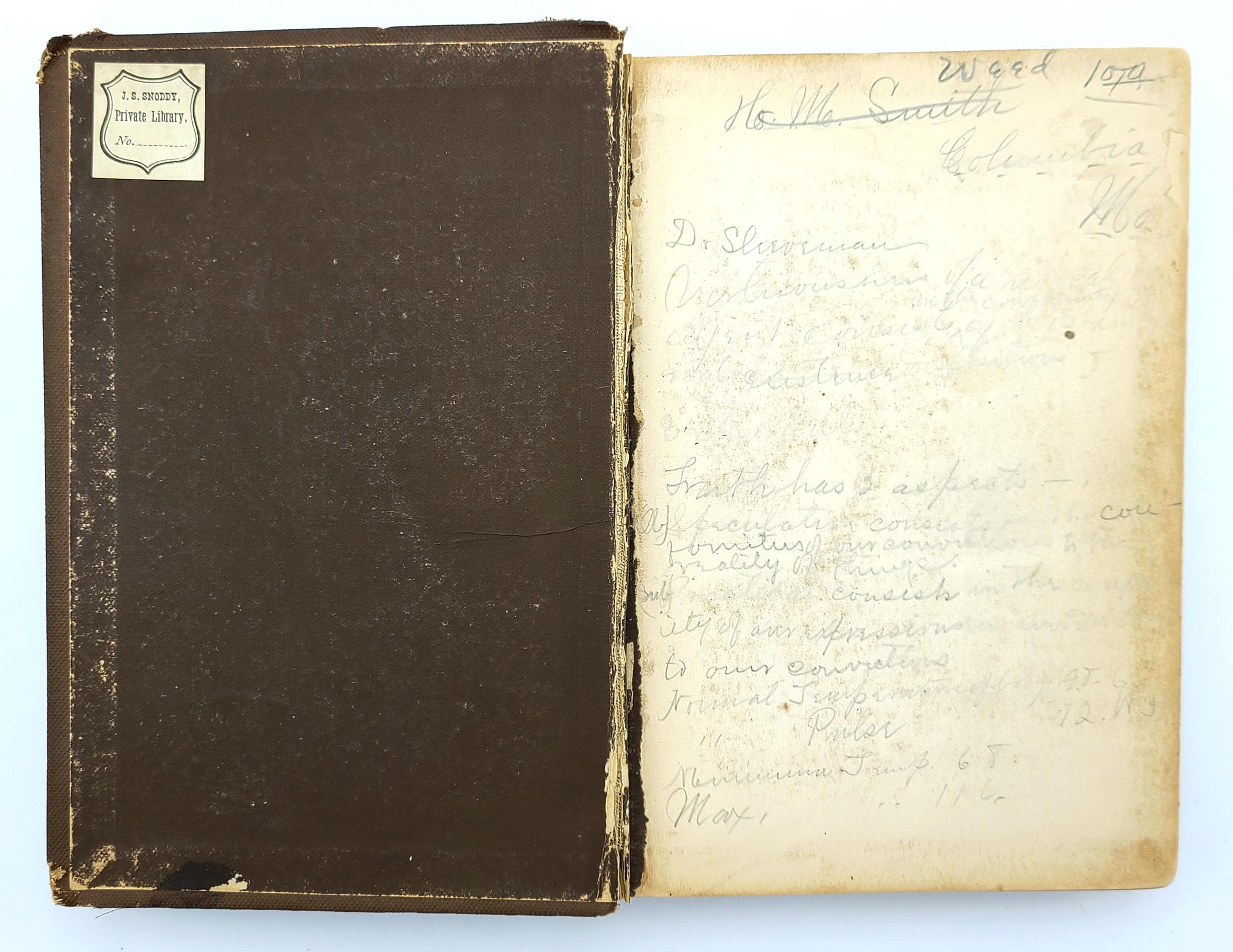 Original owner's small library sticker in upper corner of front pastedown. It appears to have belonged to James S. Snoddy (c. 1861-1922), who graduated from the University of Missouri in 1883, and served as the school's assistant librarian from 1884-1887. He went on to teach English at the University of California, Berkeley.