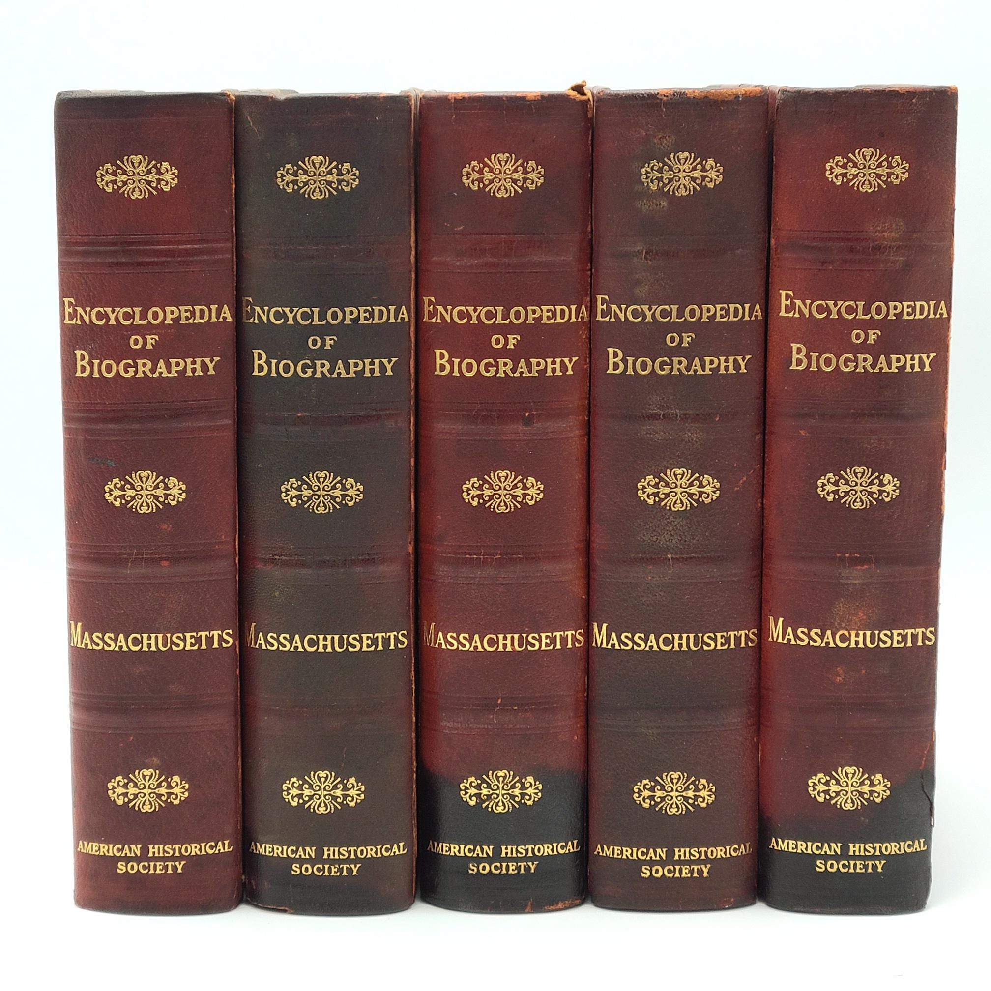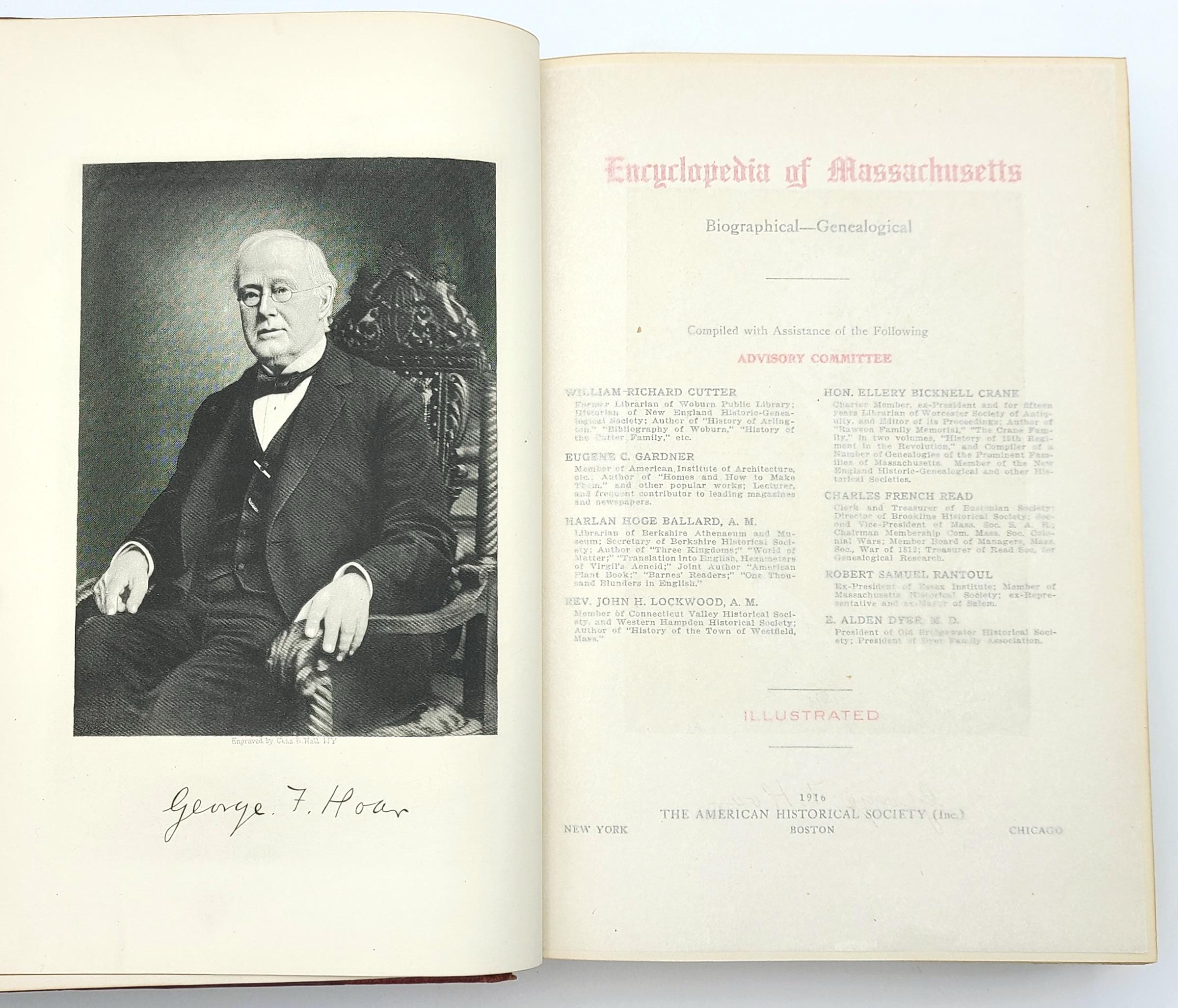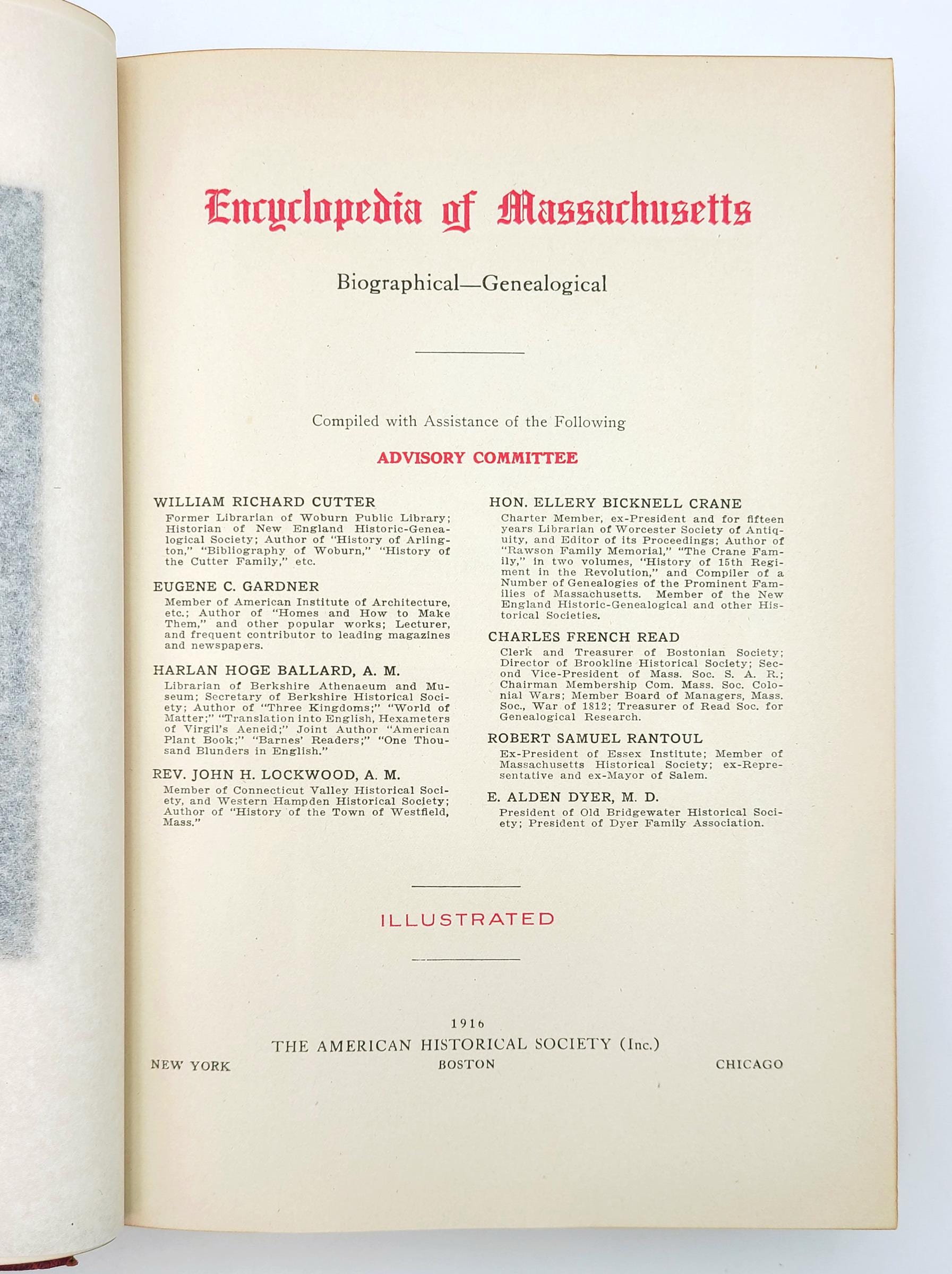 Five volumes of the 13 volume set of the Encyclopedia of Massachusetts: Biographical-Genealogical, each featuring the original 1916 title page which credits the American Historical Society's seven-member advisory committee headed by William Richard Cutter (1847-1918), who was also the corresponding secretary and historian of the New England Historic-Genealogical Society (NEHGS). [Later issued volumes featured an undated title page with the generic accreditation: ''Compiled with the Assistance of a Capable Corps of Advisers and Contributors''.]