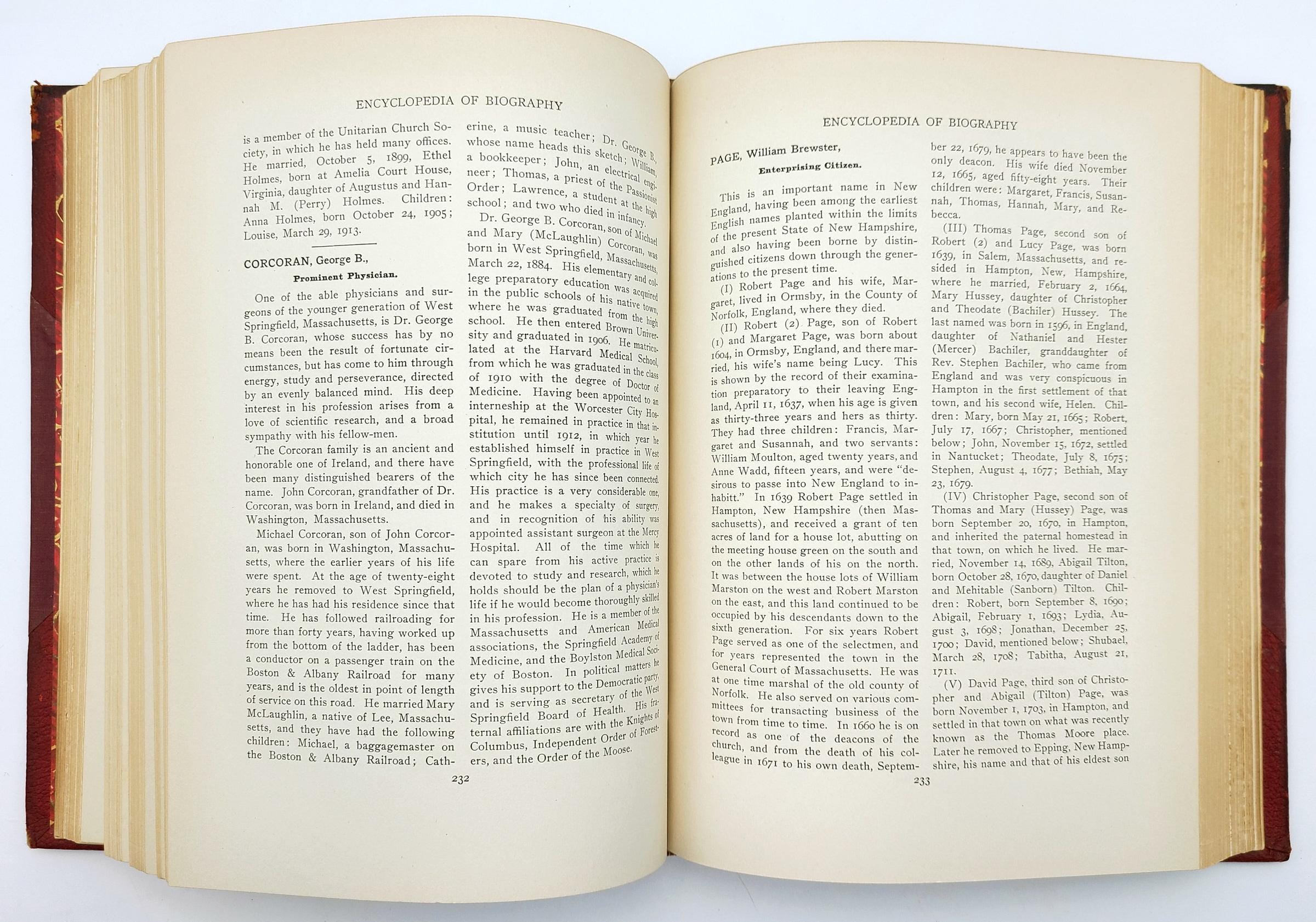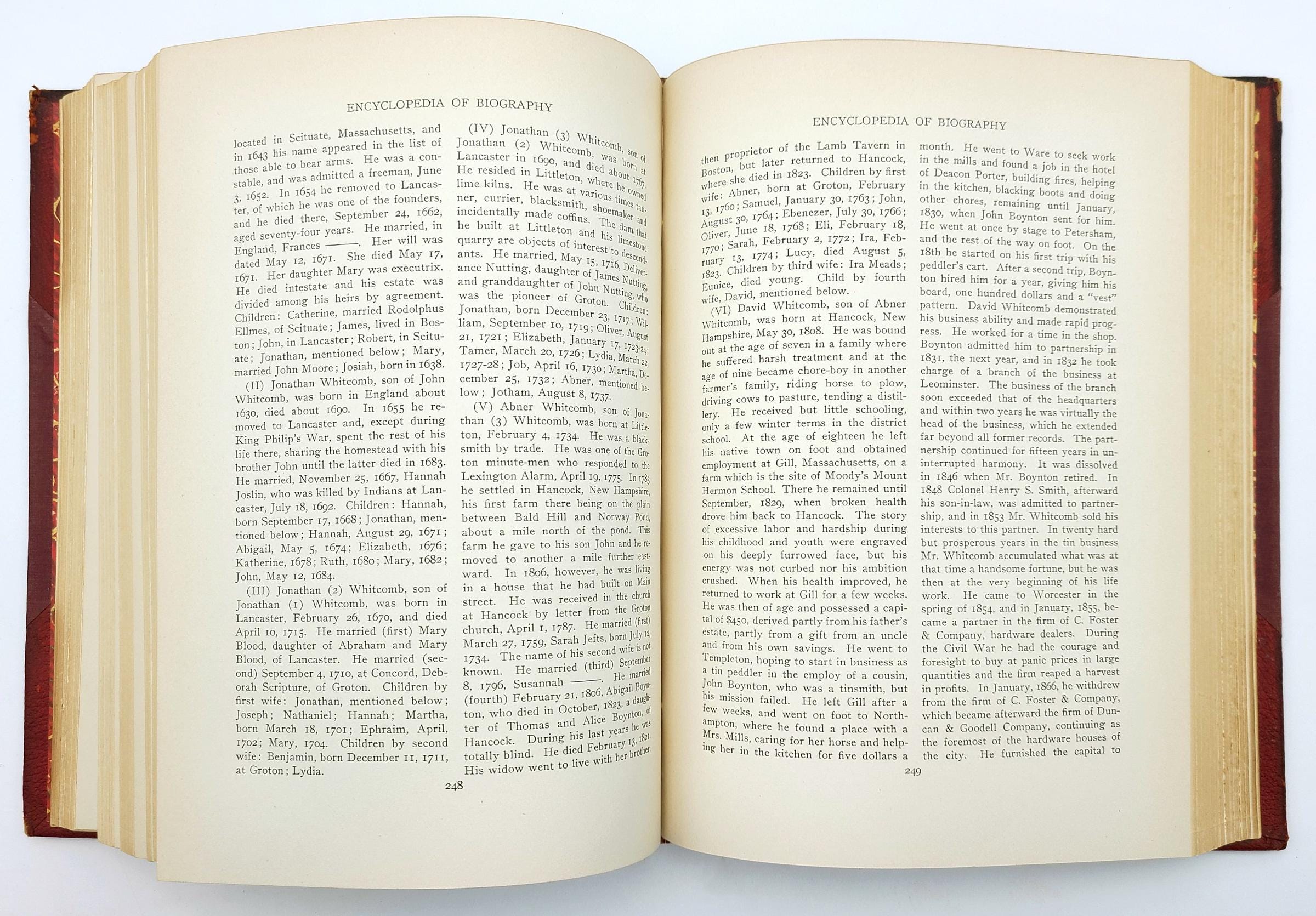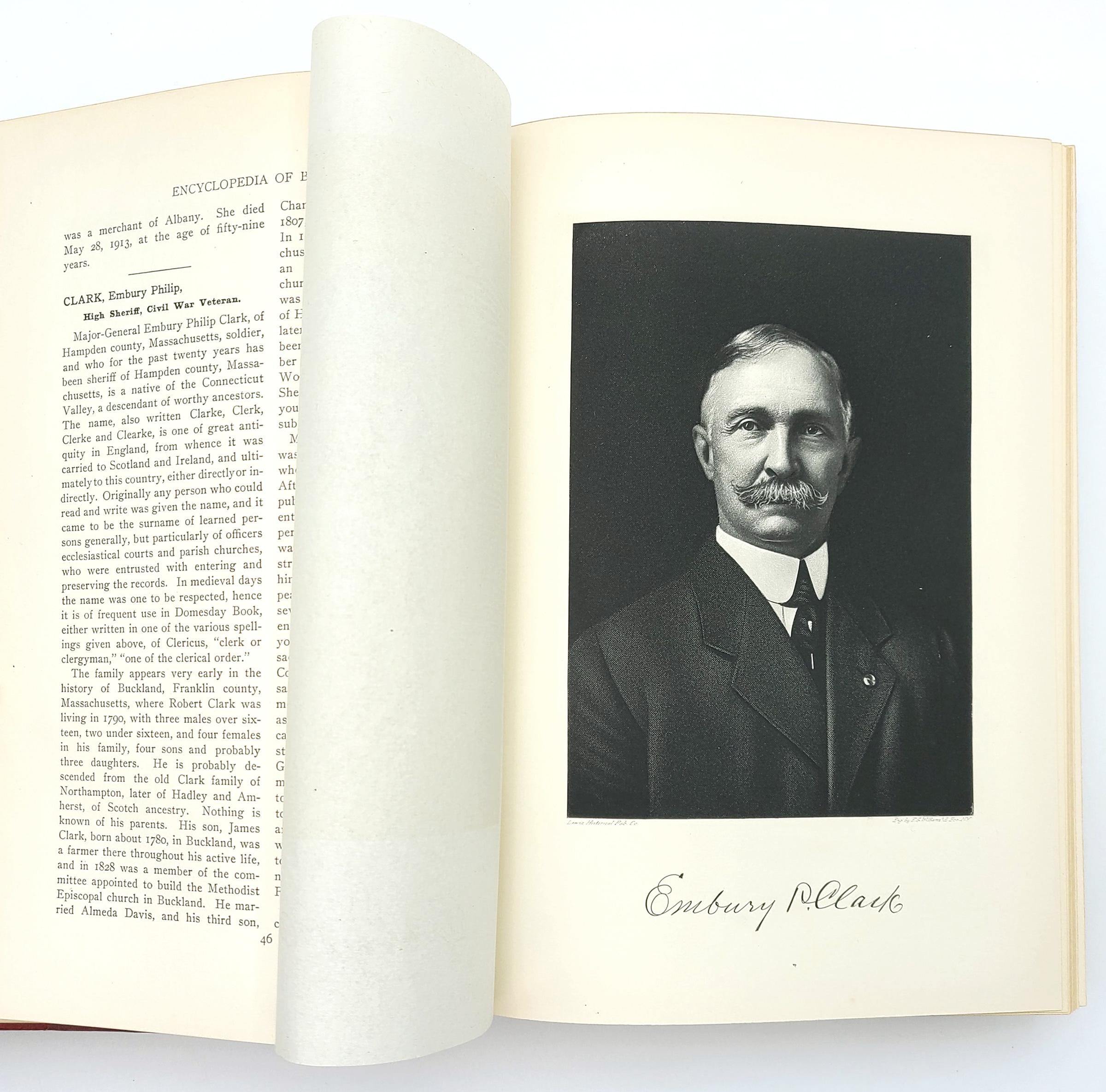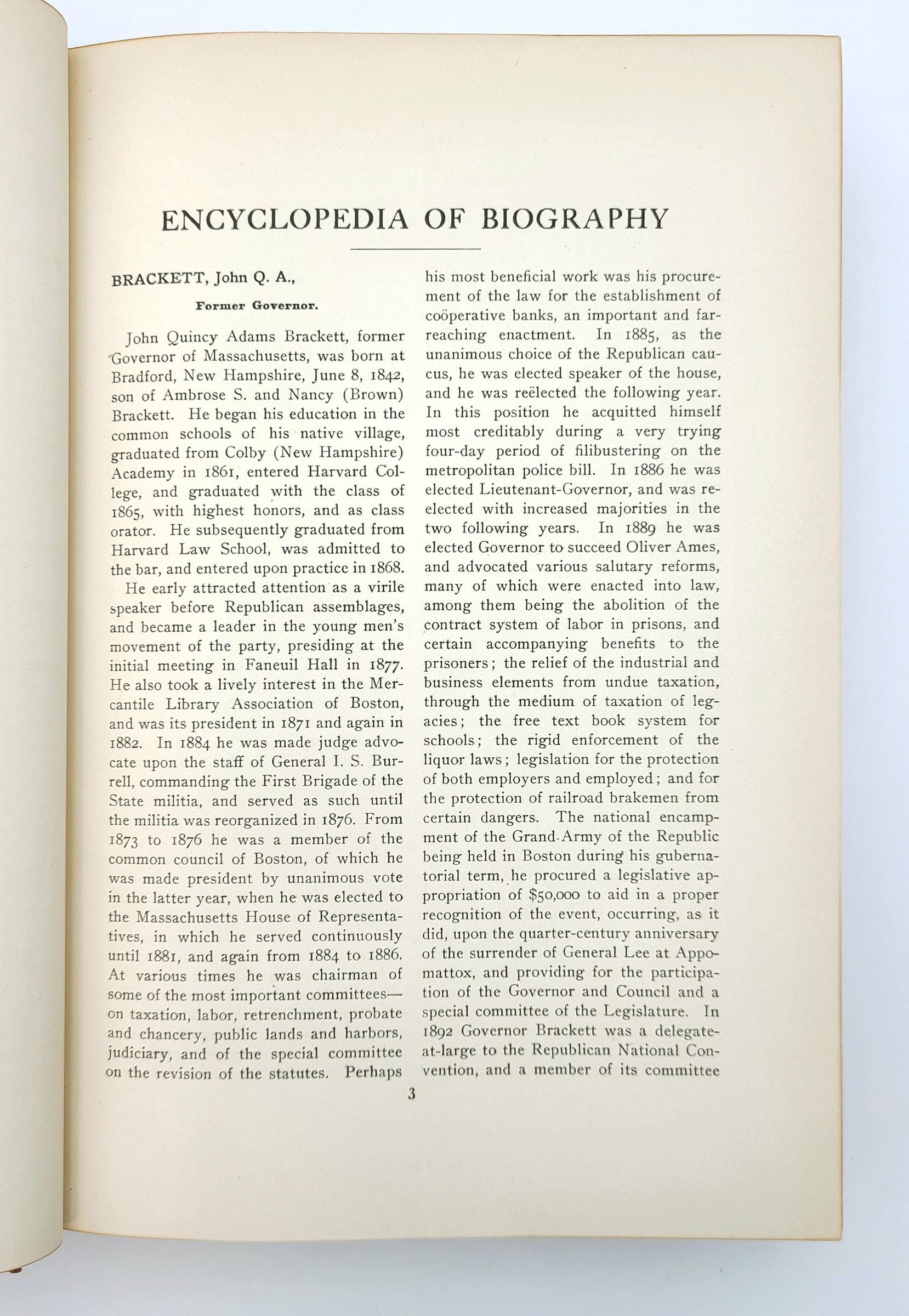 Five volumes of the 13 volume set of the Encyclopedia of Massachusetts: Biographical-Genealogical, each featuring the original 1916 title page which credits the American Historical Society's seven-member advisory committee headed by William Richard Cutter (1847-1918), who was also the corresponding secretary and historian of the New England Historic-Genealogical Society (NEHGS). [Later issued volumes featured an undated title page with the generic accreditation: ''Compiled with the Assistance of a Capable Corps of Advisers and Contributors''.]