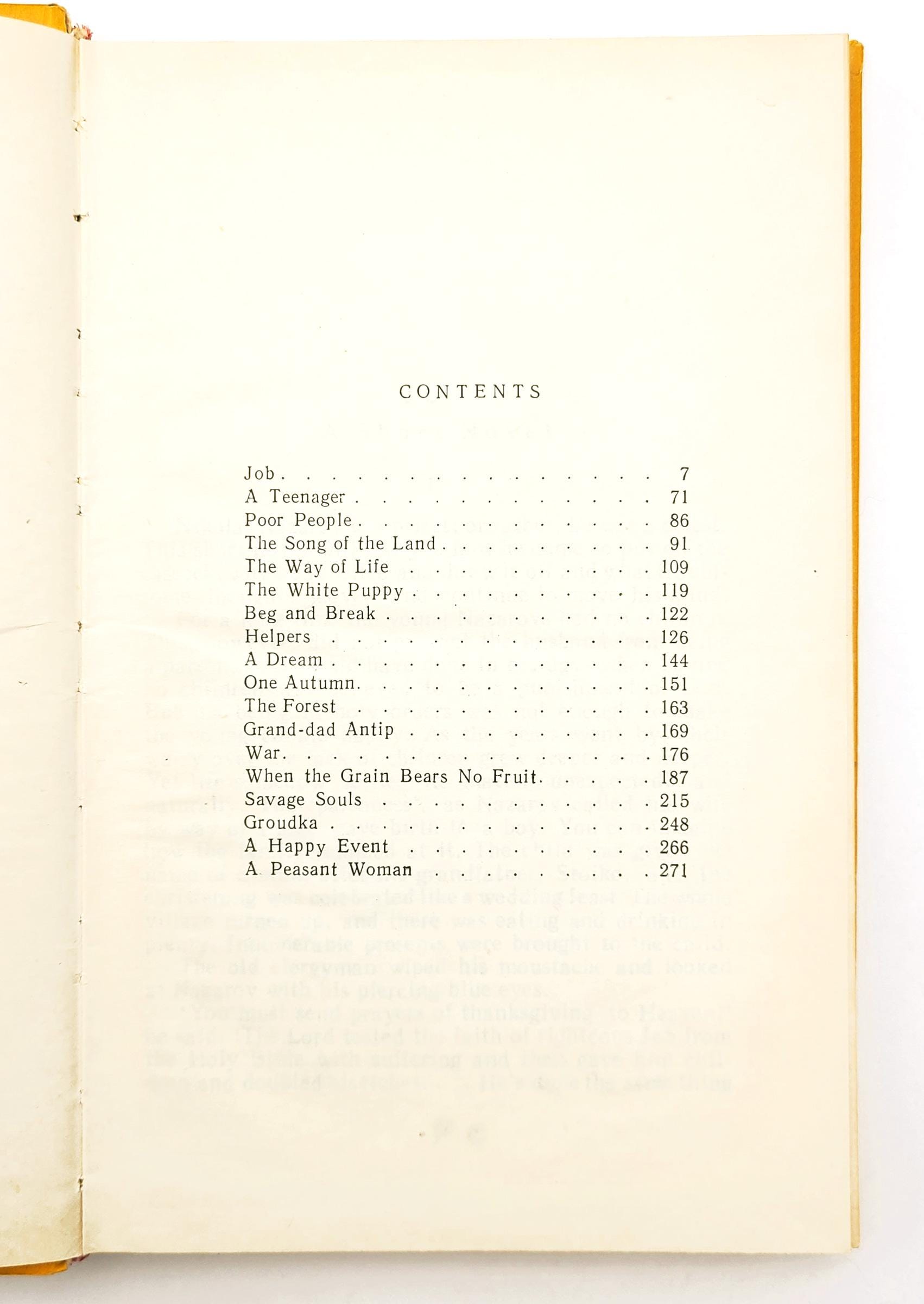 The stories included are: Job, A Teenager, Poor People, The Song of the Land, The Way of Life, The White Puppy, Beg and Break, Helpers, A Dream, One Autumn, The Forest, Grand-dad Antip, War, When the Grain Bears No Fruit, Savage Souls, Groudka, A Happy Event, and A Peasant Woman.