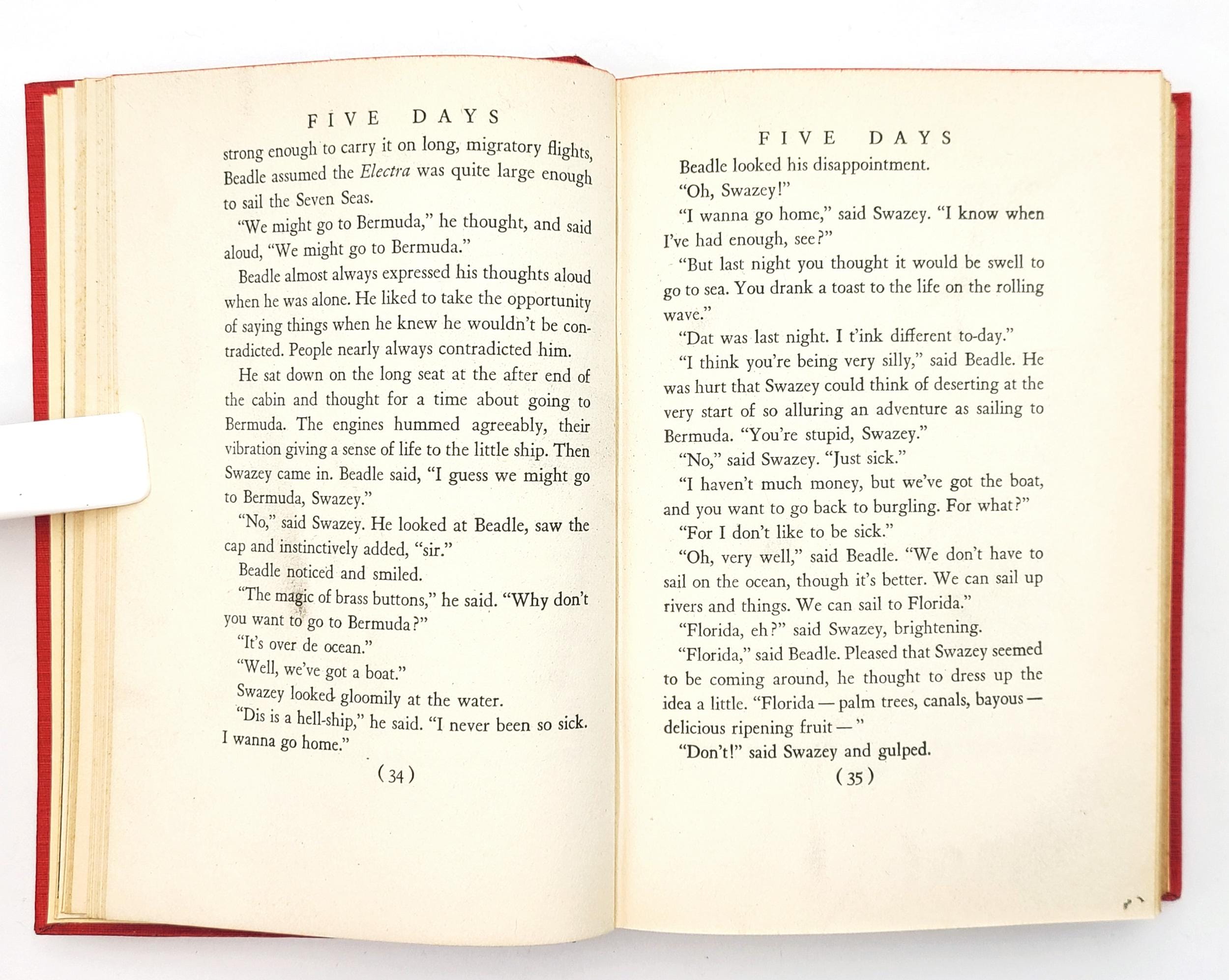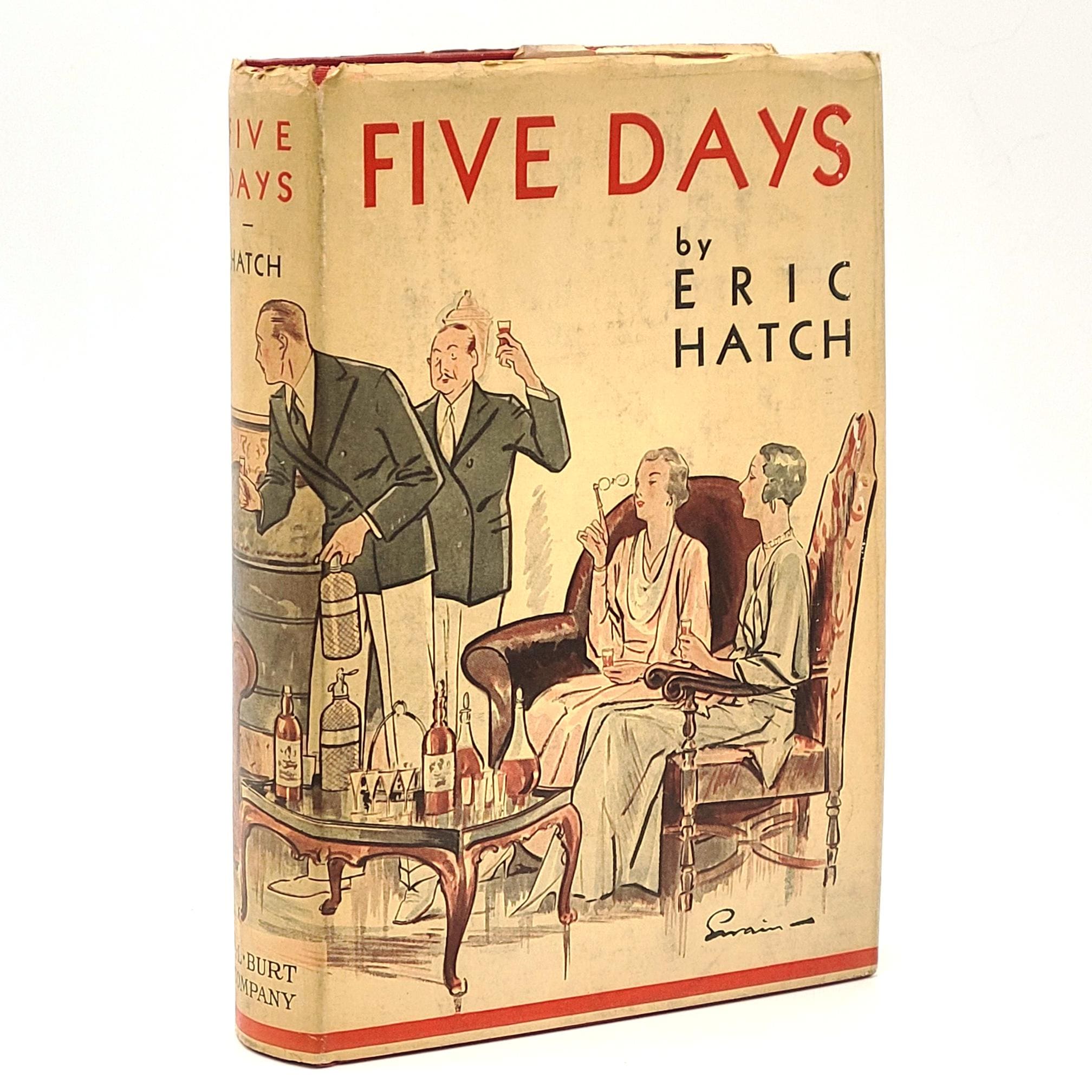 A diverting maritime caper featuring a stolen yacht, giving a caricature of Long Island society, by novelist Eric Hatch (1910-1973), a Long Islander himself. A movie adaptation of Five Days had been announced by Metro-Goldwyn-Mayer in mid-1933, which was to have featured Jimmy Durante and Stuart Erwin, but the project appears to never have come to fruition. Five Days was reprinted in a paperback edition in 1948, under the title Five Nights.