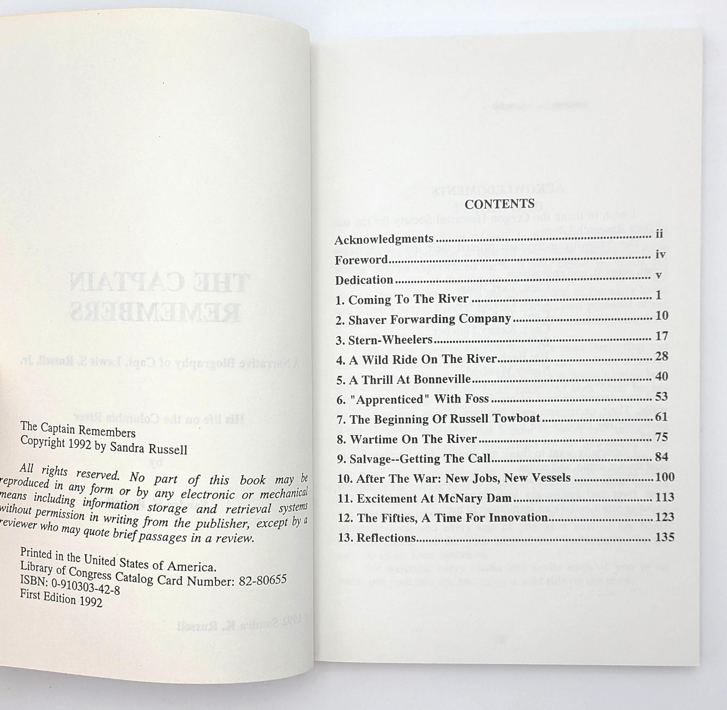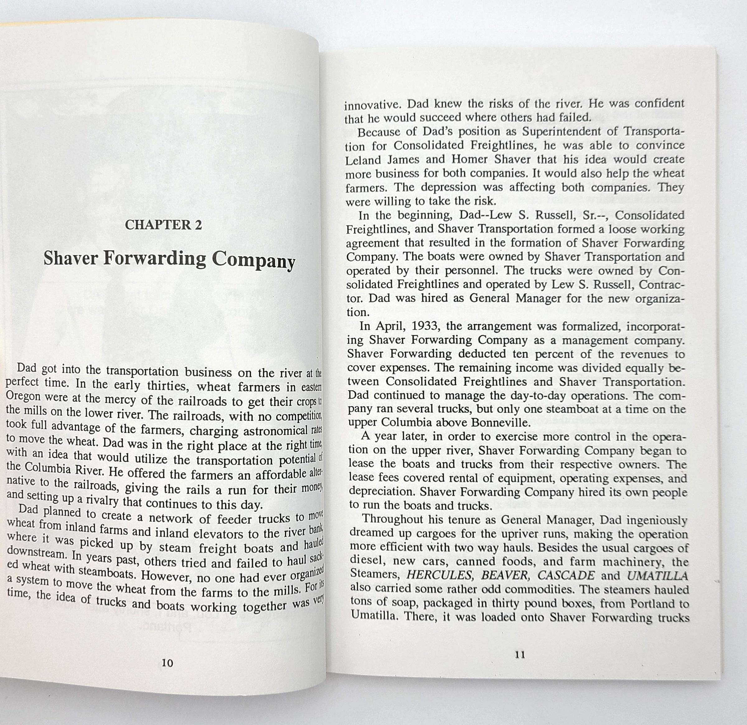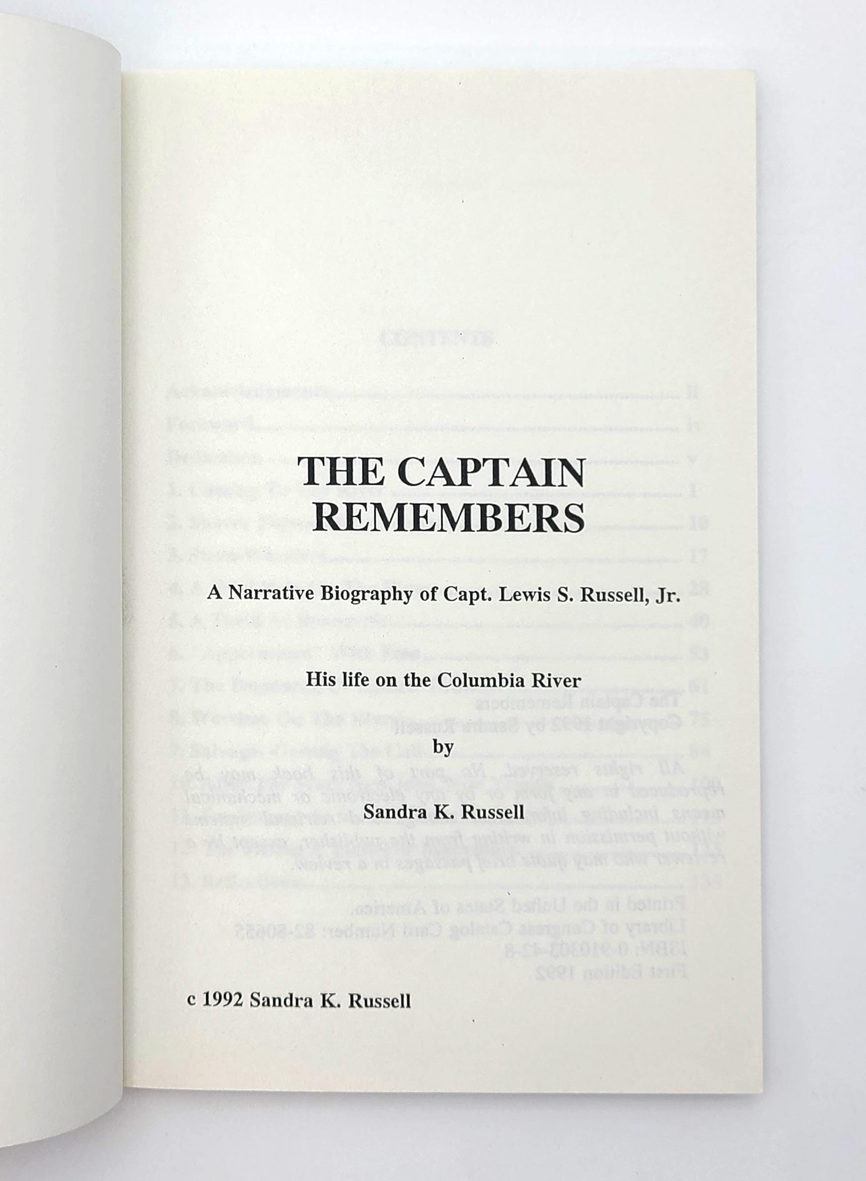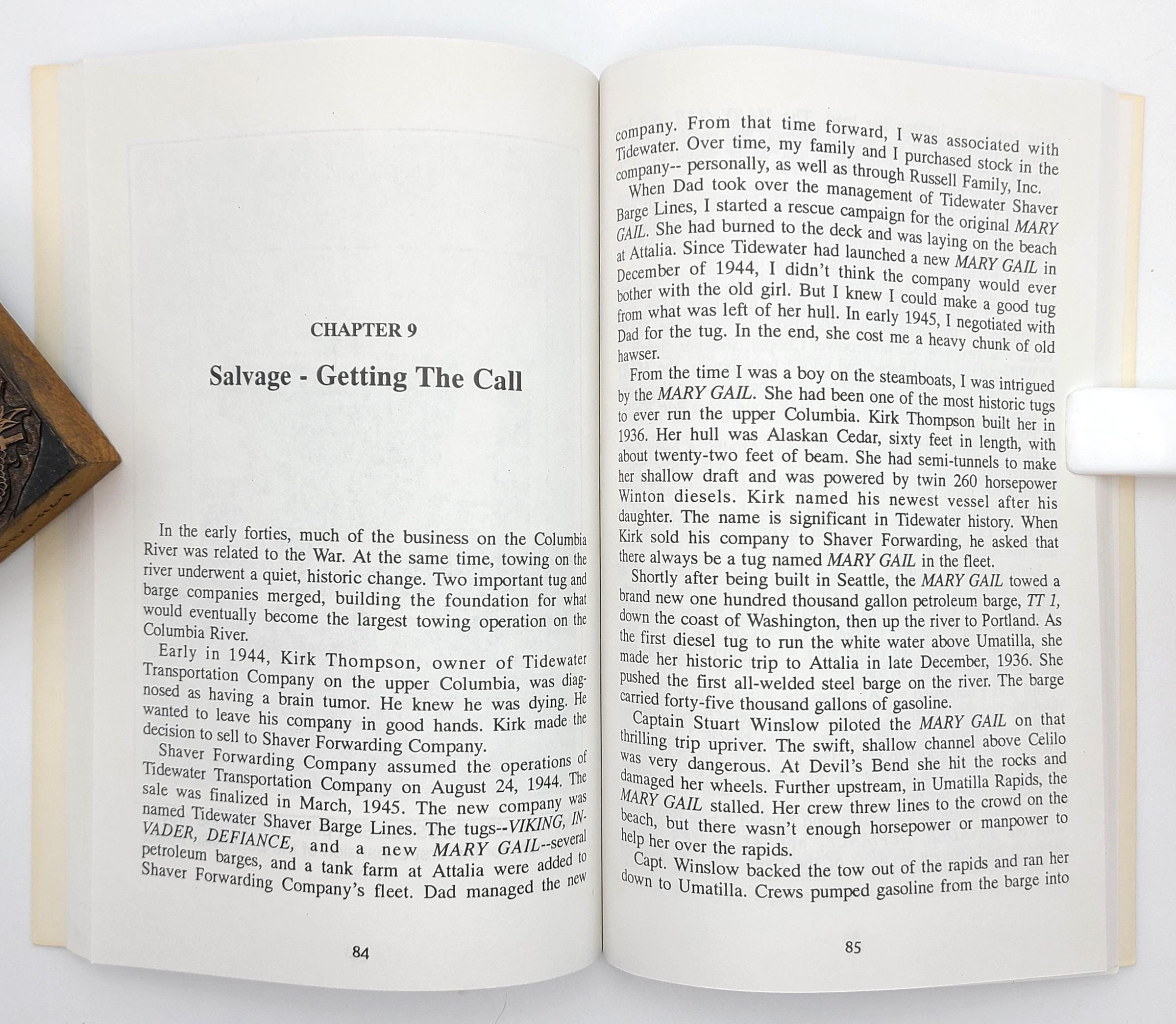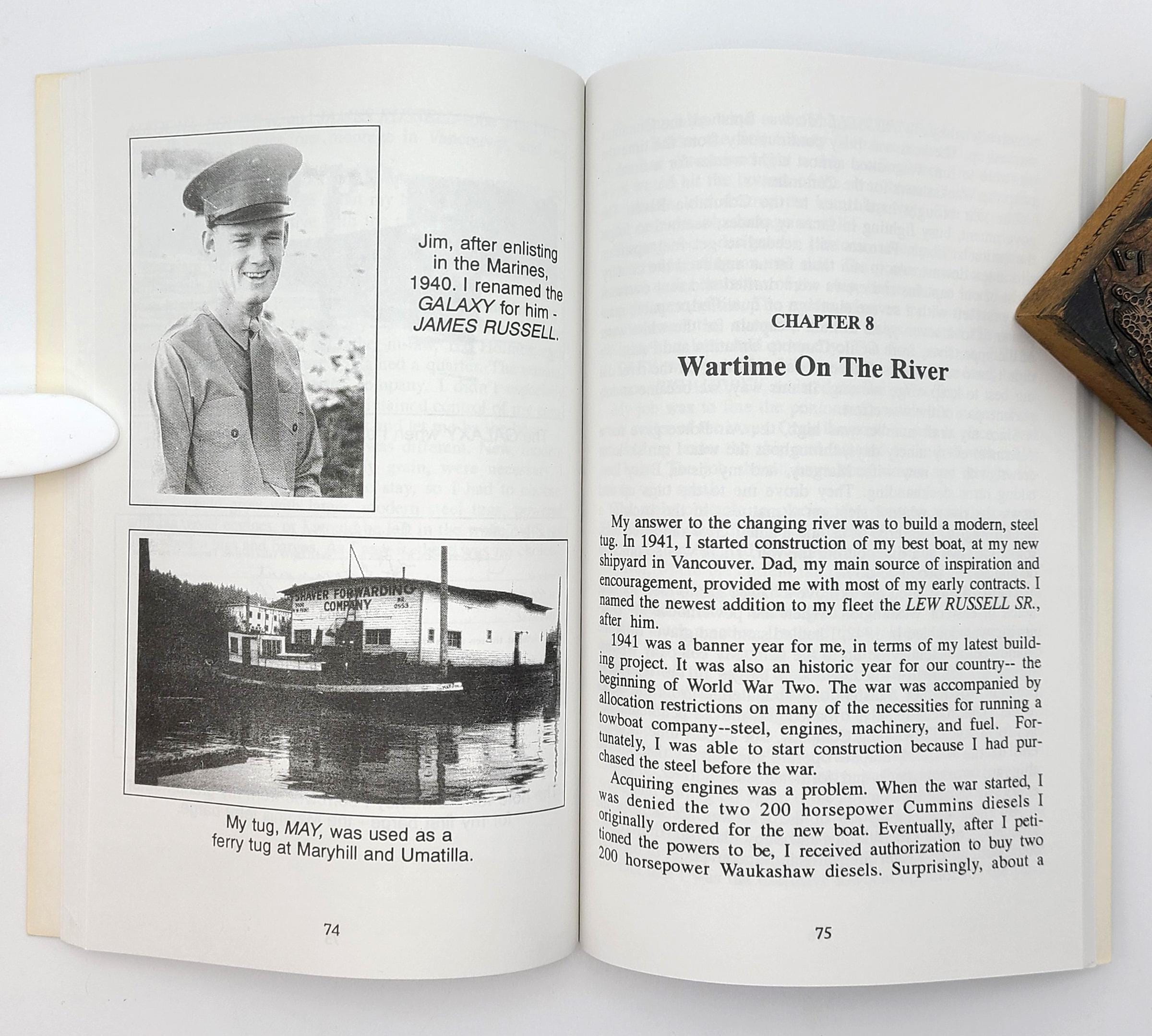As the foreword says, ''this is the story of Captain Russell's most interesting and exciting adventures, struggles, triumphs, and historic achievements... As a young boy, he experienced the wild river before the dams,. He watched the end of the steamboat era when new diesel tugs came to the Columbia.''