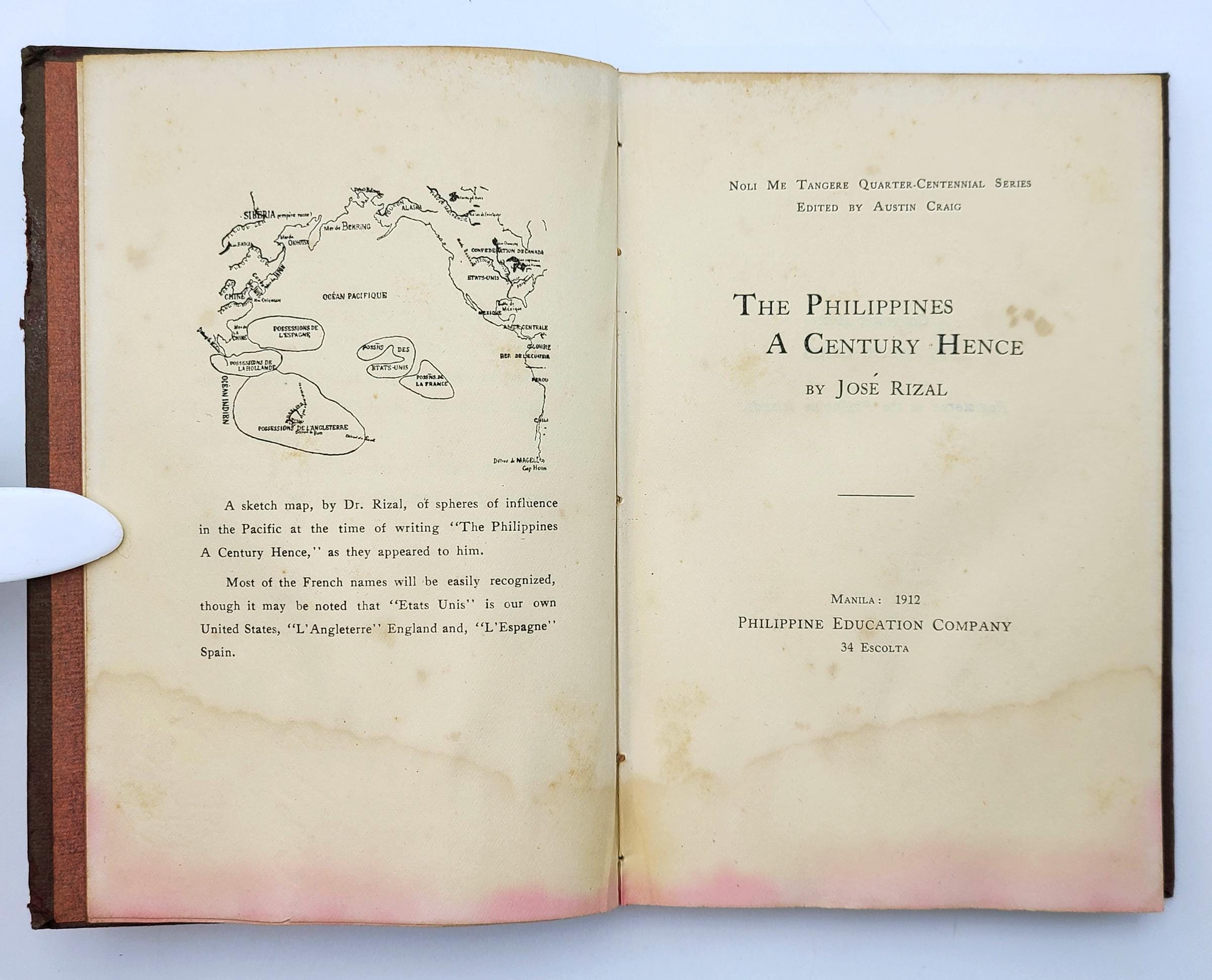 The volume includes supplemental material, including Austin Craig's introduction, F. Jagor's prophecy which prompted Rizal's Policy of Preparation for the Philippines, Rizal's December 1896 Farewell Address, Additions to My Defence: Rizal's statement before the court martial, Rizal's brief remarks about the rebellion from his penciled notes used for his speech, and Rizal's sketched map (the frontispiece illustration) showing the spheres of influence in the Pacific at the time of writing his essay.