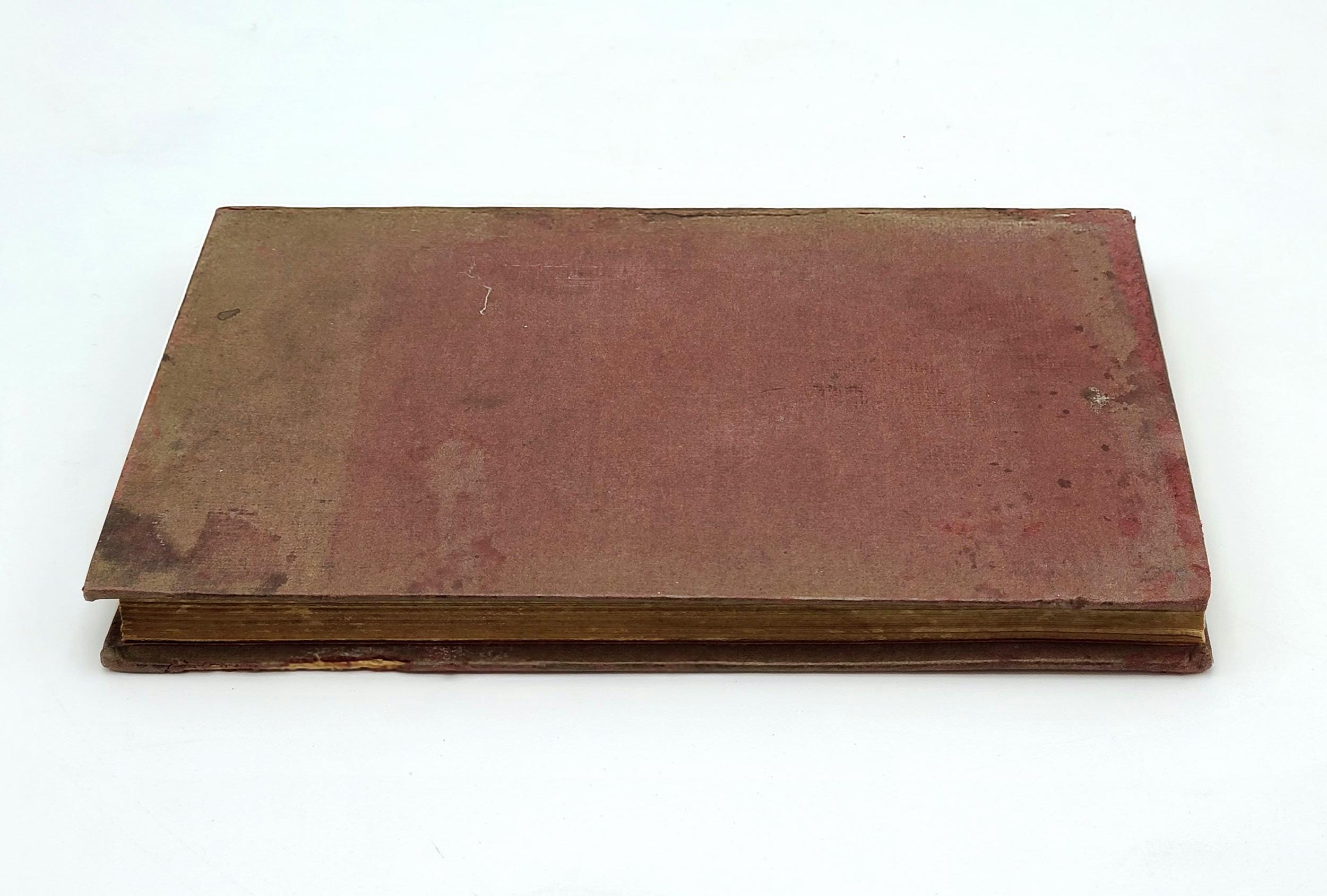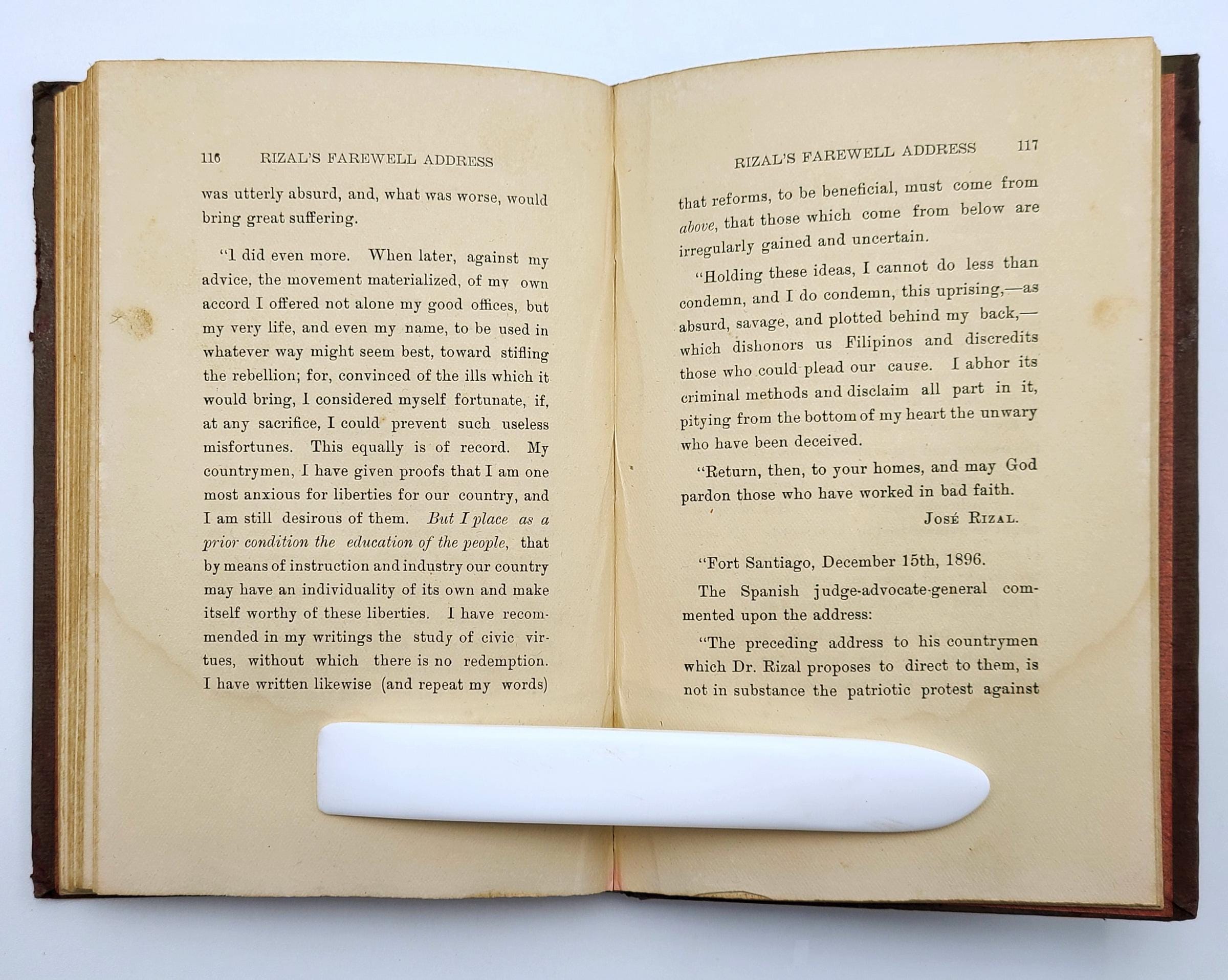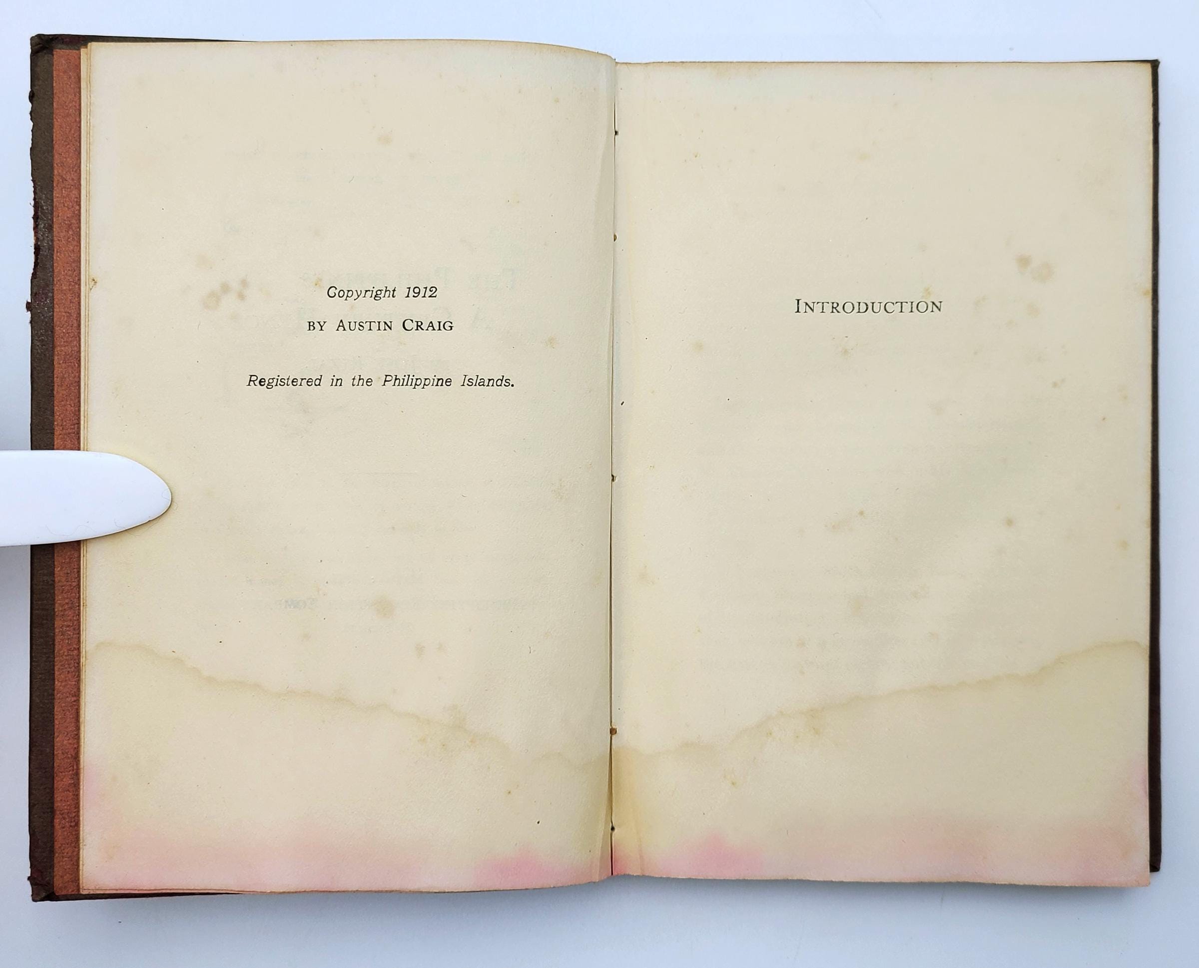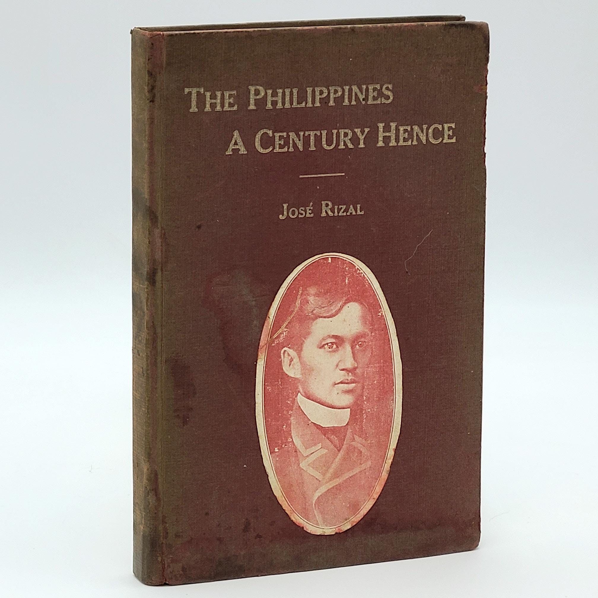 Description: Maroon cloth over boards. Paste-on portrait of Rizal on front cover. Covers show fading, general soiling, and wear along the fore-edges. Poetic quotations printed on endpapers. Bottom margin damp-stain and tide mark appear throughout volume. Penciled price in upper corner of front free endpaper, else unmarked. Illustrated frontispiece. 136 pages. 7 x5 inches.