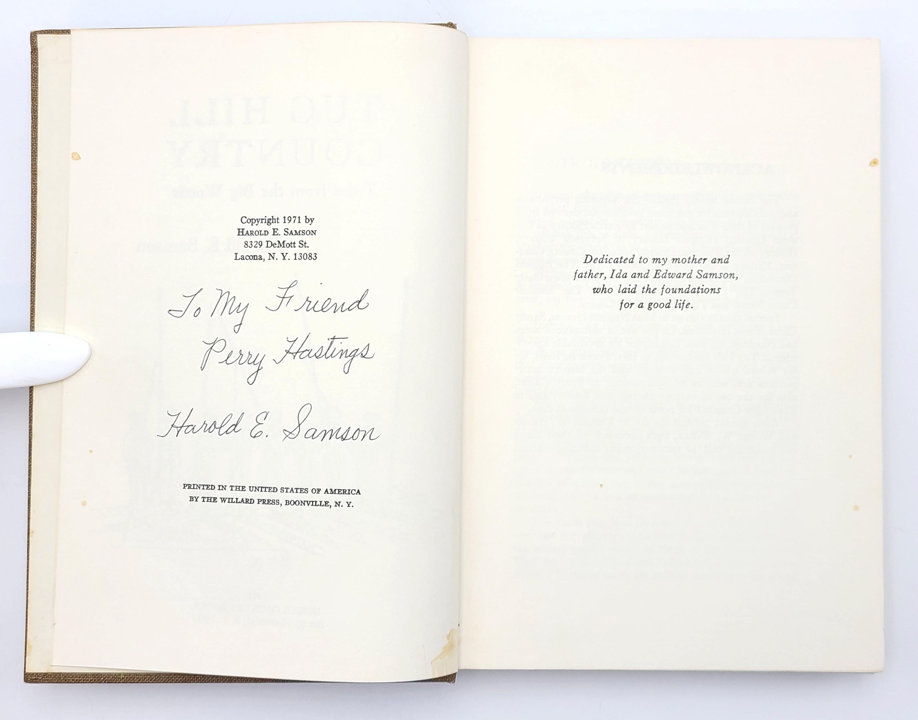 The author Harold E. Samson (1908-1977) was also a life-long resident of the Tug Hill region. His second book, The Other Side of the Hill: More Tug Hill Tales, was published in 1974.