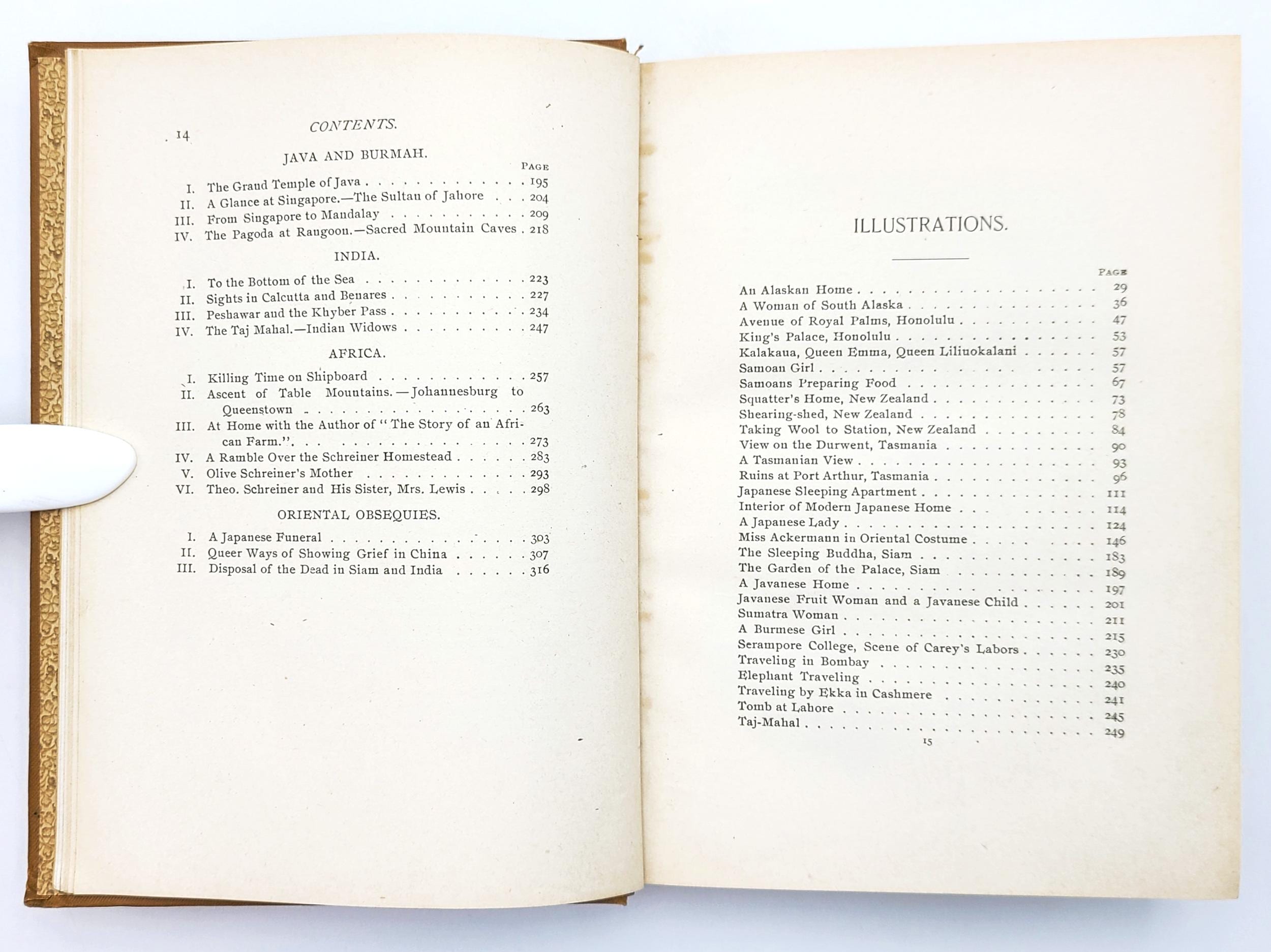 Jessie A. Ackermann's record of eight years, 1888-1895, of world travel as a WCTU missionary, paying particular attention to her impressions of women's social position in each country visited. She records her observations from Alaska, the Sandwich Islands (Hawaii), New Zealand and Tasmania, Japan, China, Siam (Thailand), Java, Burma, and South Africa. She includes a detailed account of her visit to the home of the South African author, Olive Schreiner. Most of the papers comprised in this book appeared in the Ladies's Home Companion during the year 1895.
