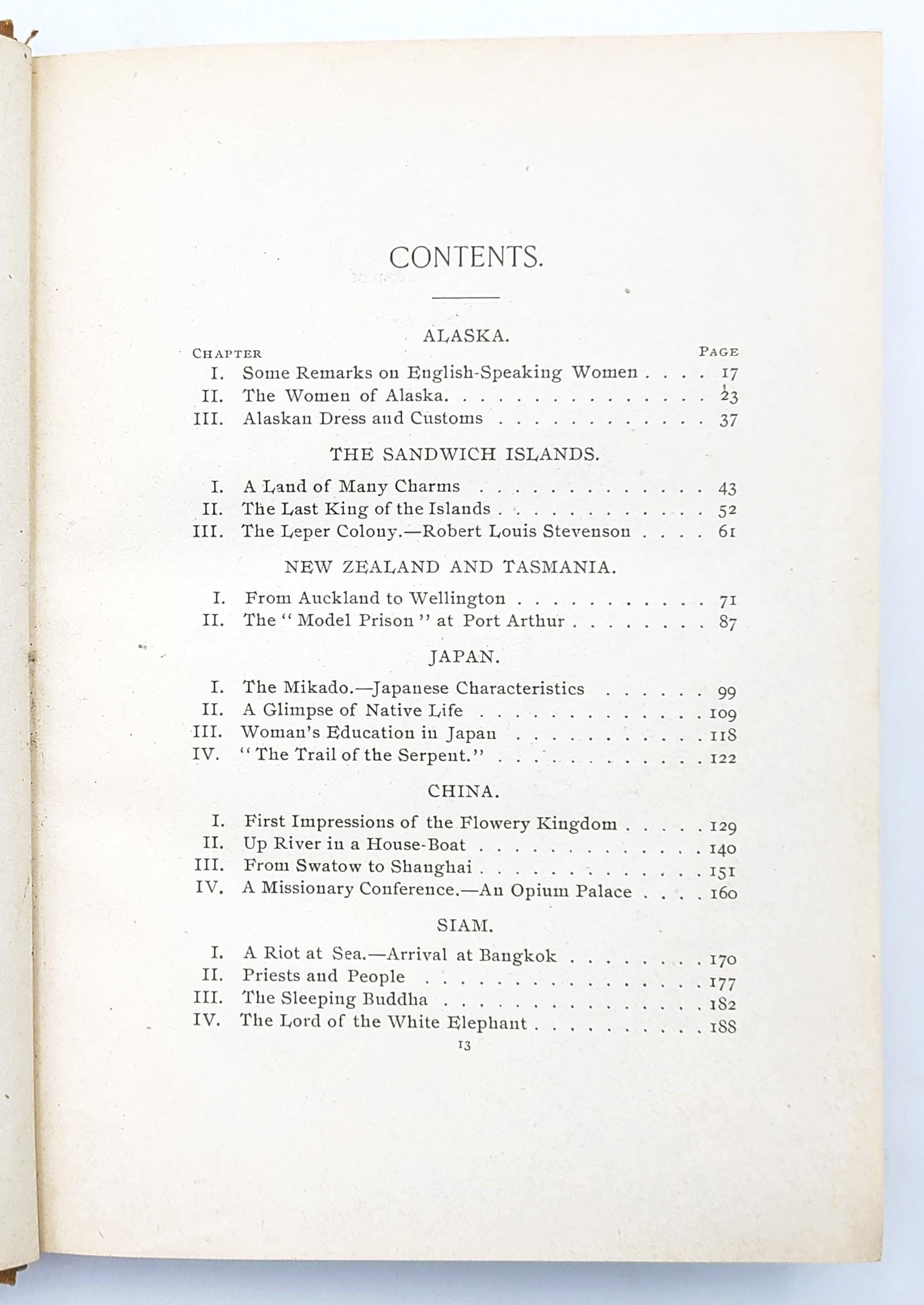 Keywords: travelogue, travel, voyages, around the world, WCTU, Women's Christian Temperance Union, missionary, missionaries, Asia, reformers, Alaska, Sandwich Islands, Hawaii, New Zealand, Tasmania, Japan, China, Siam, Thailand, Java, Burma, South Africa, Olive Schreiner,