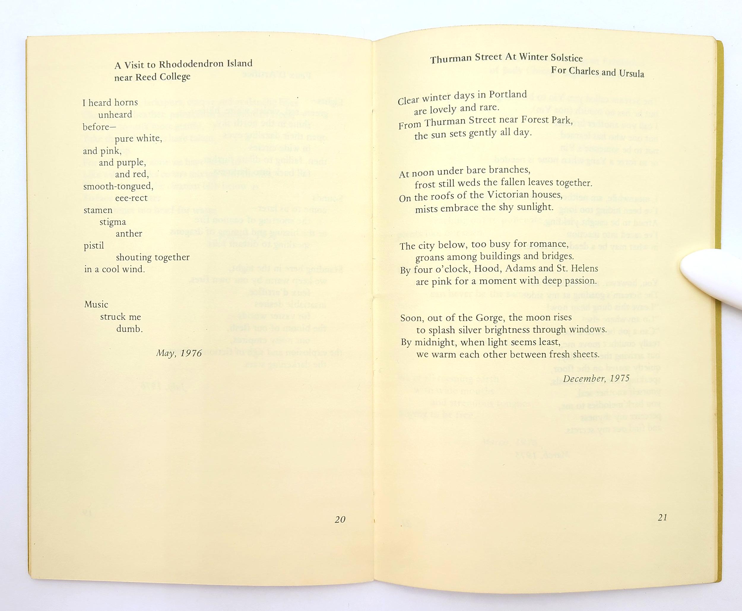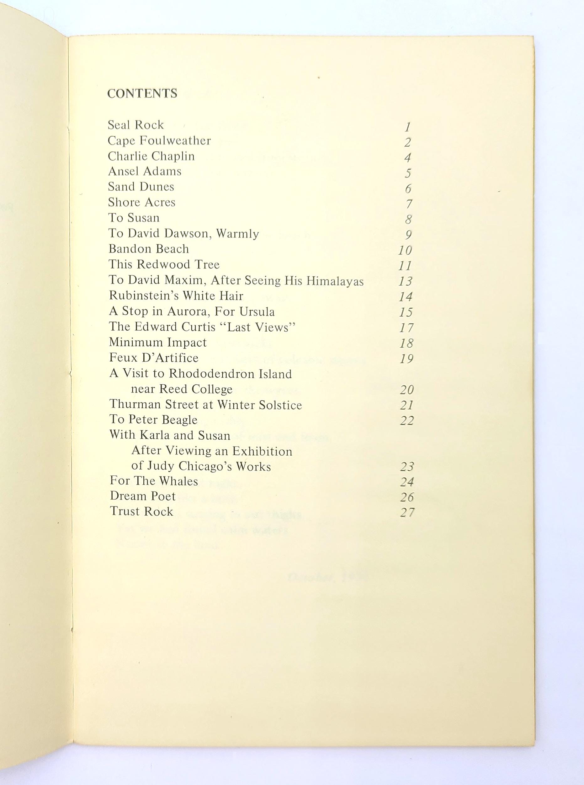 Includes poems inspired by various locations in Oregon (Aurora; Portland's Crystal Springs Rhododendron Garden and Thurston Street; the Oregon coast, including Shore Acres, Cape Foulweather, Seal Rock, the sand dunes, Bandon), as well as poems for Ansel Adams, Peter Beagle, Edward Curtis, Charlie Chaplin, David Maxim, Arthur Rubinstein and Judy Chicago.