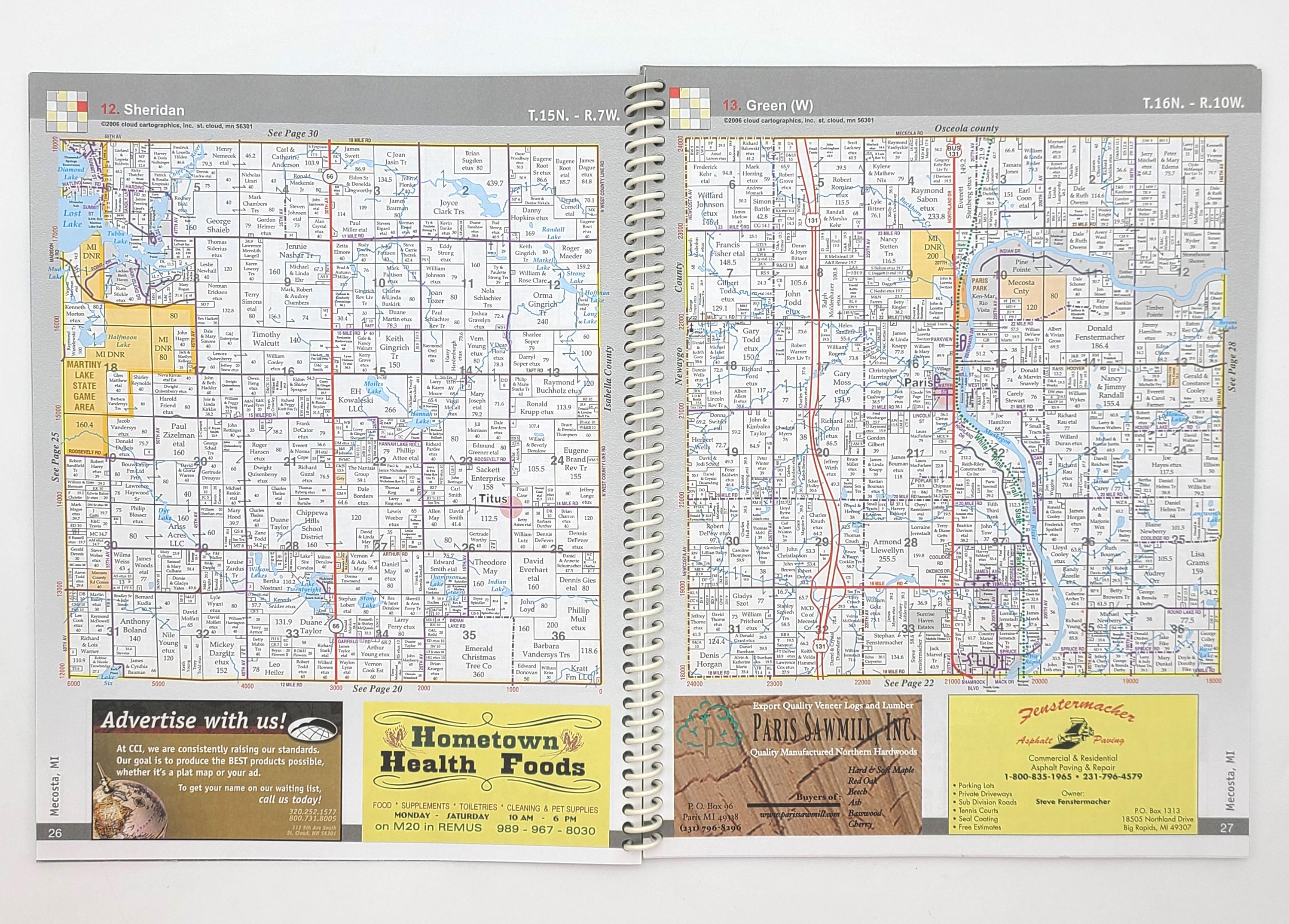 Consisting primarily of property ownership maps for the 16 townships of Mecosta County, but also includes city maps without property information (Barryton, Big Rapids, Mecosta, Morley, Remus, Stanwood), and several specialty maps (depth maps for 6 lakes, county school district, soil boundary, voting district, and highway maps).