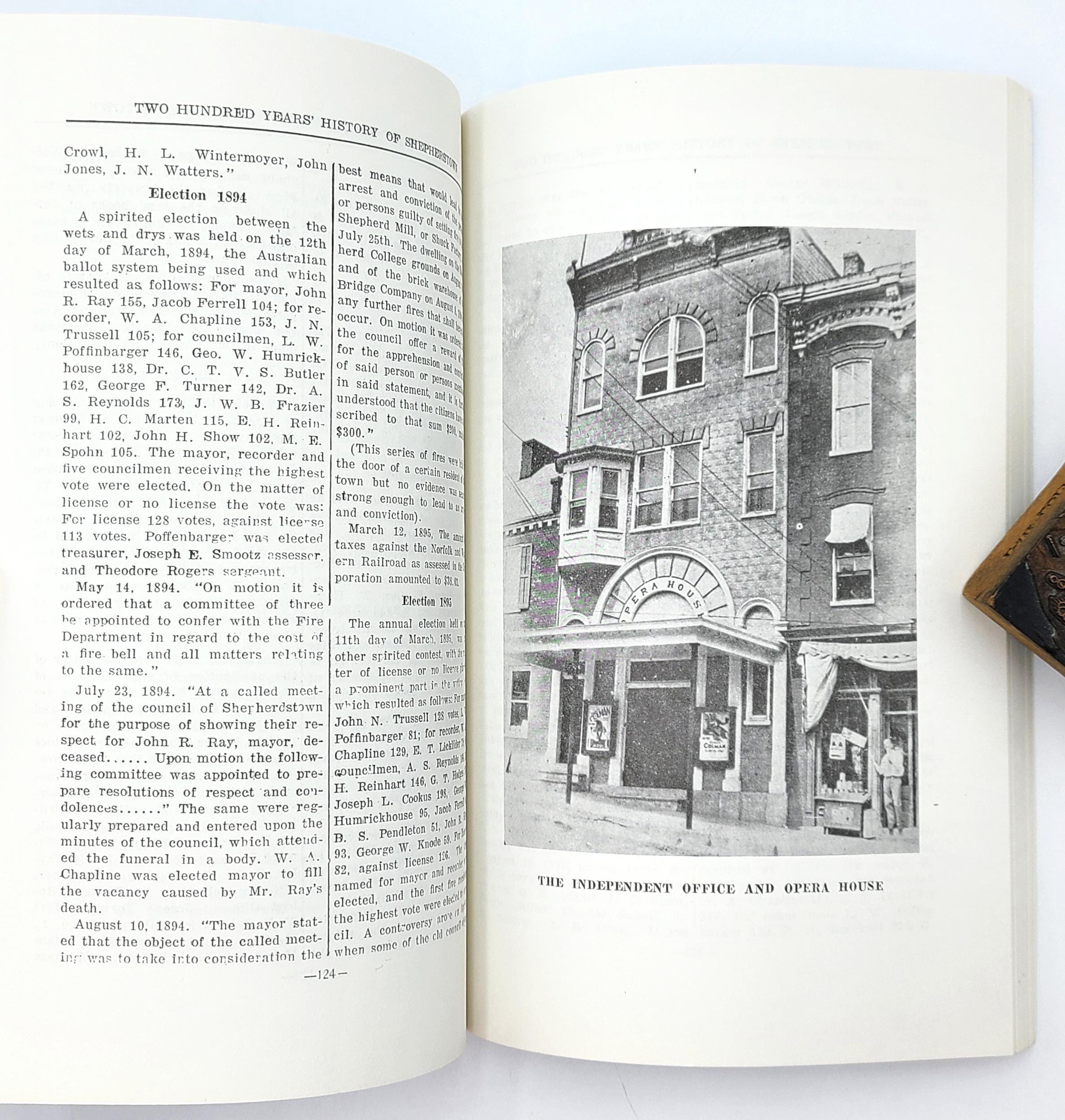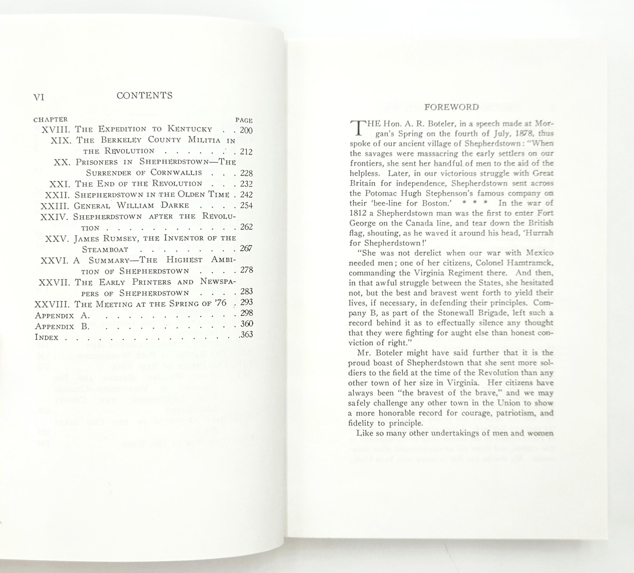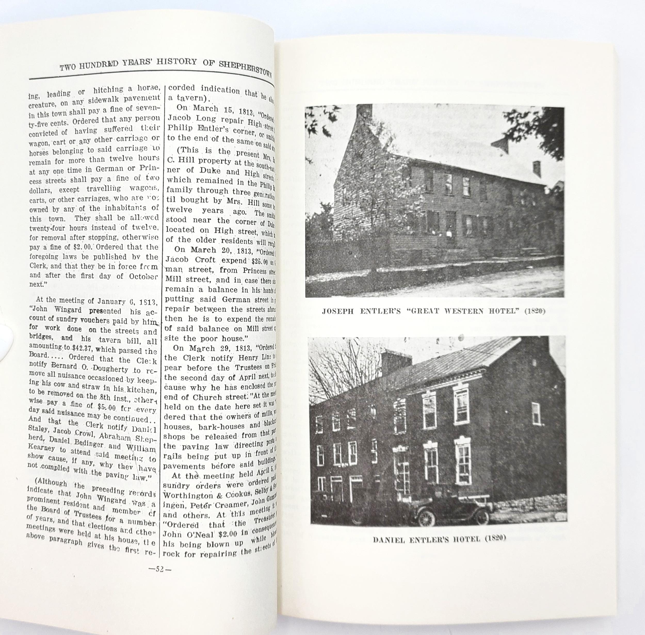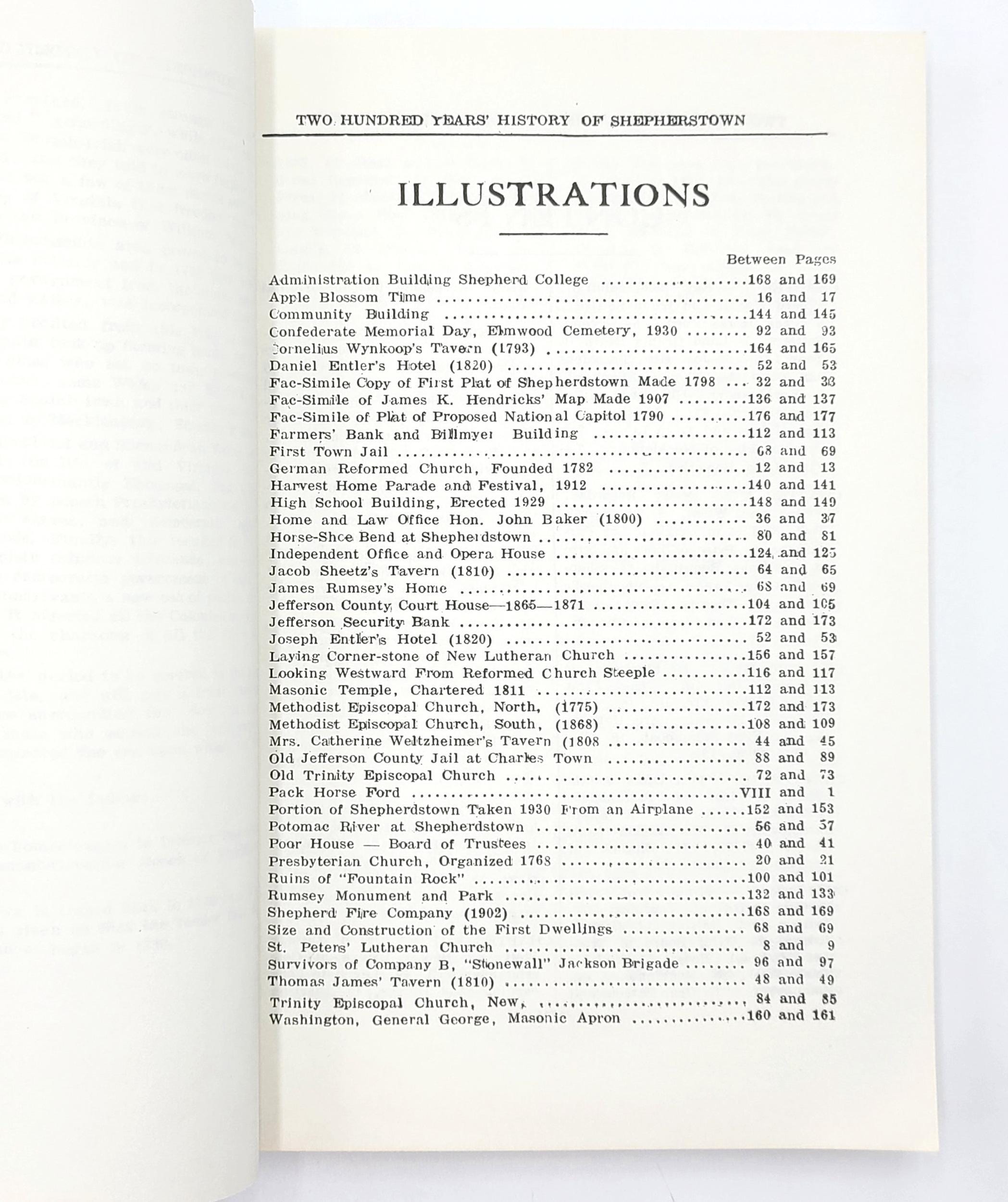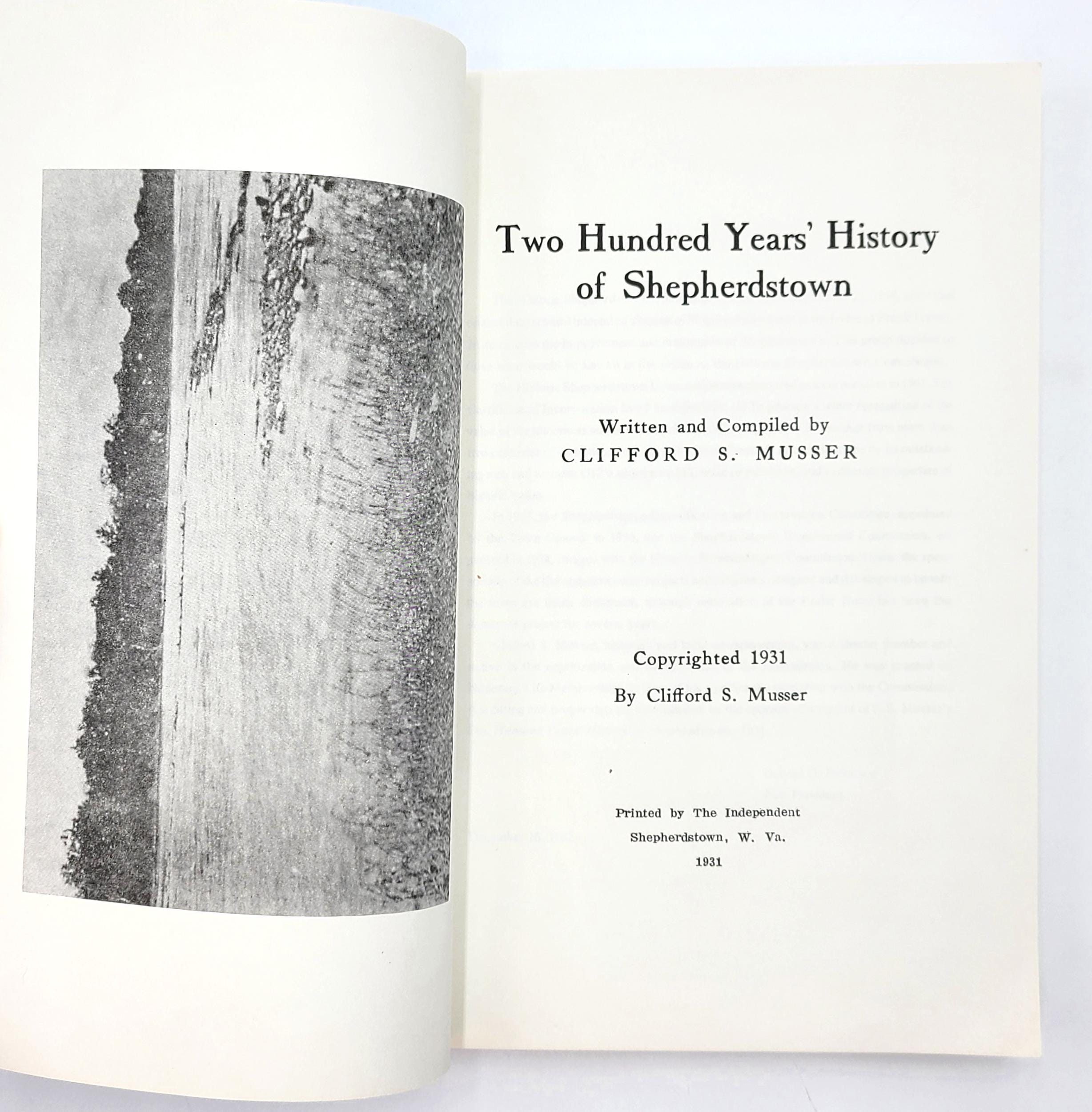 1) Two Hundred Years' History of Shepherdstown [1730-1931] by Clifford D. Musser. Originally published in 1931, this is the first reprint of 1982 issued by the Historic Shepherdstown Commission. Covers show light handling and some minor soiling. Interior is clean and unmarked. 44 illustrations, including 3 fold-out maps. Includes index. viii + 199 pages.