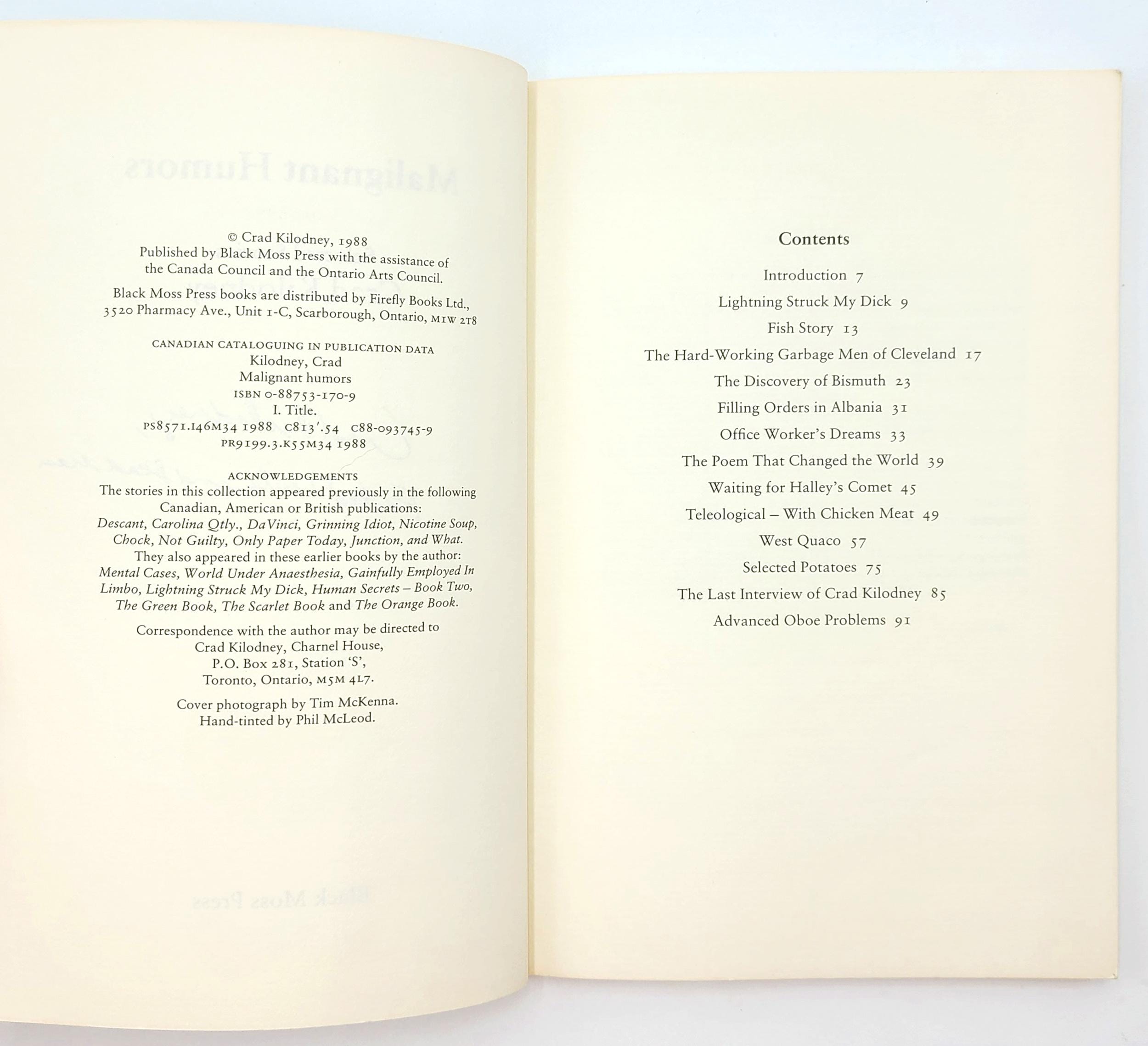 13 stories by the American-born Canadian writer Crad Kilodney (1948-2014) who lived in Toronto, Ontario. He was best known for selling his self-published books on the streets of the city between about 1978 and 1995. Malignant Humors is a collection of some of the best stories from Kilodney's older out-of-print private editions.