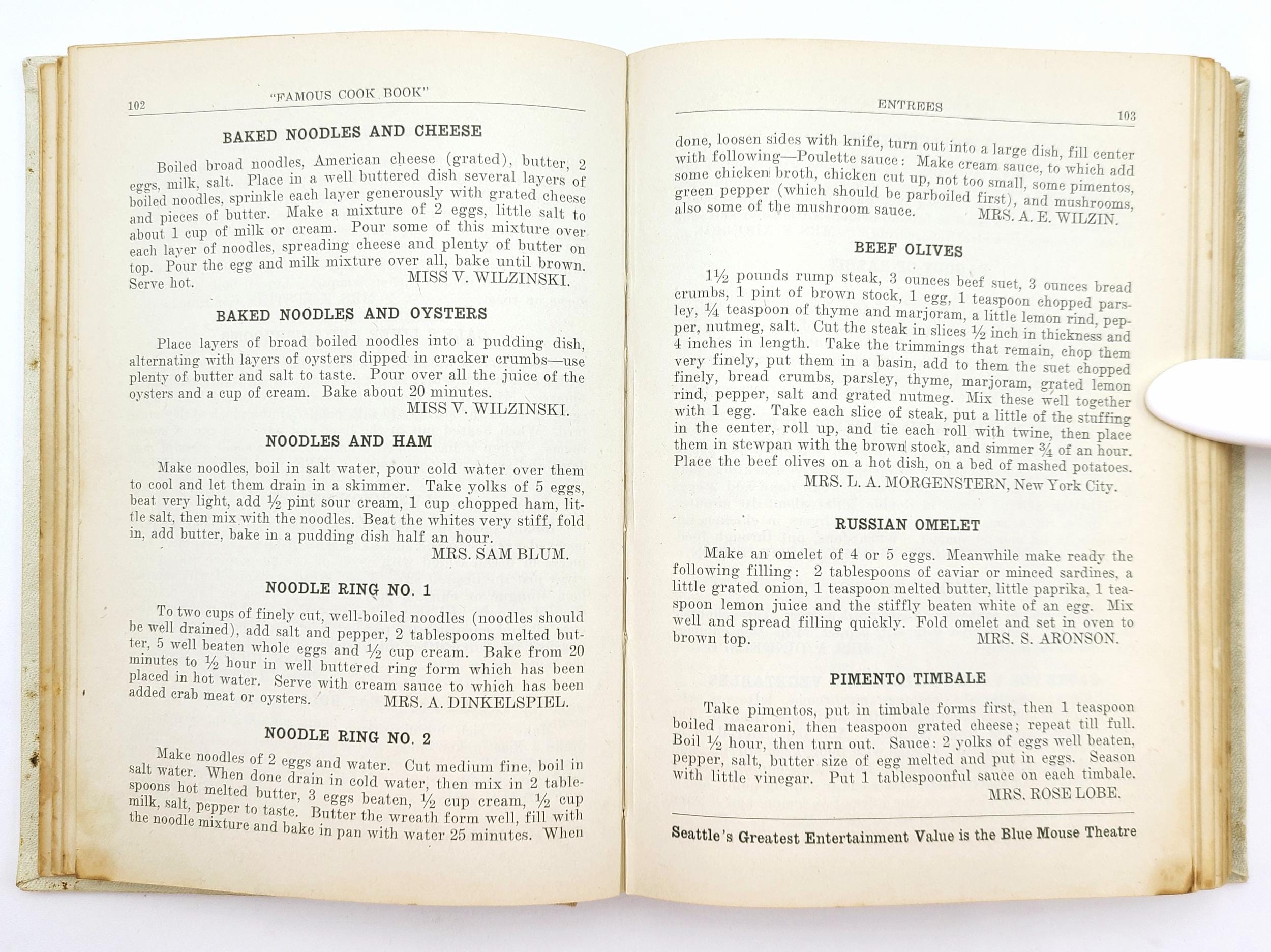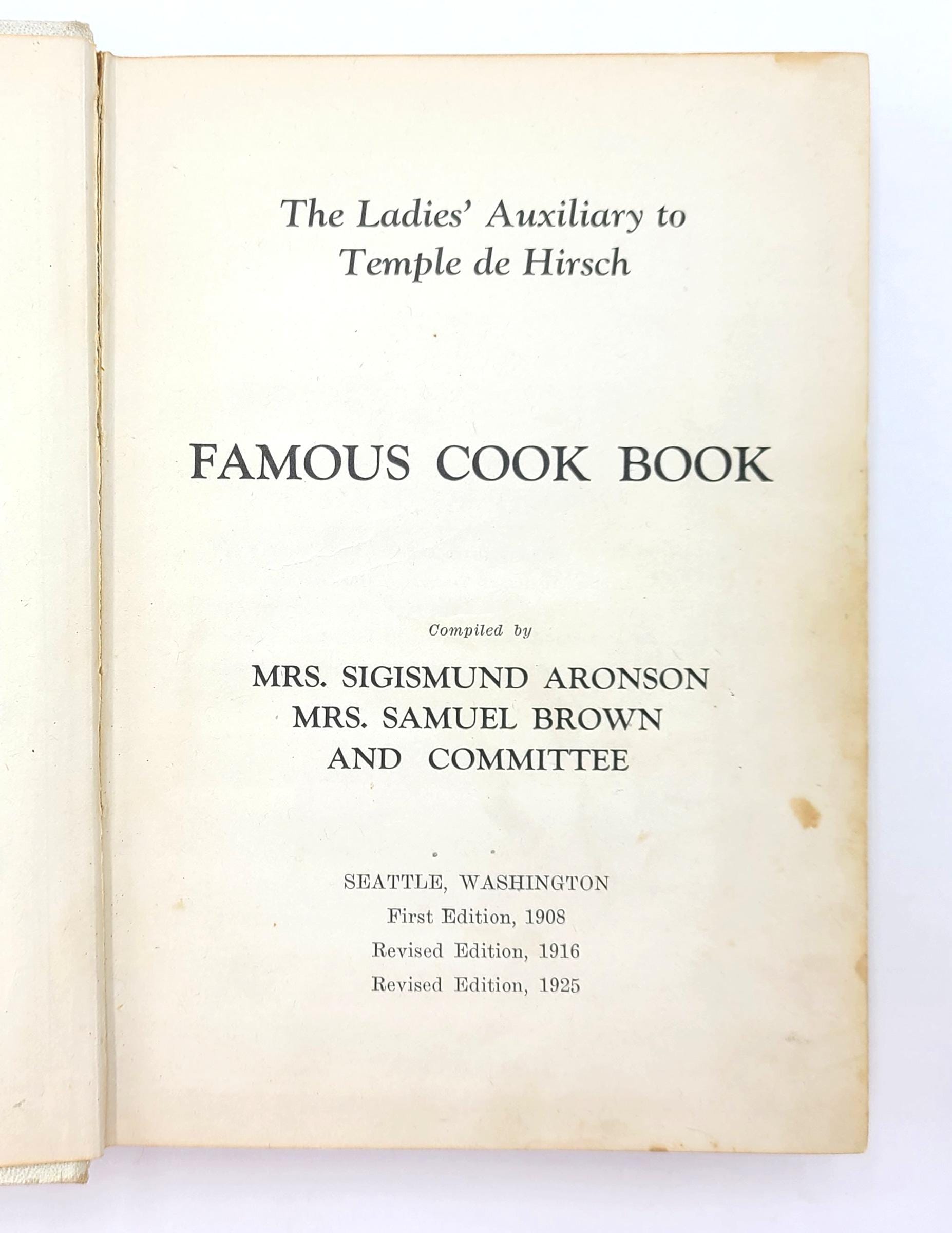 The Ladies' Auxiliary to Temple de Hirsch, Seattle, Washington, published its first cookbook in 1908. A second edition was issued in 1916. This, the third edition from 1925, according to the preface, ''retained the best recipes of the previous two editions adding many new and tried recipes.''
