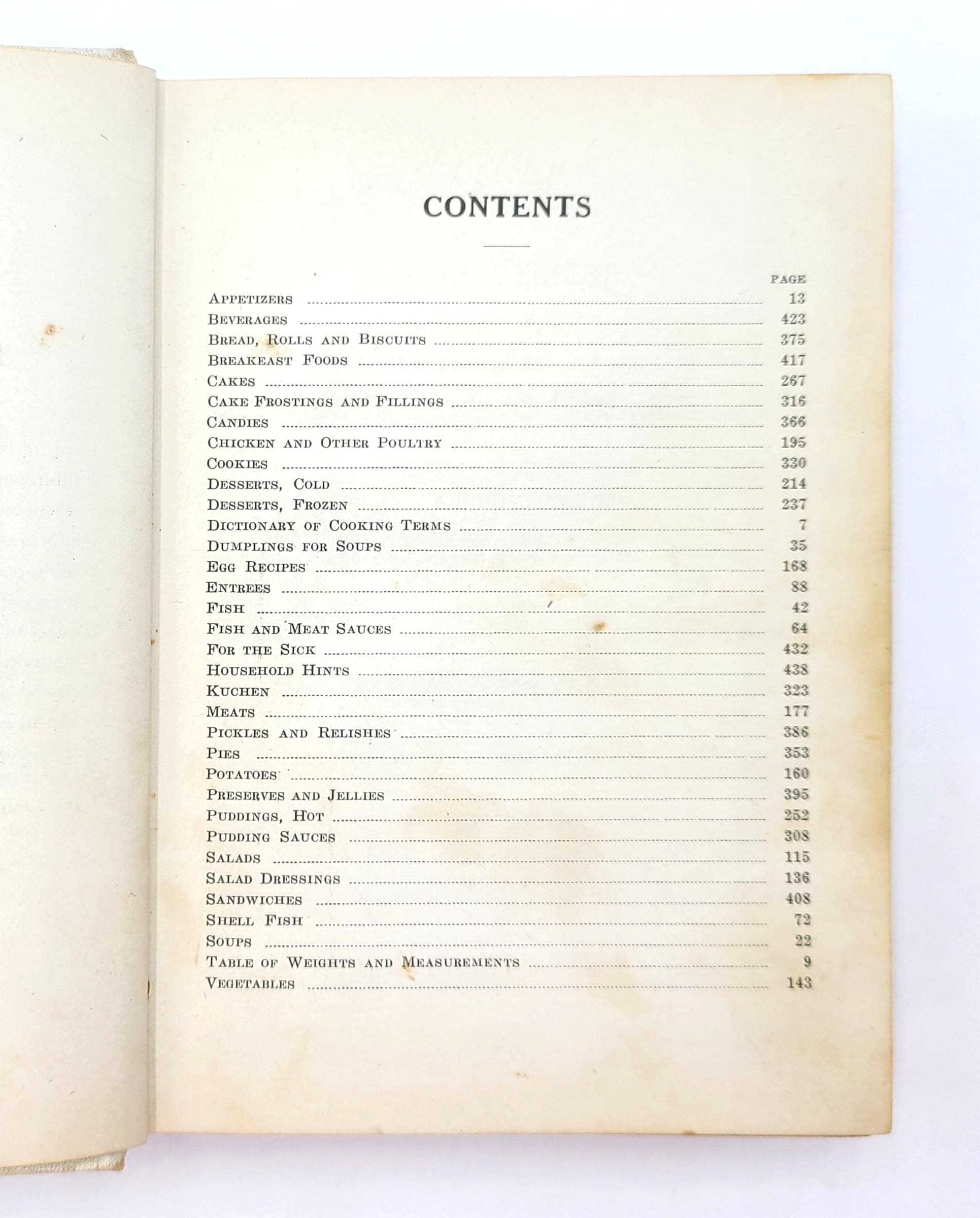 Also included are: Dictionary of Cooking Terms, Table of Weights and Measurements, For the Sick, and Household Hints.