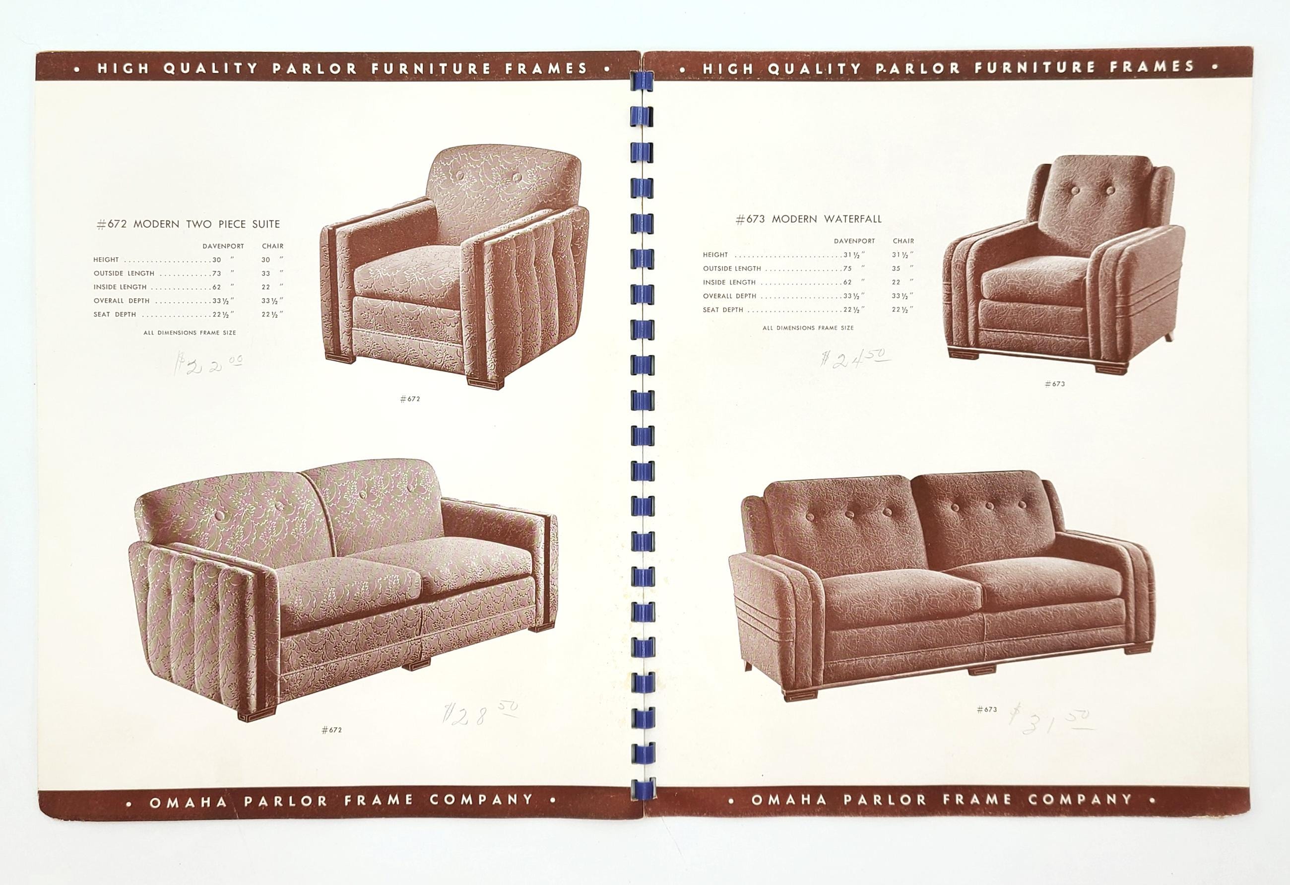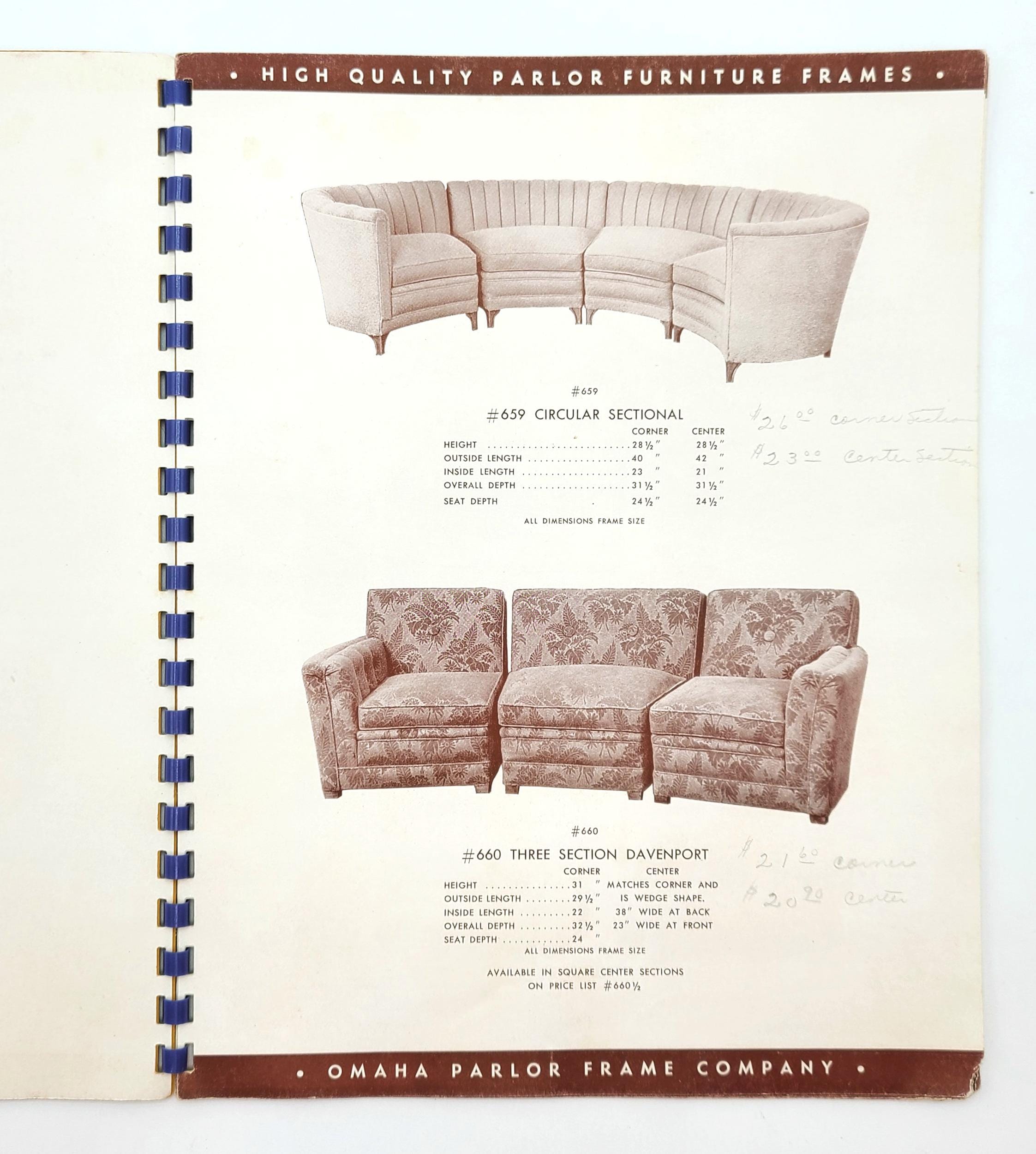 Fully illustrated mid-century furniture frame catalog. Shows a variety of upholstered davenports or sectionals, chairs, and combo sets, as well as a rocker and an ottoman or two. The various styles include lounge, circular, fireside, lawson, kidney, modern, and waterfall. Prices for each are penciled in (e. g. Lounge Chair $24.90 with matching Ottoman $10.90). Each unit is provided with frame dimension measurements.