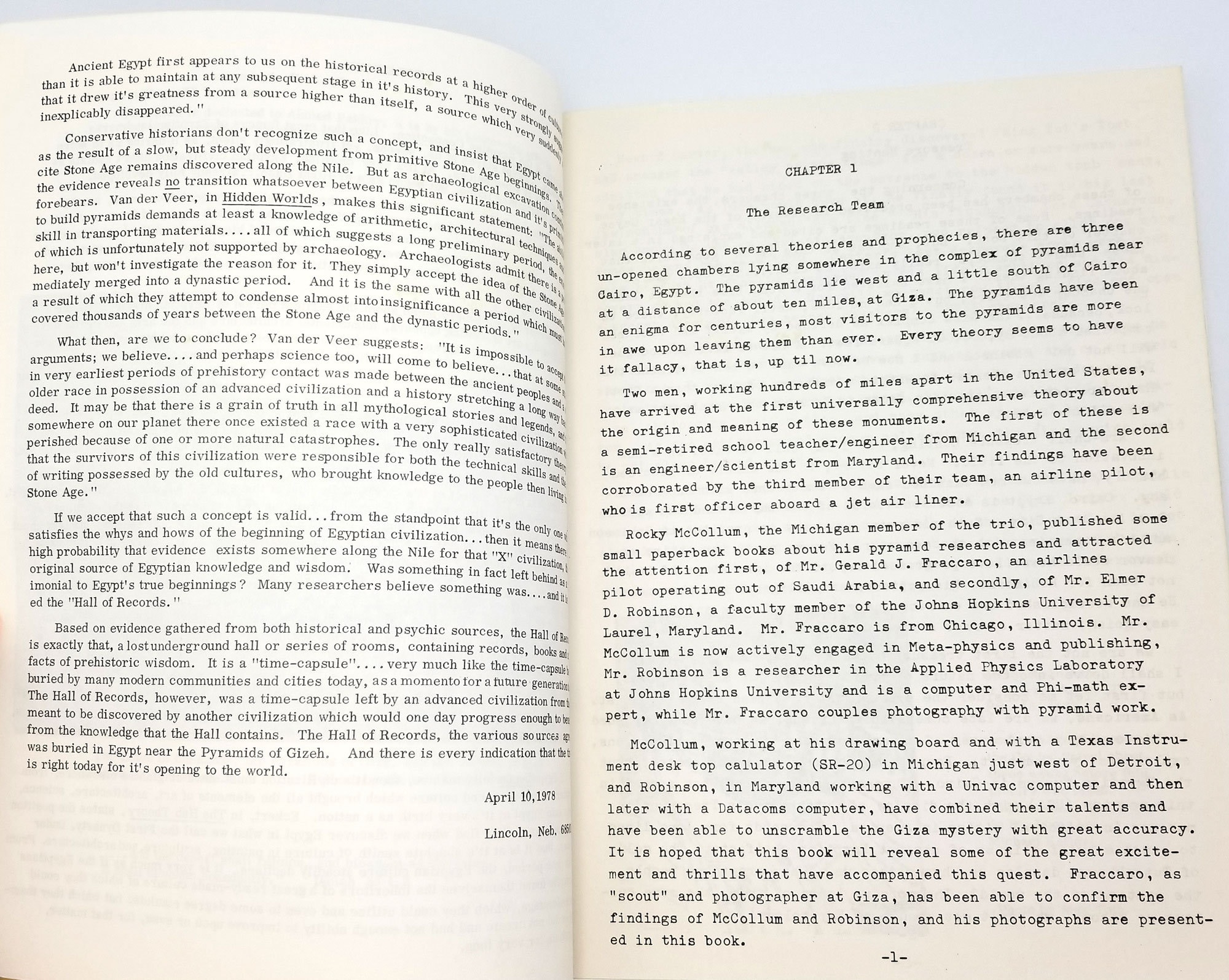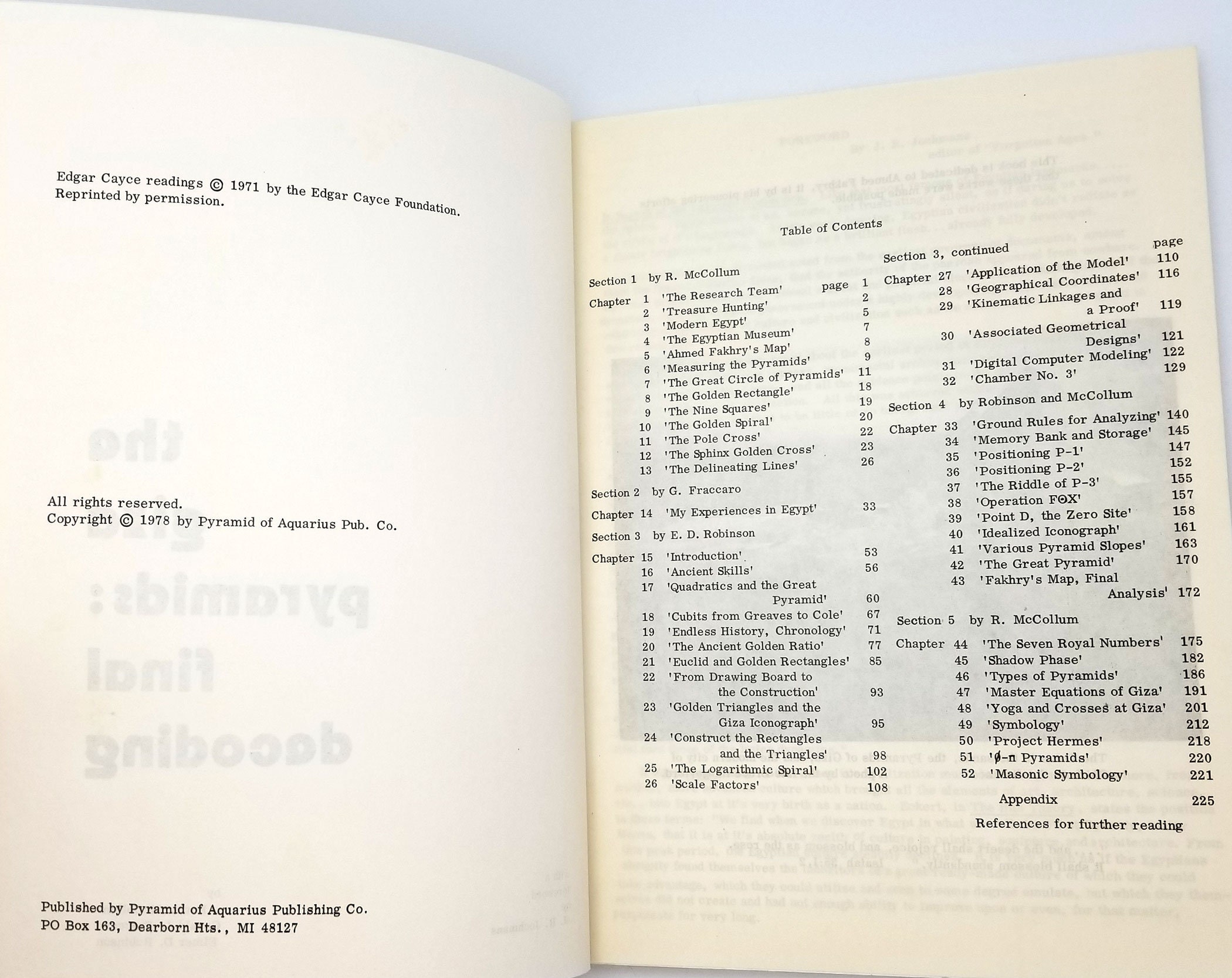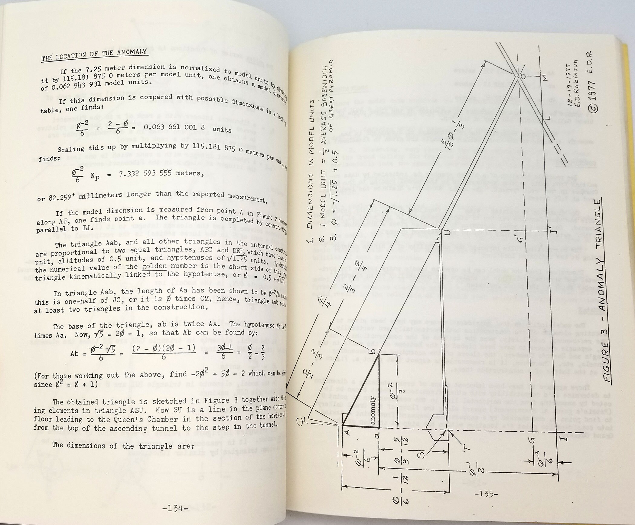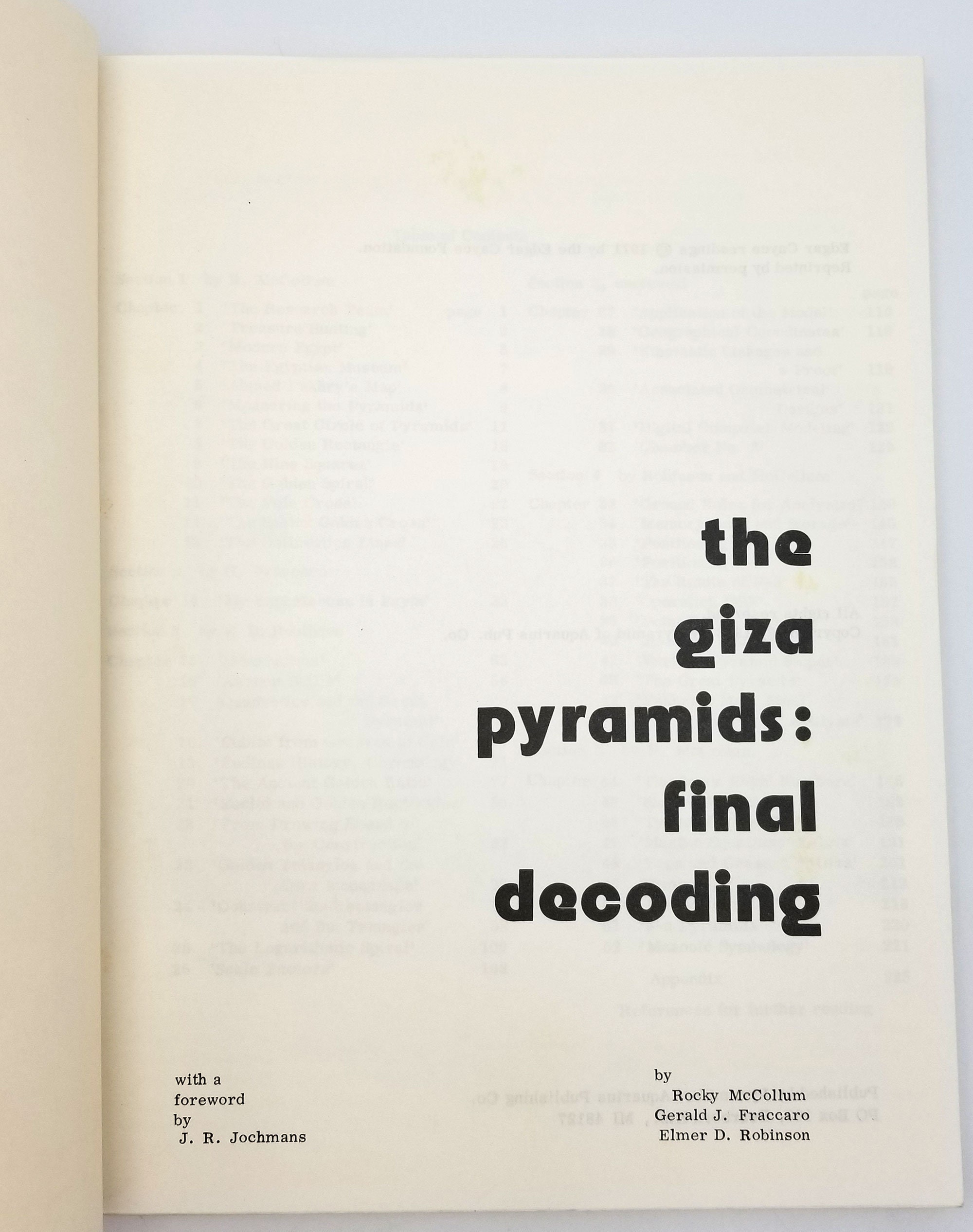 Foreword by J. R. Jochmans. Authors are pyramid researchers Rocky McCollum (of Michigan), Gerald J. Fraccaro (a Chicago airline pilot operating out of Saudi Arabia and the first person to have photographed the pyramid of Mycerinus (Menkhure) in the shadow or equinoctal phase, taken during the autumnal equinox of 1977), and Elmer Davis Robinson (1921-1991, a computer analyst and researcher at the Johns Hopkins Applied Physics Laboratory).